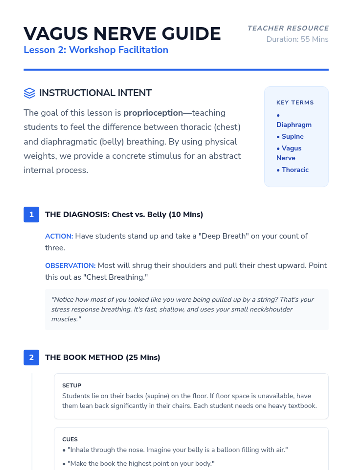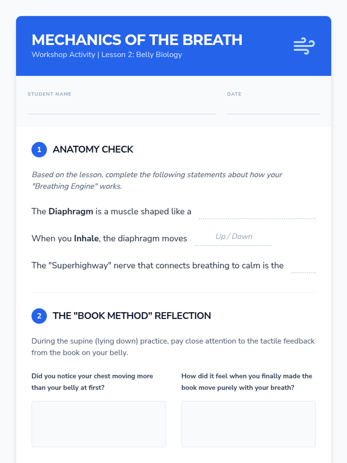 This workshop focuses on correcting shallow thoracic breathing by teaching deep diaphragmatic breathing. Students practice 'belly breathing' using light weights (books) on their abdomen while lying supine to receive tactile feedback on their breath depth. The lesson connects this breathing style to stimulating the vagus nerve to trigger the relaxation response.