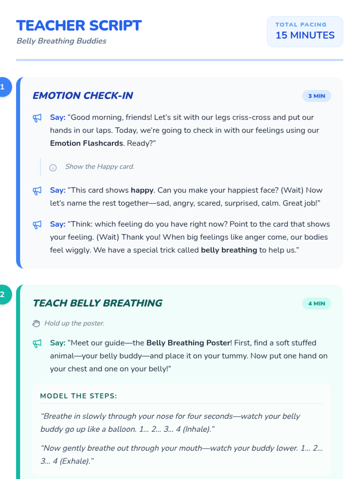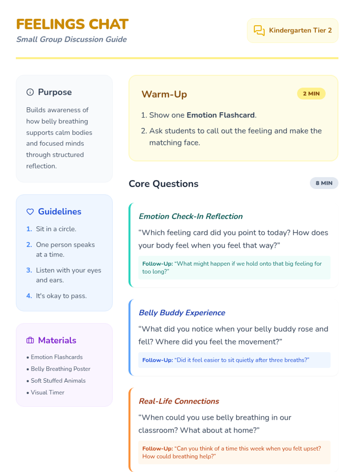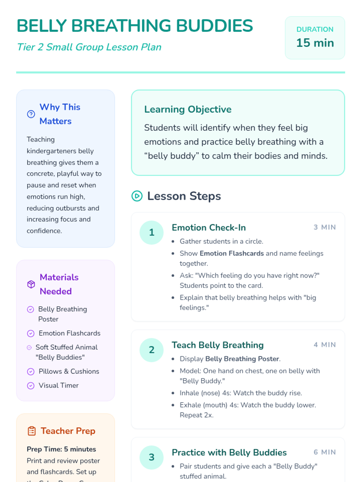 A 15-minute Tier 2 kindergarten lesson focused on self-regulation through belly breathing and the use of 'belly buddies' (stuffed animals) to manage big emotions.