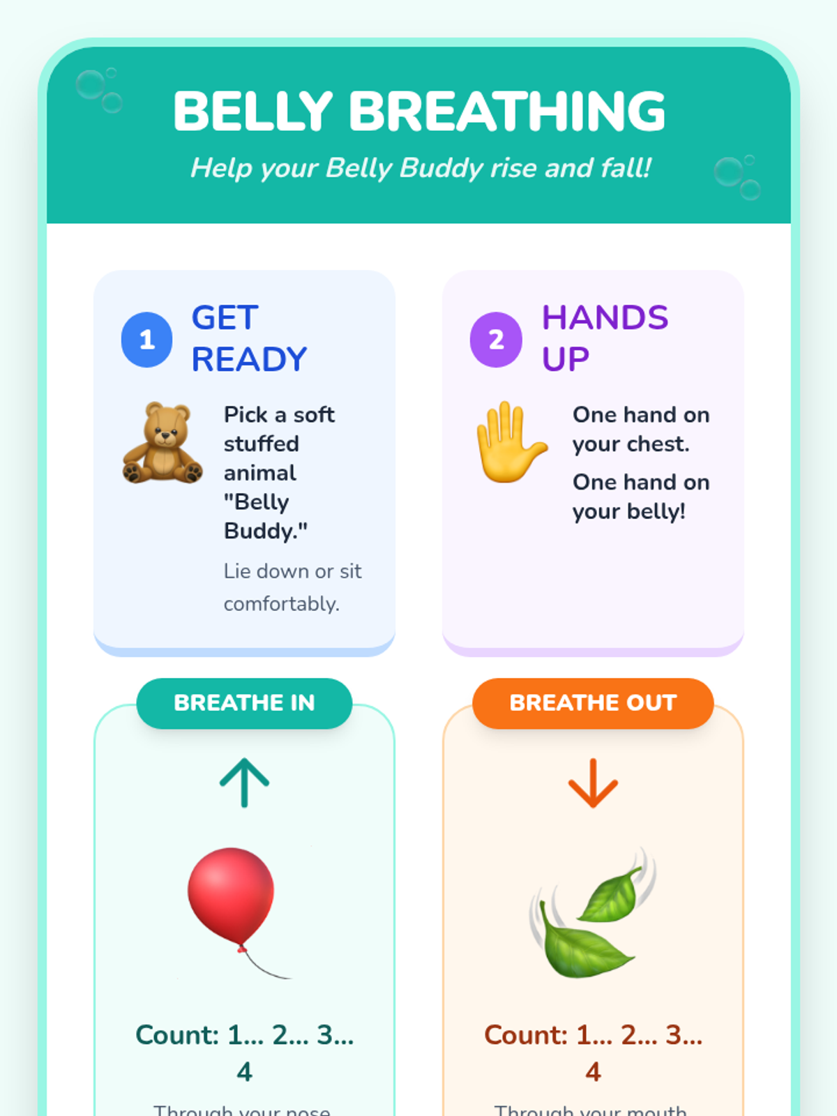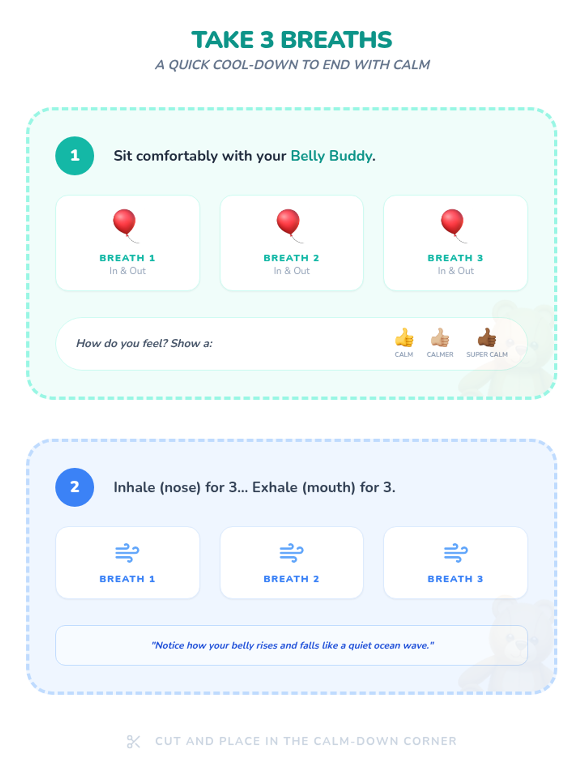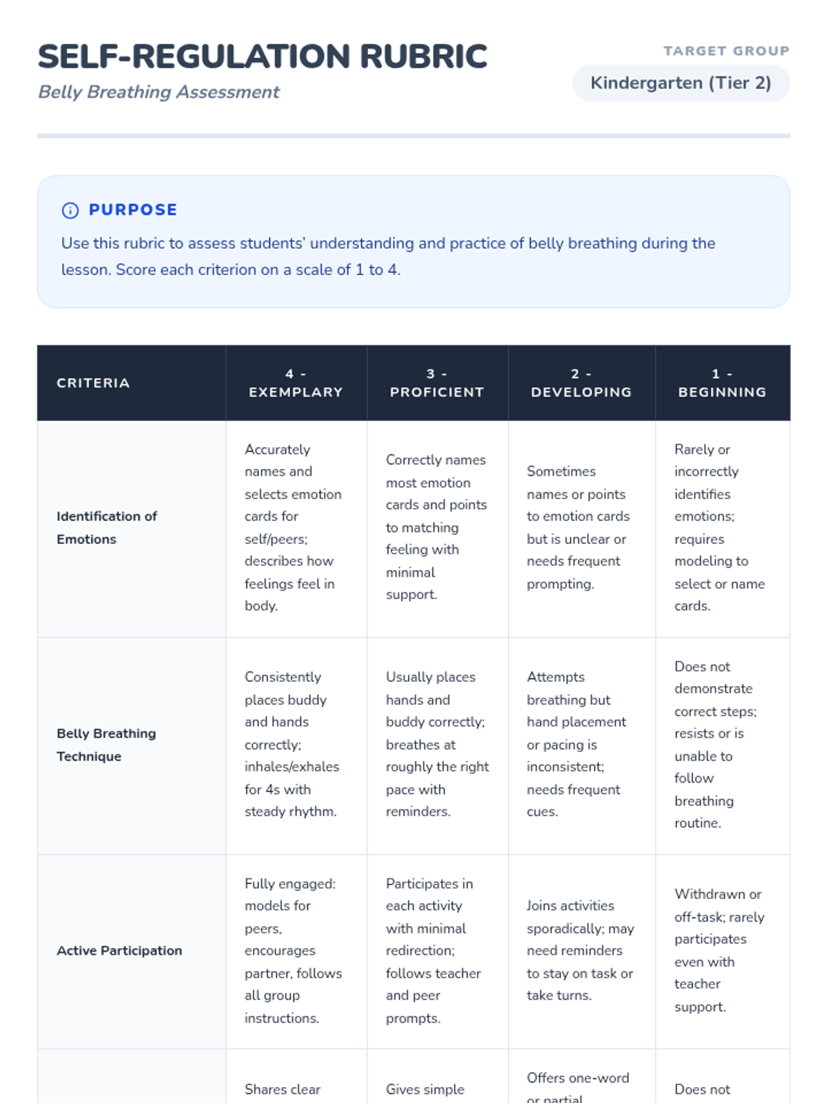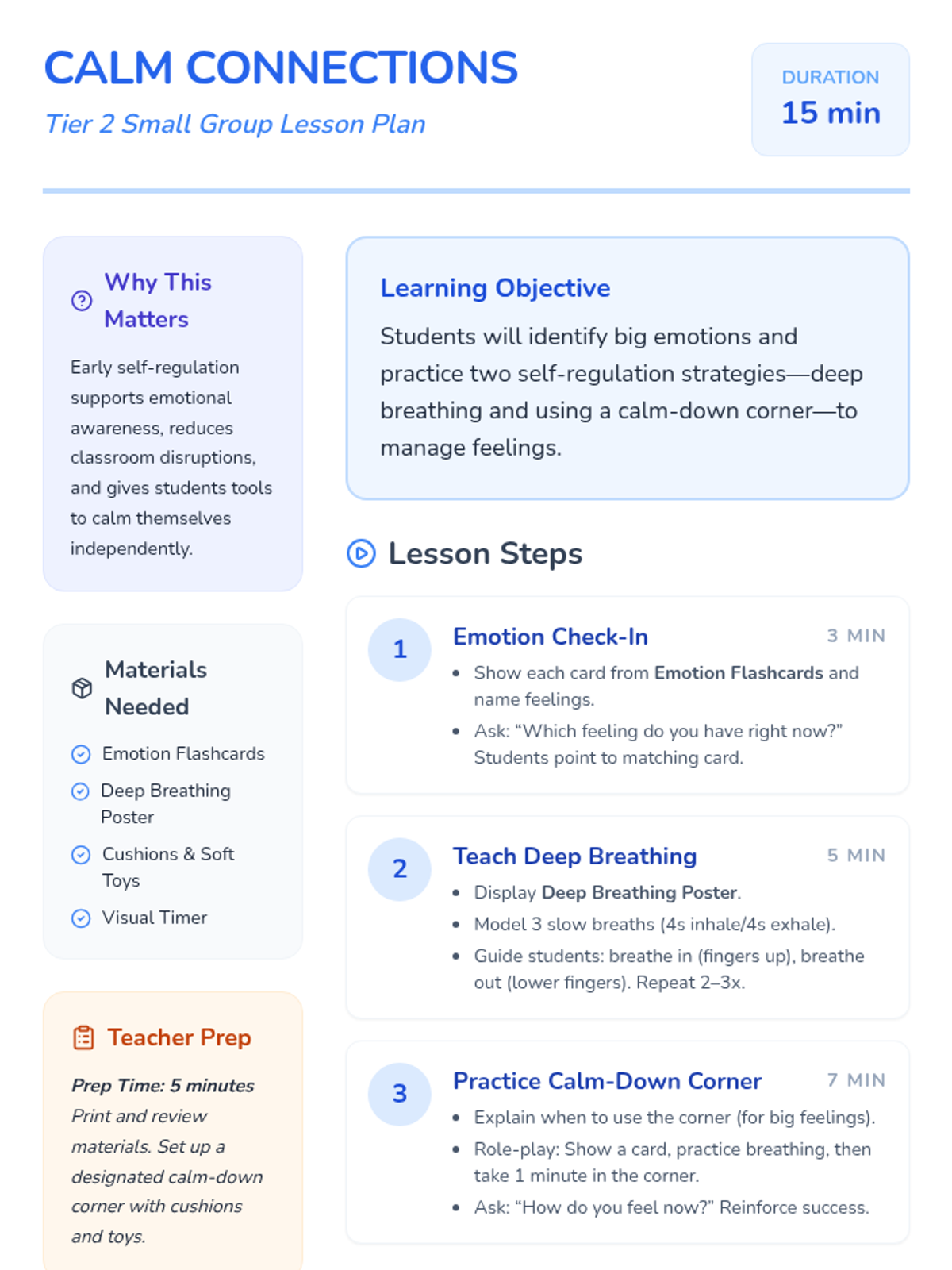 A 15-minute Tier 2 kindergarten lesson focused on self-regulation through belly breathing and the use of 'belly buddies' (stuffed animals) to manage big emotions.