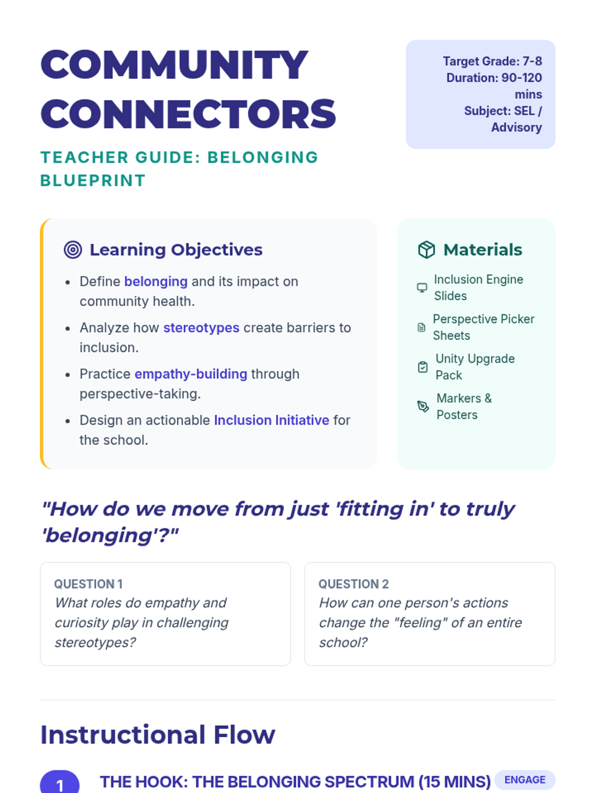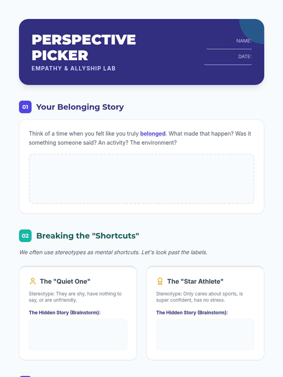 A comprehensive lesson for 7th-8th graders focused on empathy, challenging stereotypes, and active allyship to create a more inclusive school culture.