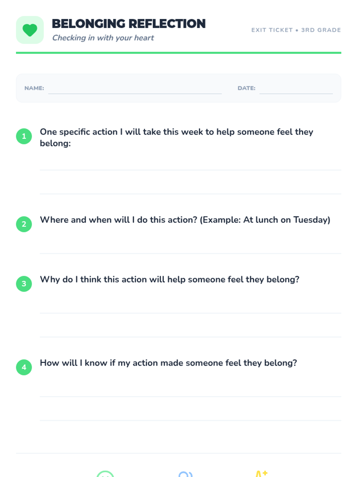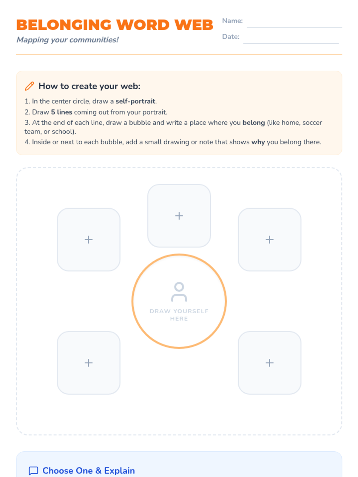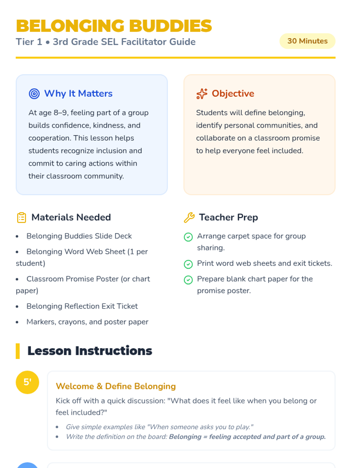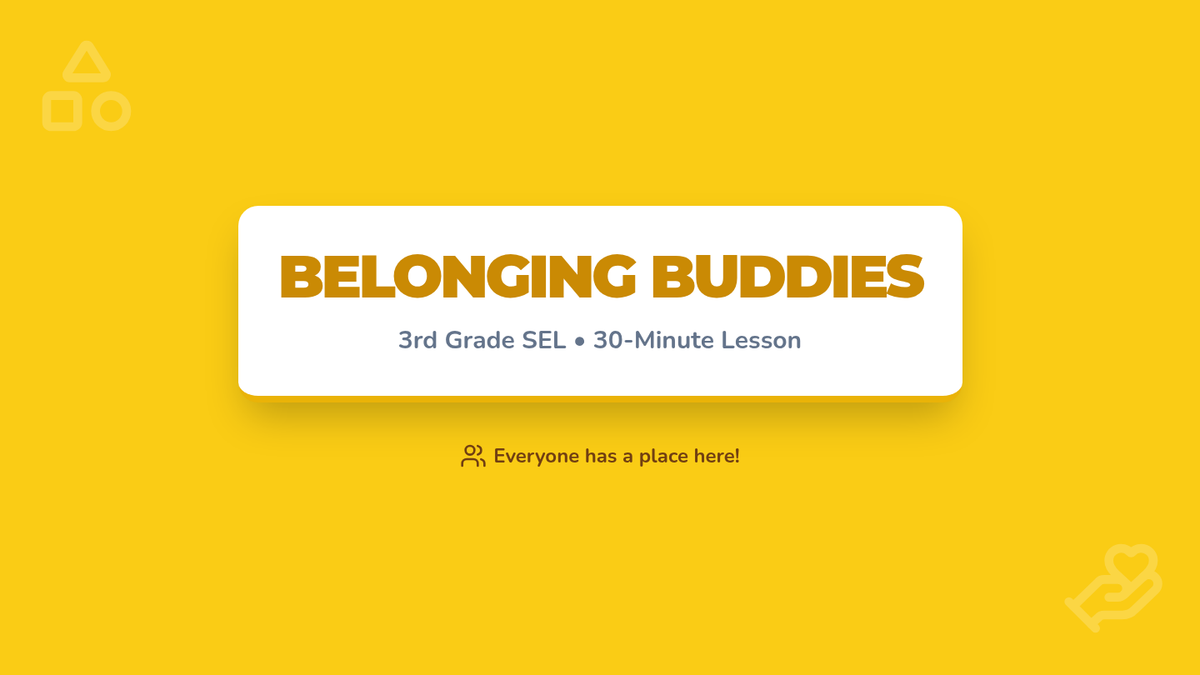 A 30-minute SEL lesson for 3rd graders focused on understanding belonging and inclusion. Students create a personal word web of their communities and collaborate on a class-wide 'promise' to ensure everyone feels like a buddy.