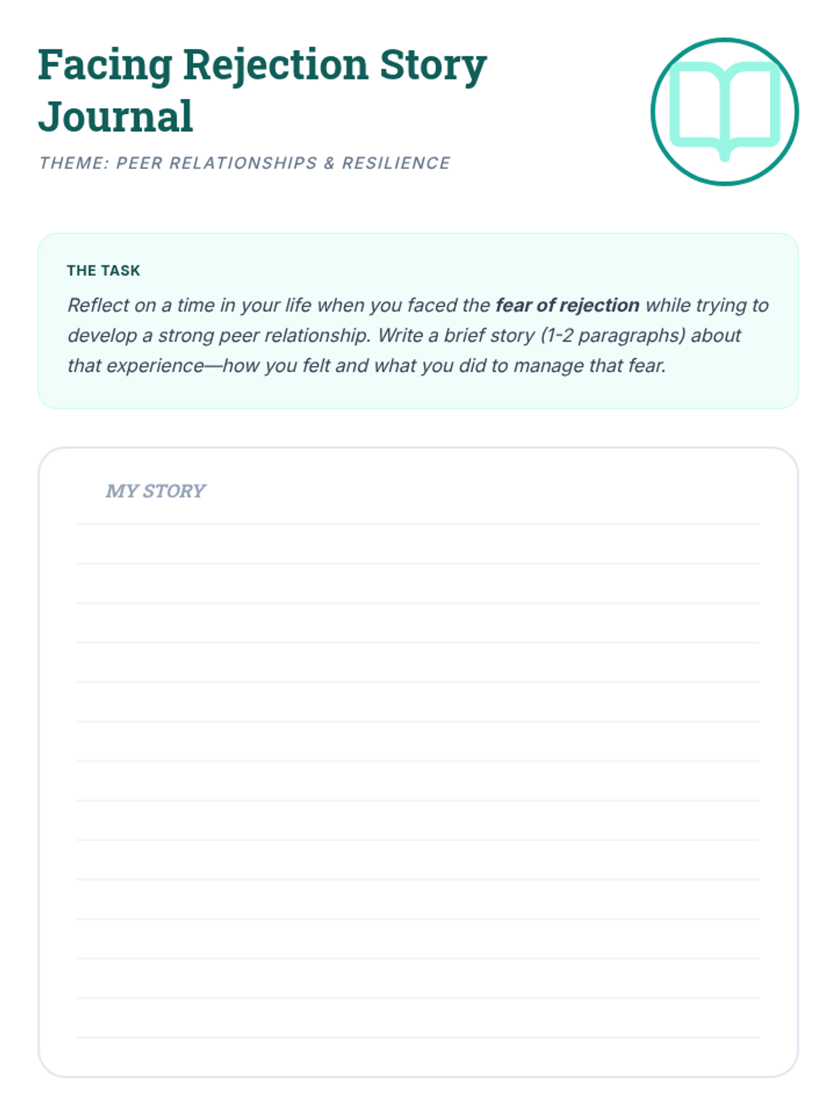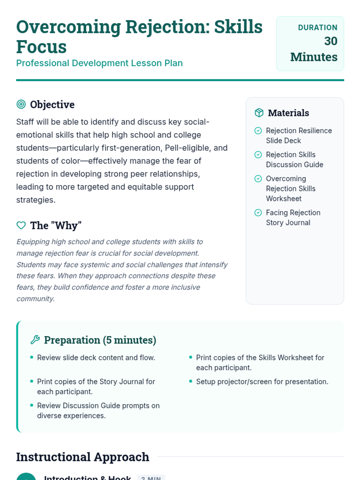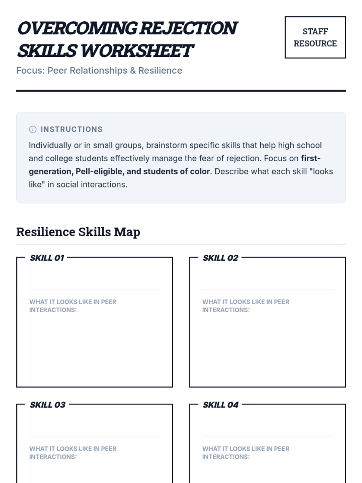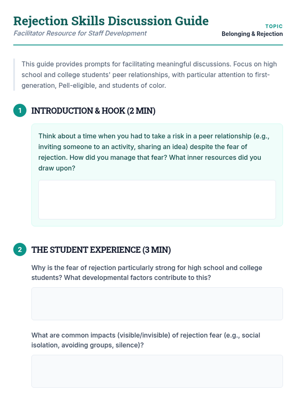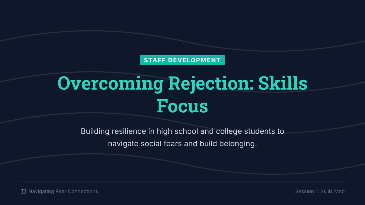 A 30-minute professional development session for staff to map out the skills high school and college students need to navigate the fear of rejection and foster a sense of belonging in peer relationships.
