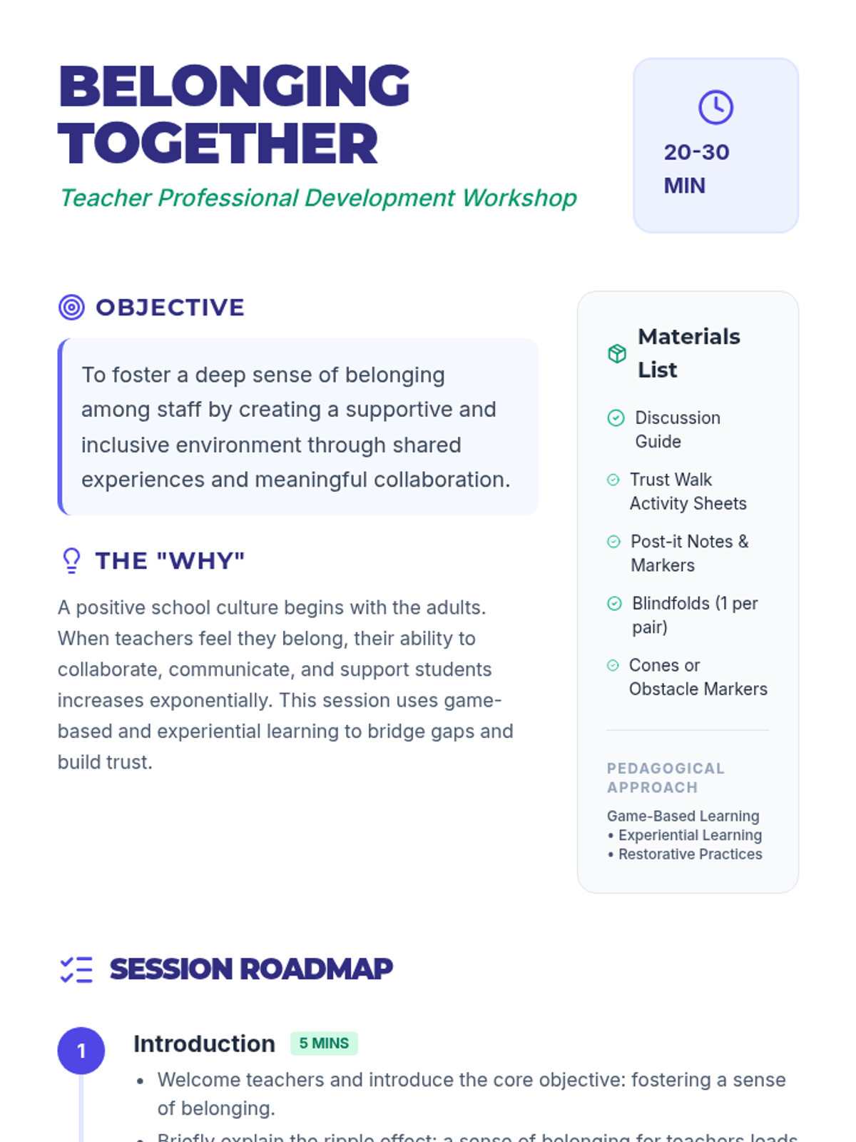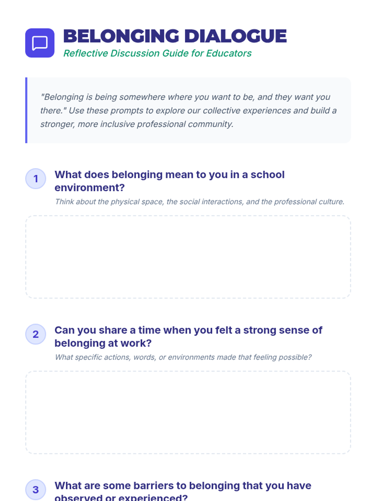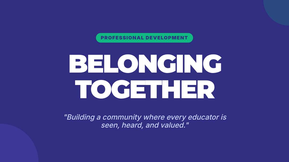 A professional development session for teachers focused on building community and a sense of belonging through discussion and trust-building activities.