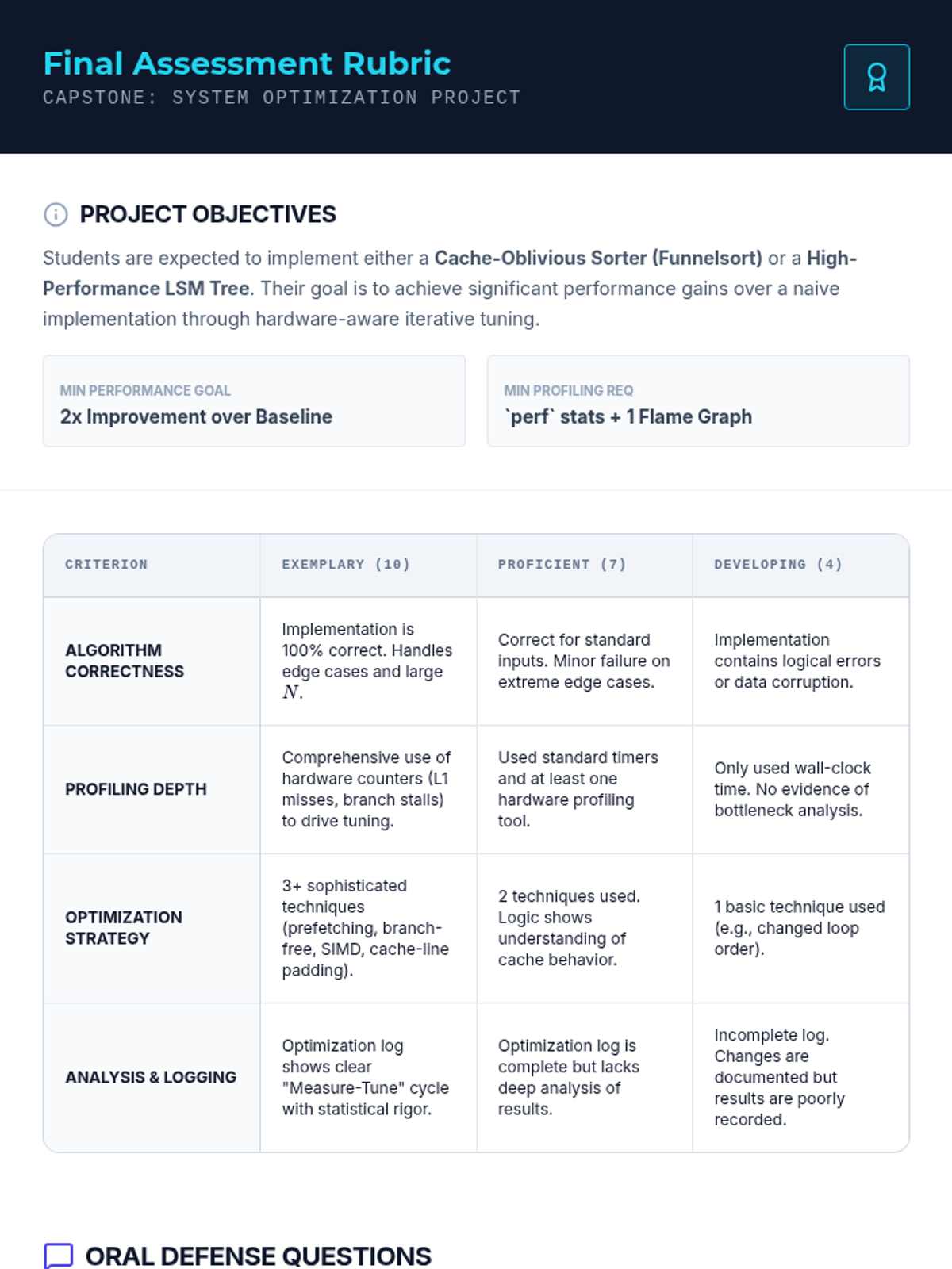 In the capstone lesson, students implement and benchmark custom sorting or indexing routines. They learn to use profiling tools to identify hardware-level bottlenecks and iteratively refine their code for real-world performance.
