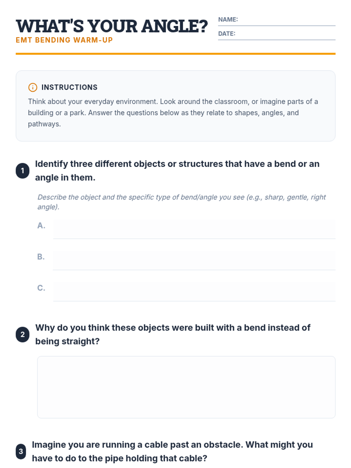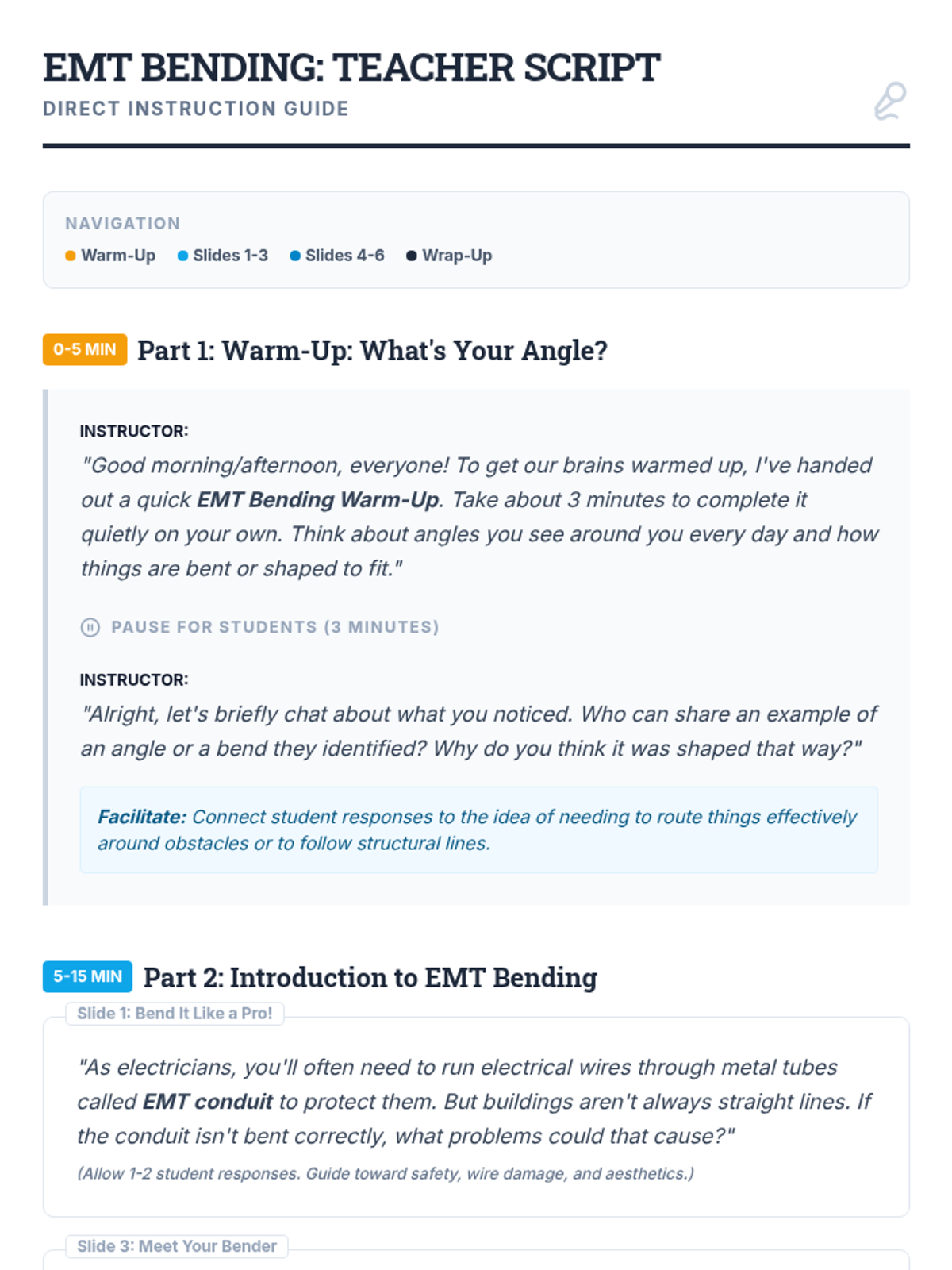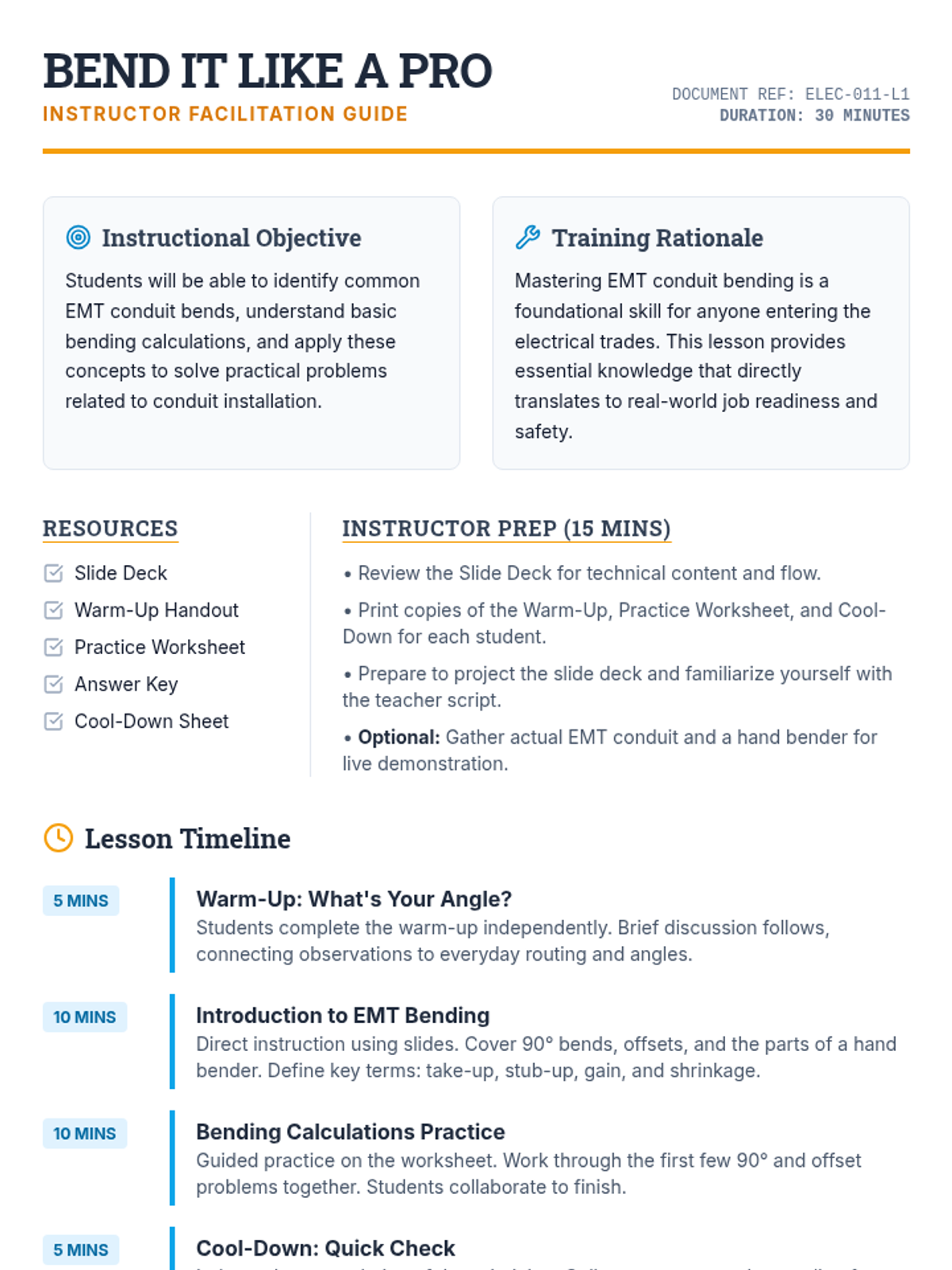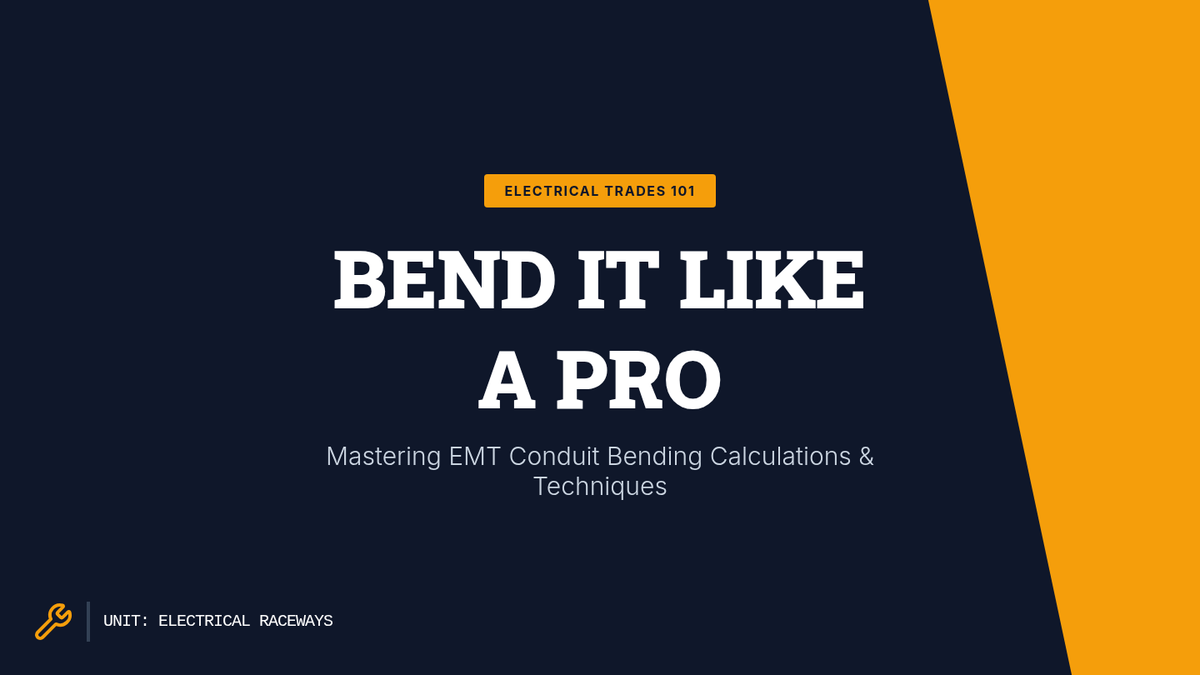This lesson introduces 11th-grade students to the fundamental concepts and practical applications of bending EMT conduit. Students will learn essential bending calculations and techniques, crucial skills for aspiring electricians.