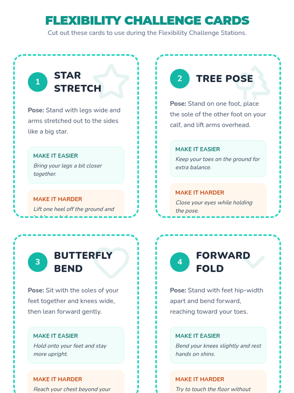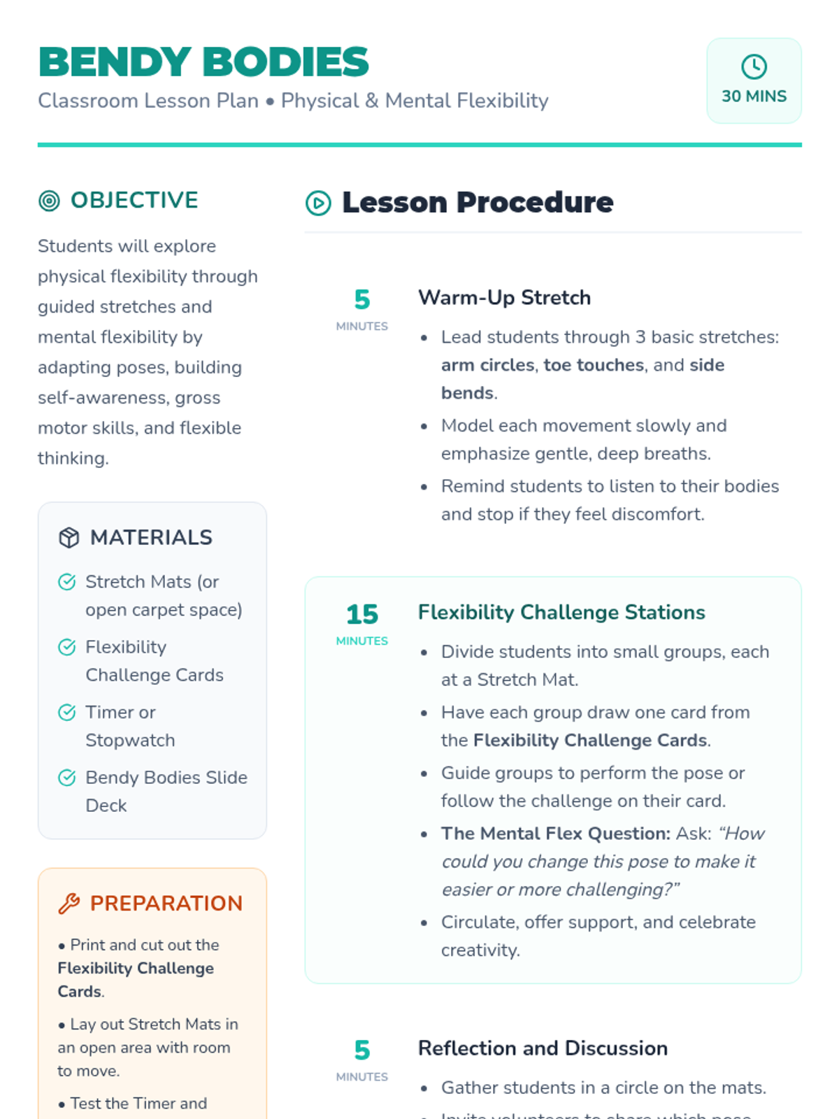 A 30-minute K-1 lesson that integrates physical stretches with mental flexibility challenges to build self-awareness and gross motor skills.