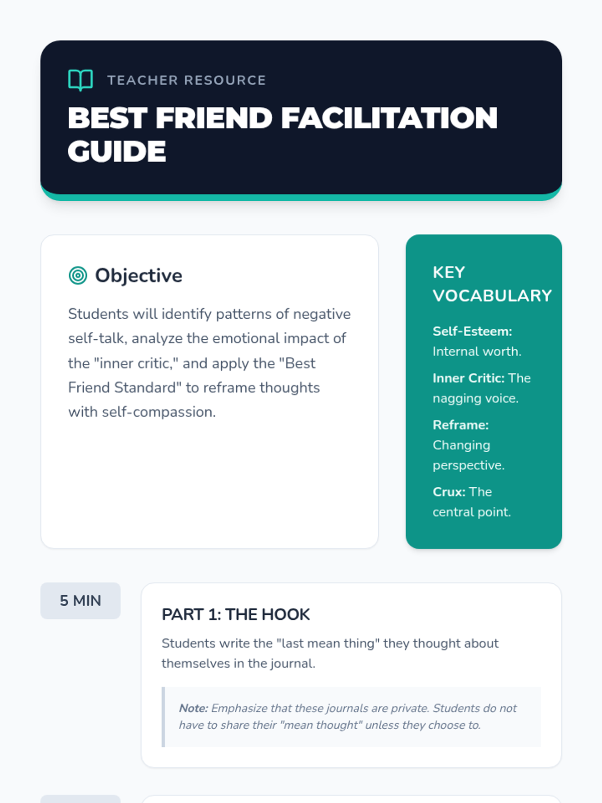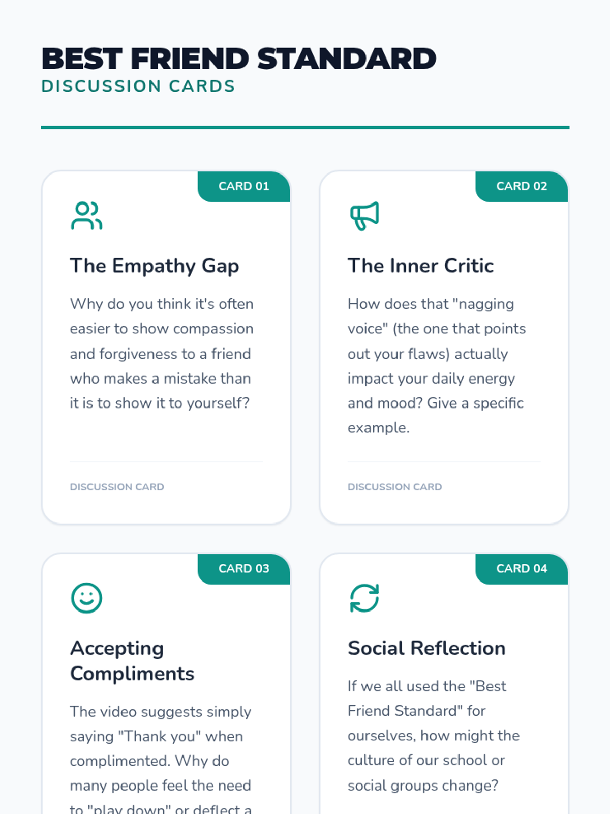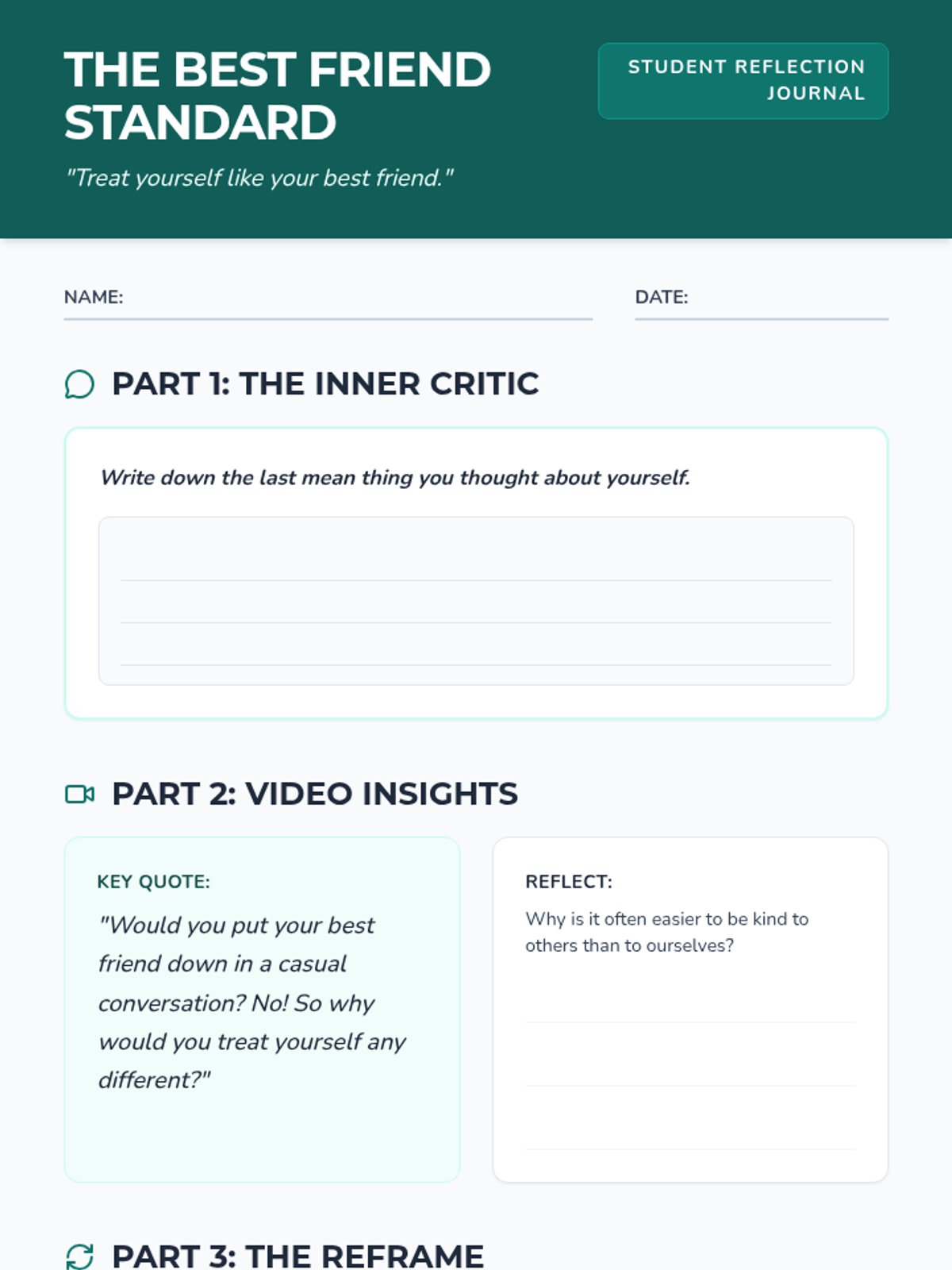 A mental health lesson for high schoolers focused on self-compassion. Students learn to identify their 'inner critic' and use the 'Best Friend Standard' to reframe negative self-talk into supportive, realistic thoughts.