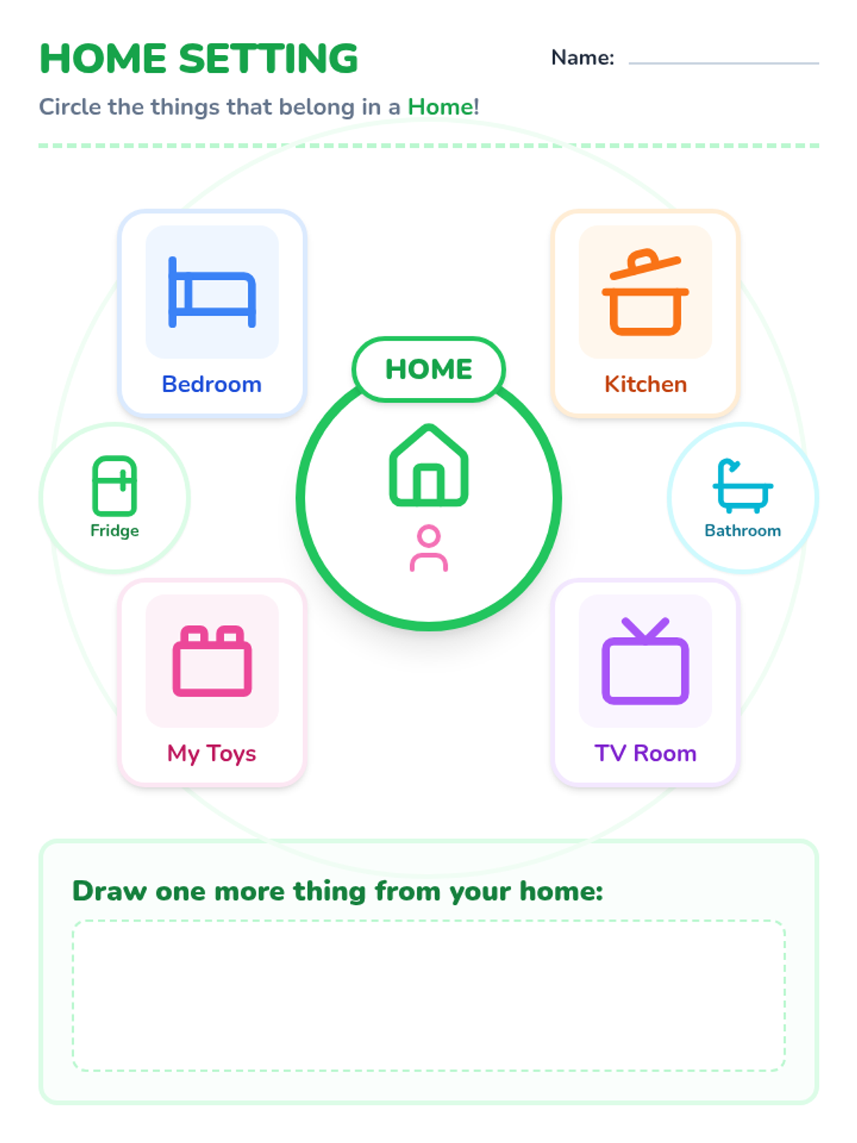 A kindergarten lesson focused on distinguishing between home and school settings through visual exploration and character interaction.