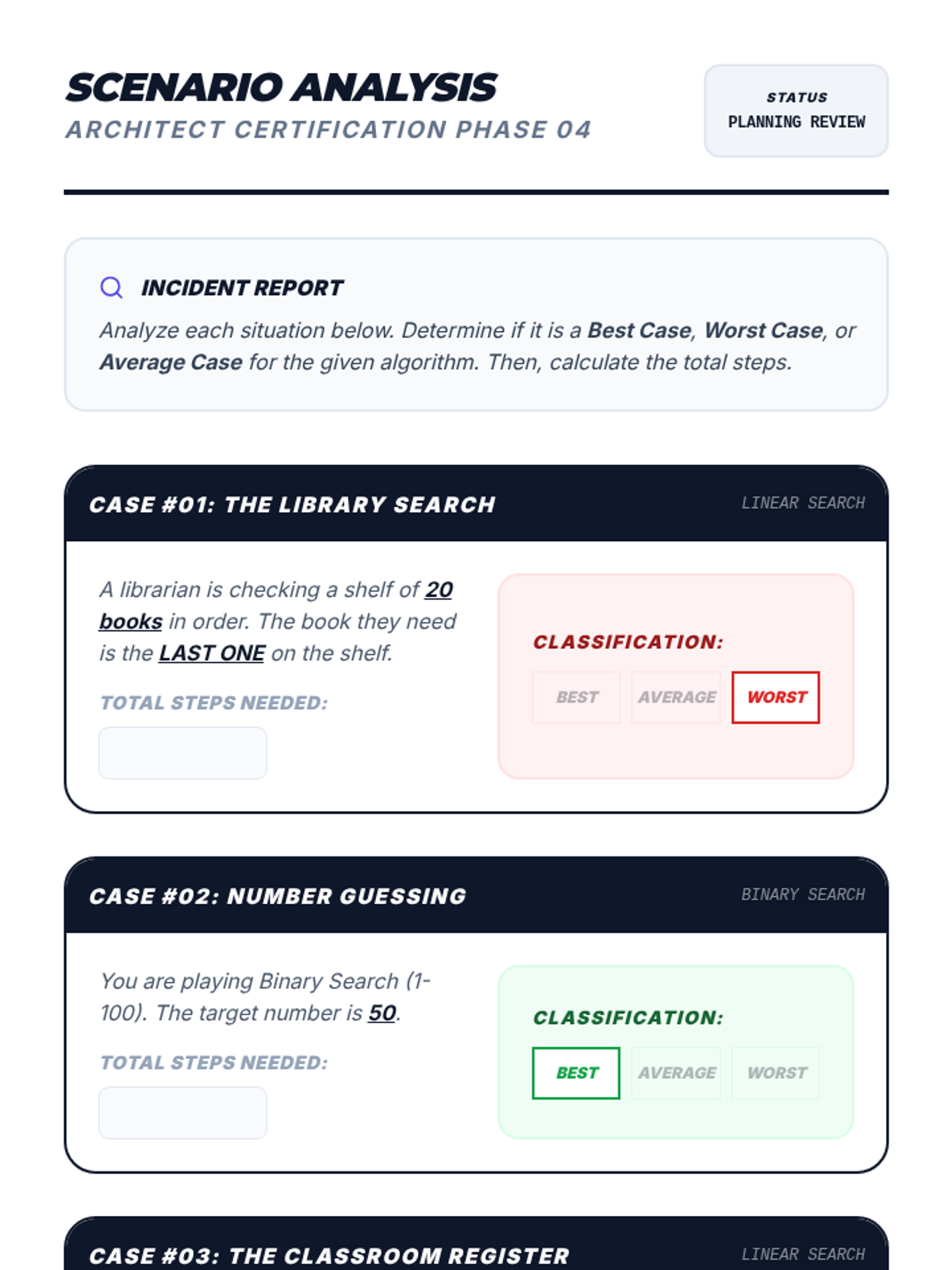 Students investigate how luck and input order affect performance, defining best-case and worst-case scenarios for different algorithms.
