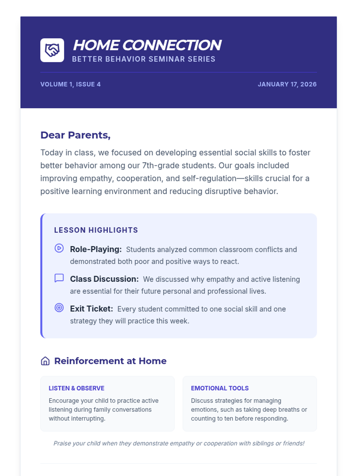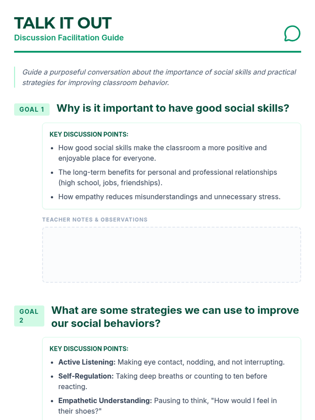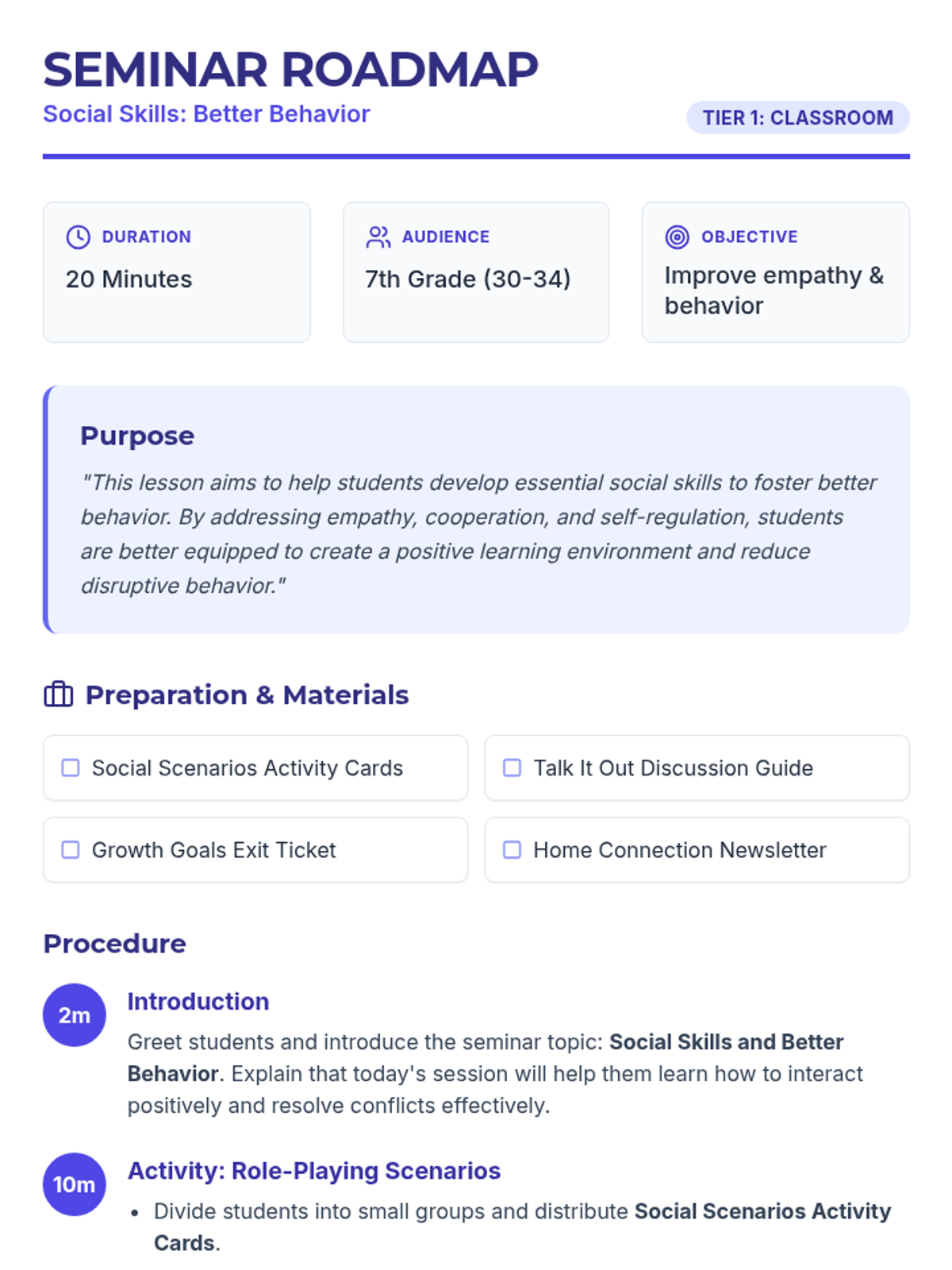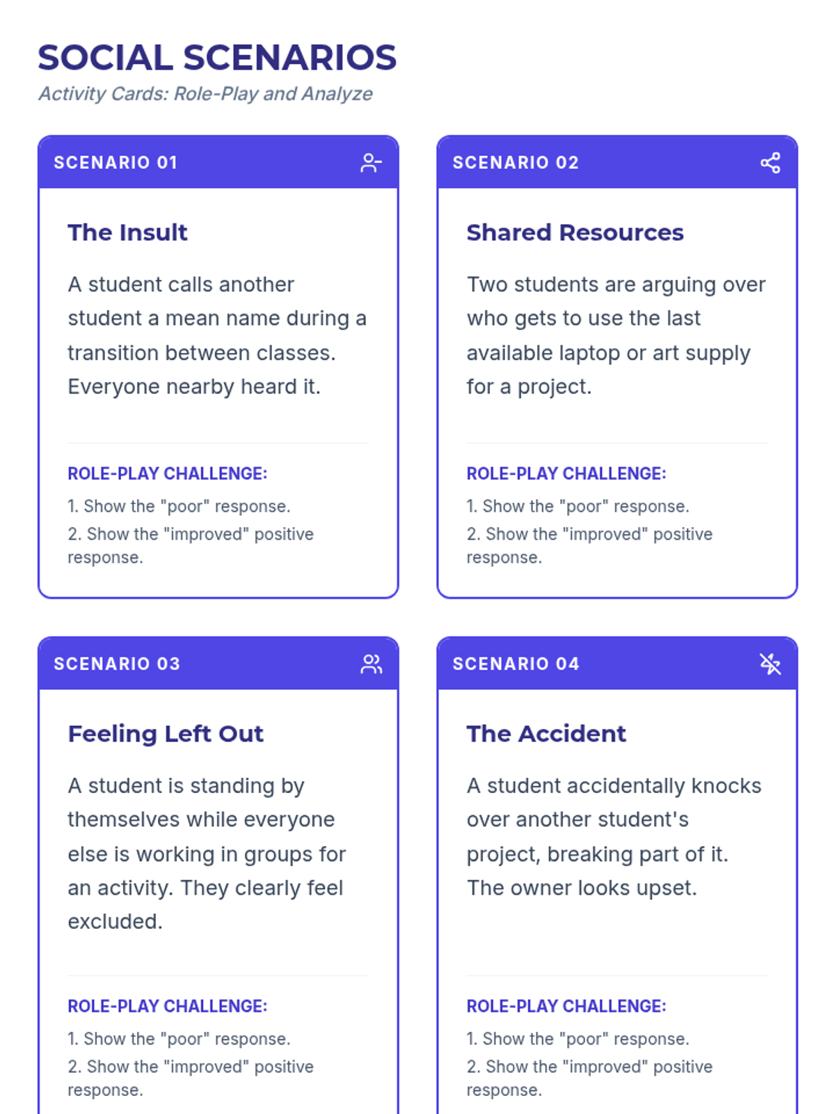 A comprehensive 20-minute social skills lesson for 7th graders focusing on empathy, cooperation, and self-regulation through role-playing and discussion.