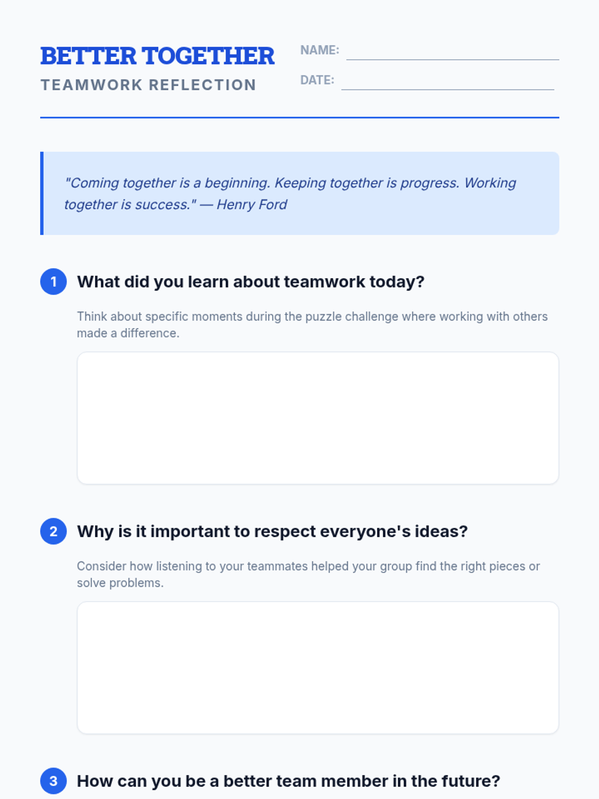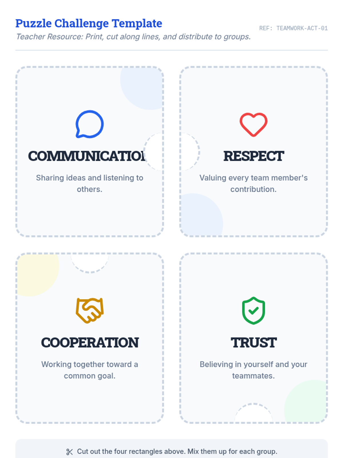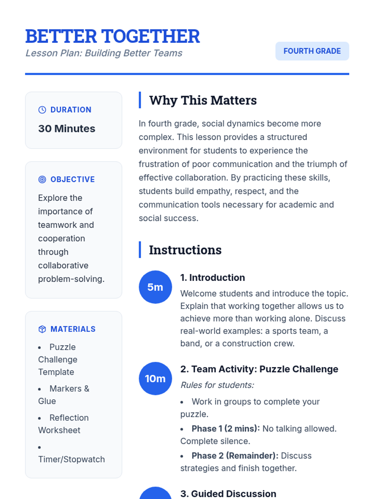 A lesson focused on developing teamwork skills through a collaborative puzzle challenge and group reflection. Students explore the importance of communication, respect, and shared goals in fourth-grade settings.