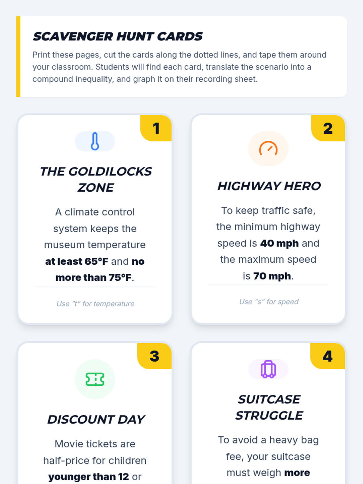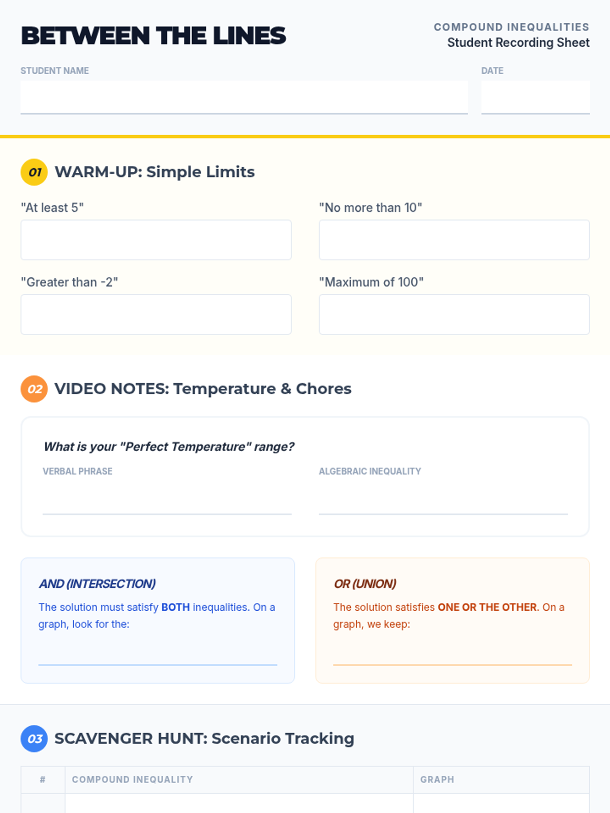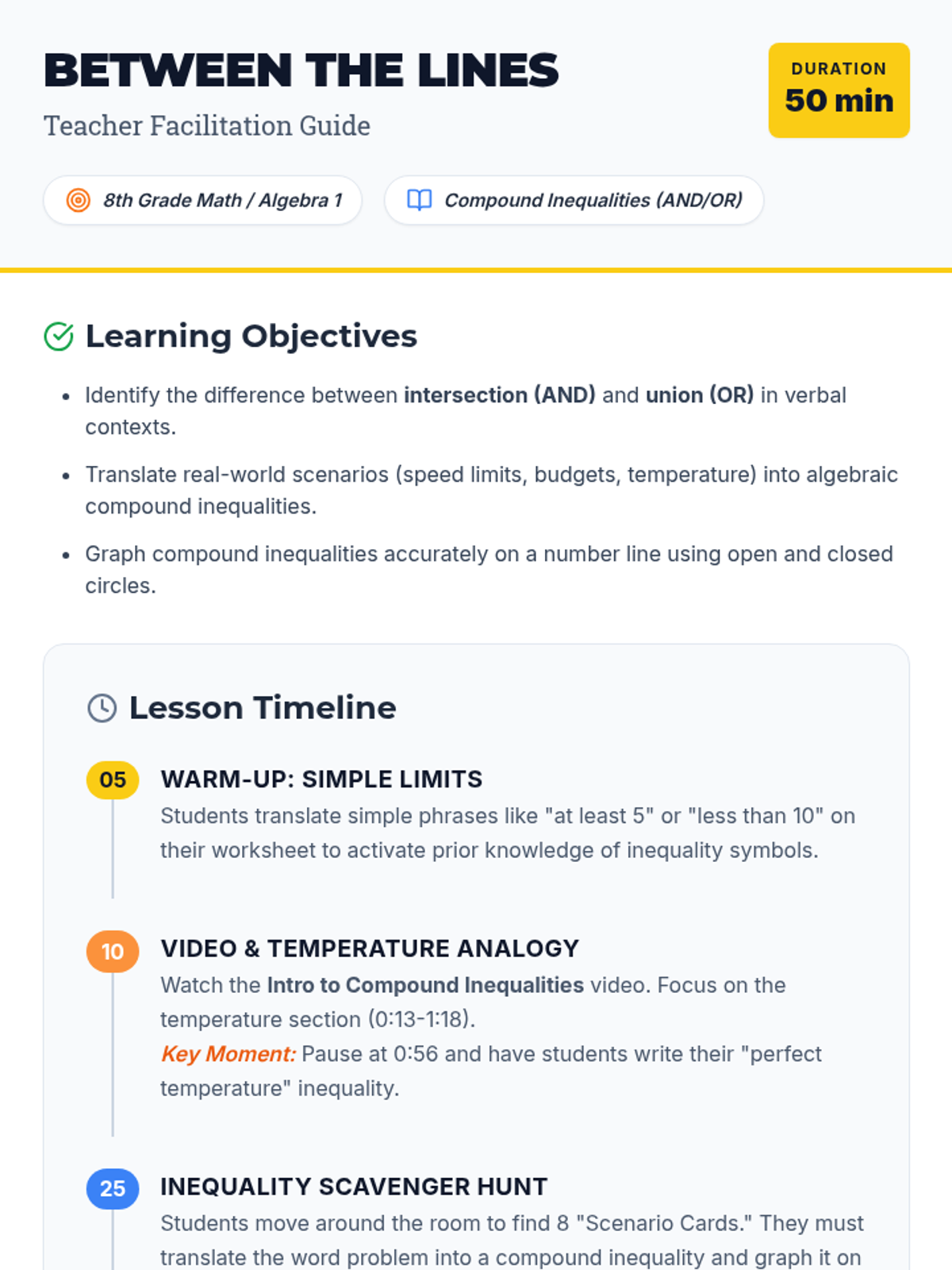 This lesson introduces 8th-grade students to compound inequalities using real-world analogies like temperature and household chores. Students will learn to translate verbal phrases into 'AND' and 'OR' inequalities and represent them on number lines.