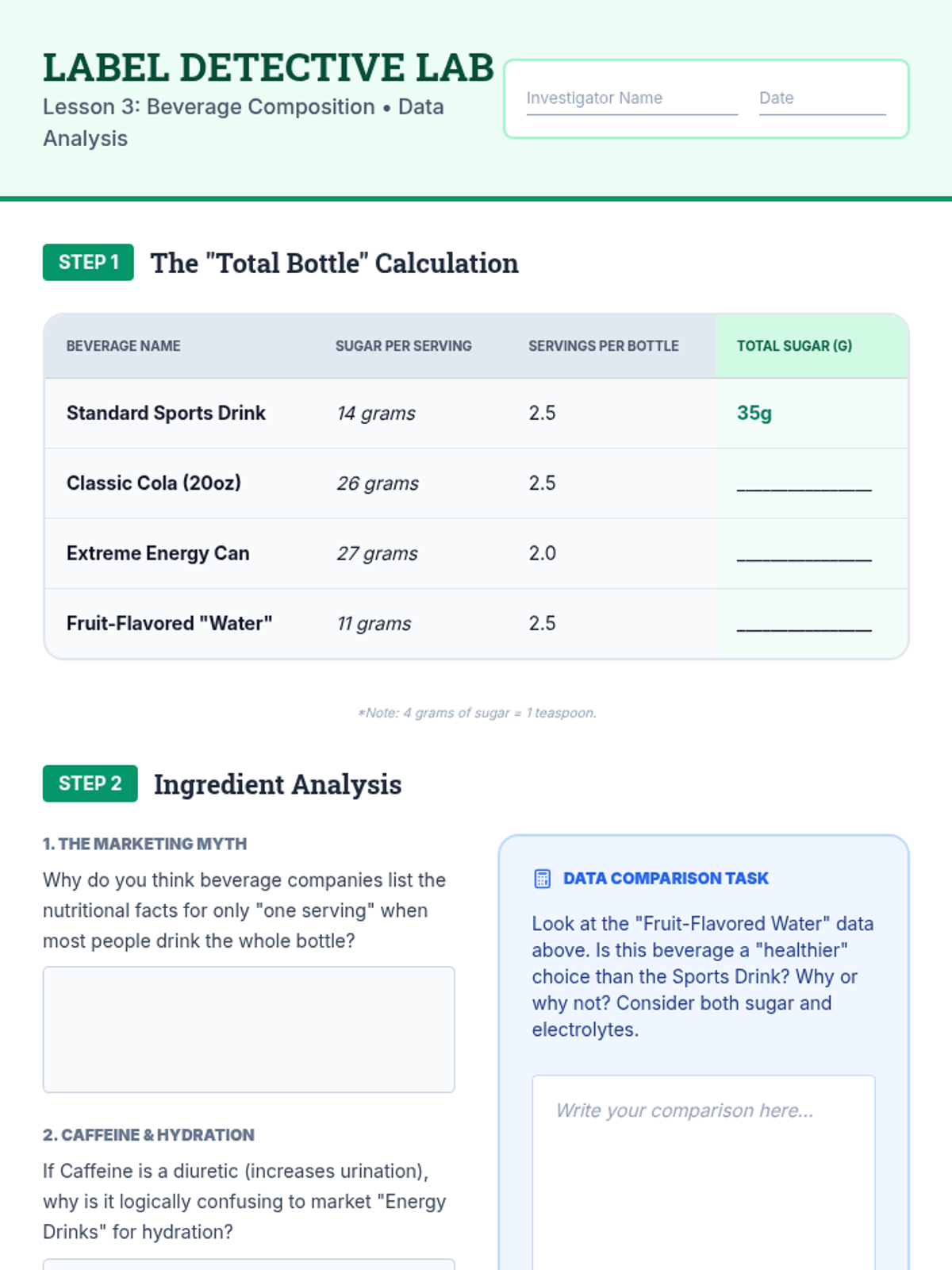 A critical analysis of nutrition labels comparing sports drinks, energy drinks, and sodas to water, focusing on sugar and caffeine content.