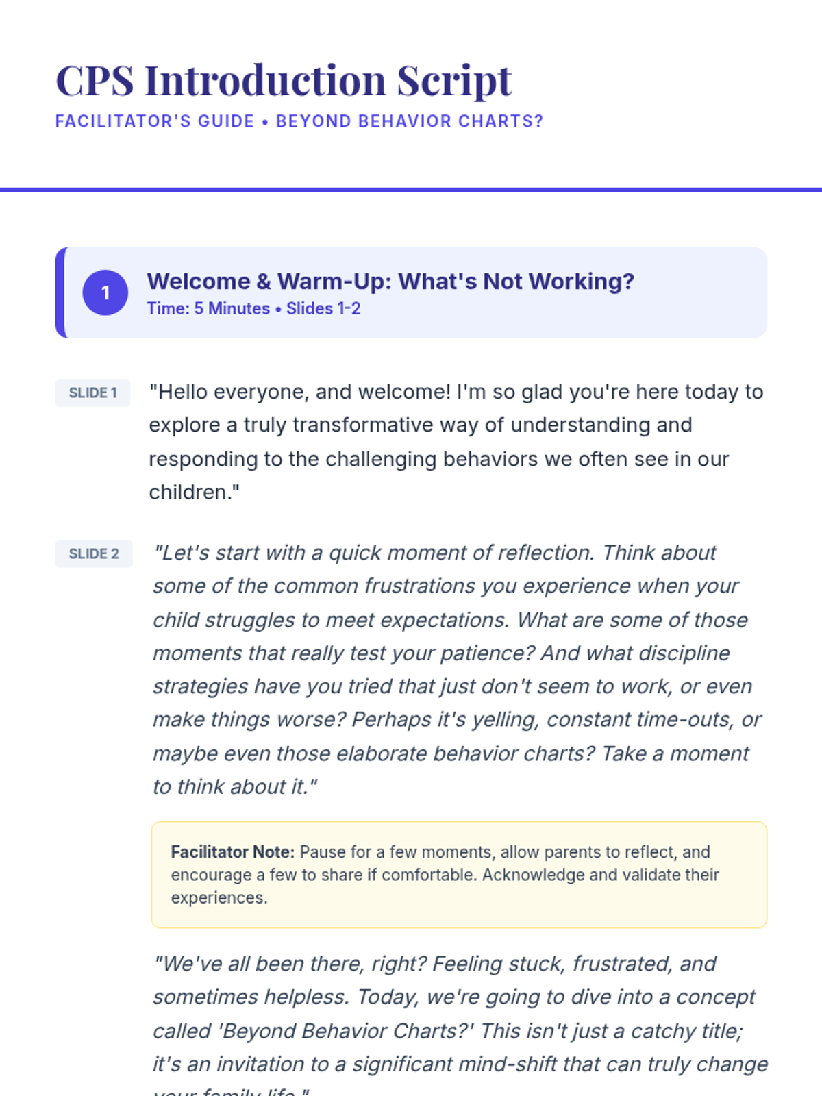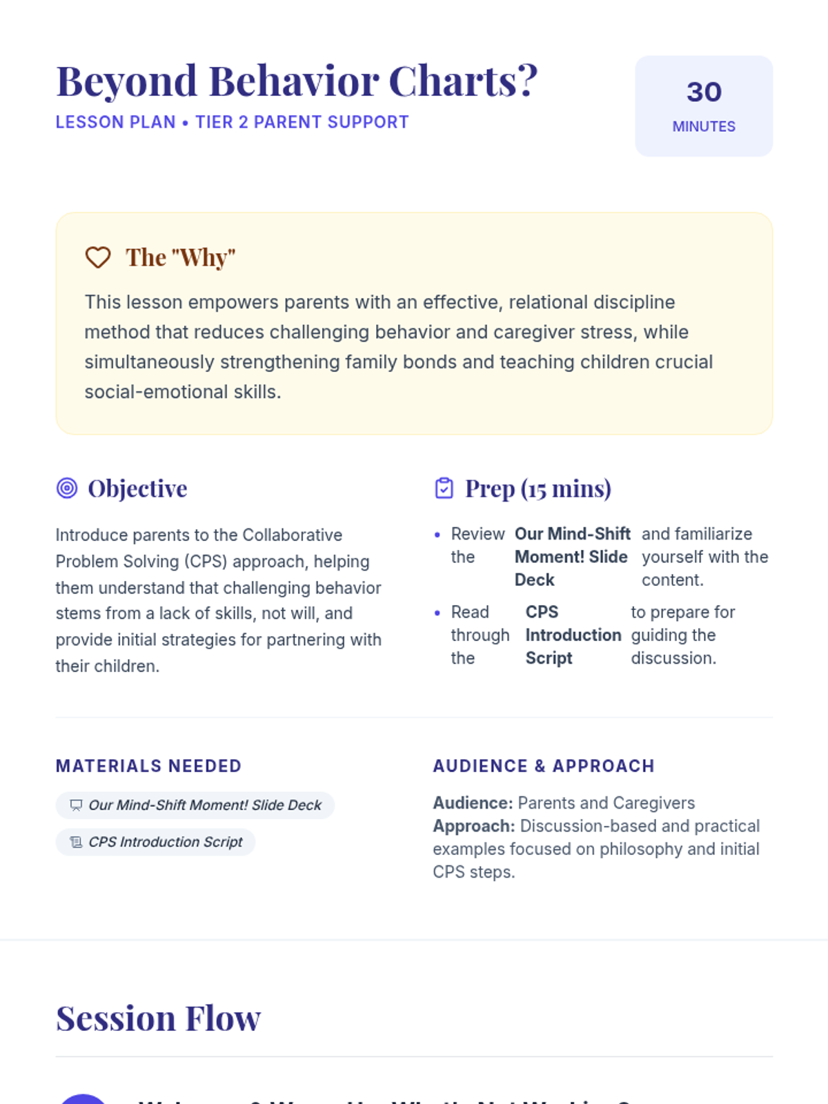 This 30-minute Tier 2 session for parents and caregivers introduces the Collaborative Problem Solving (CPS) approach, shifting the focus from traditional discipline to skill-building and relationship-strengthening.