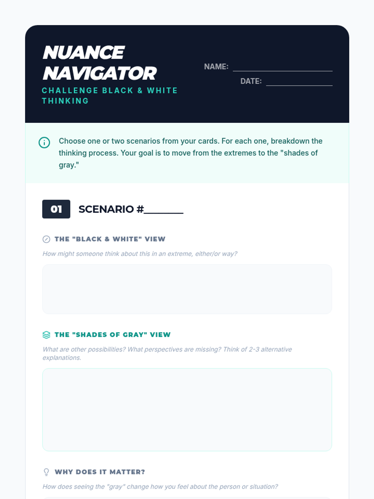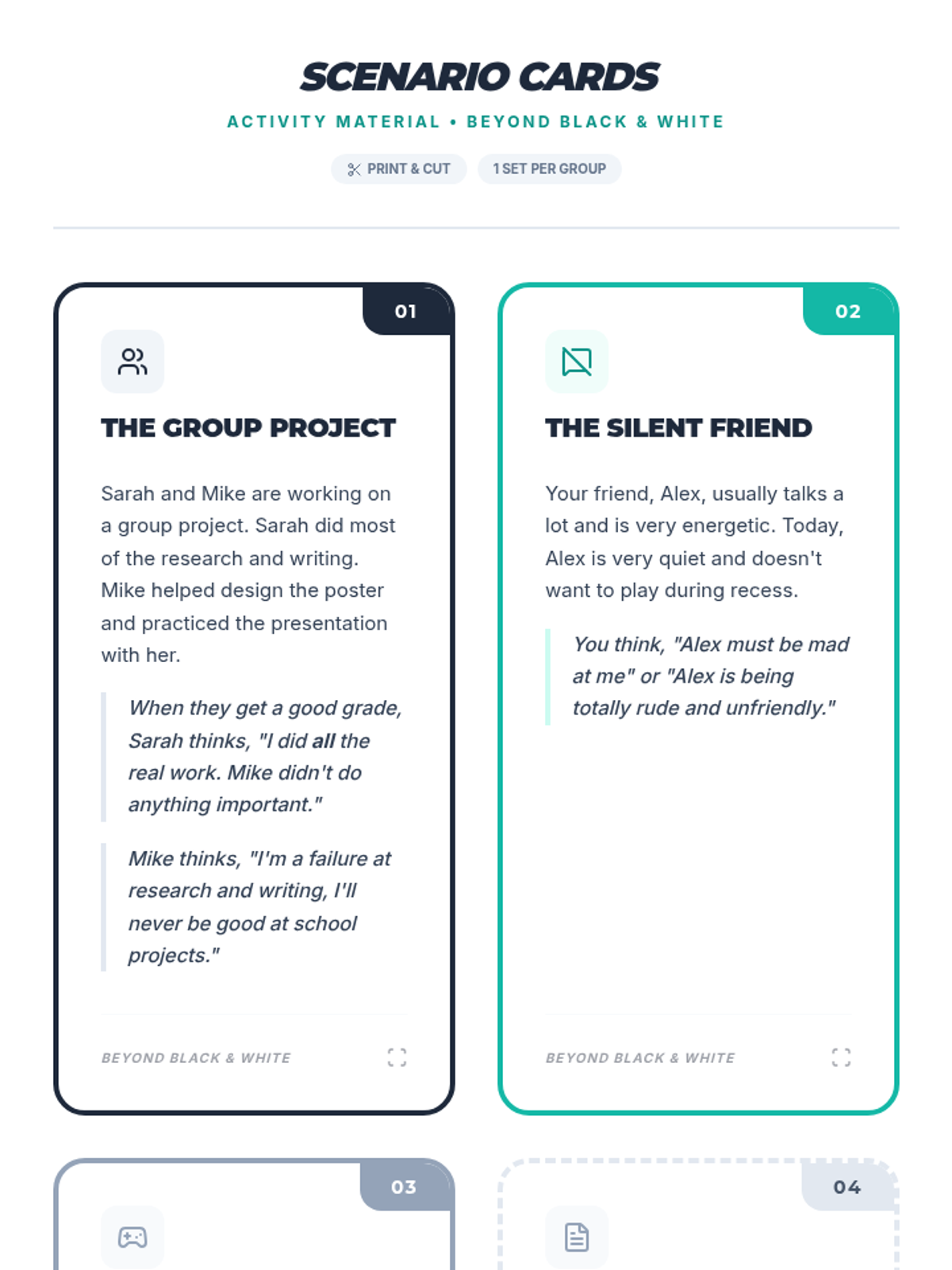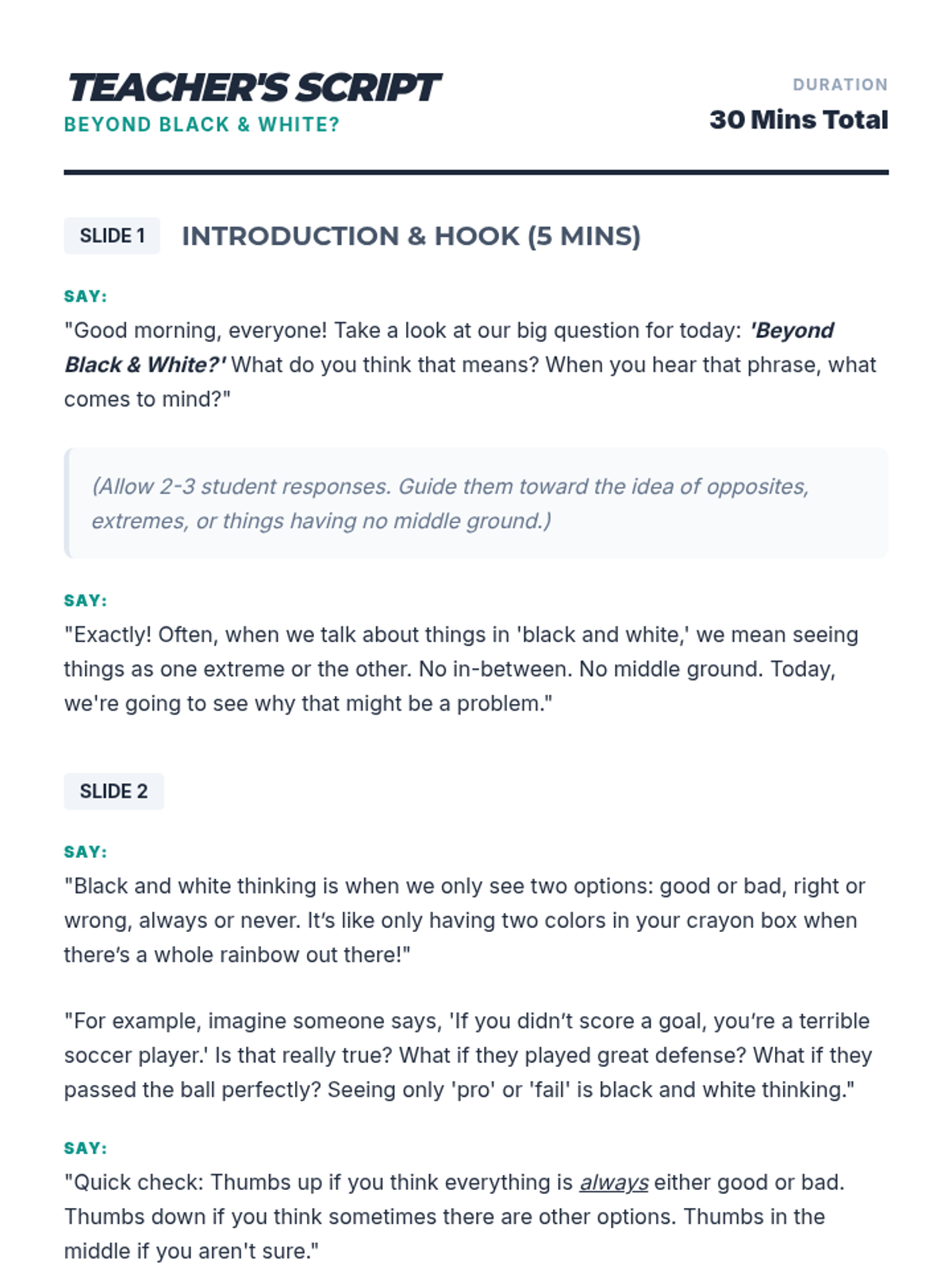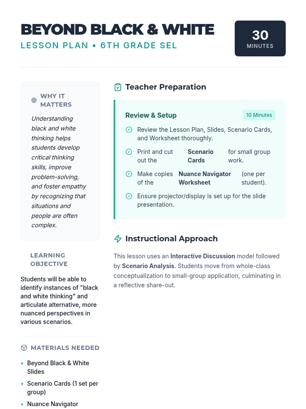 A 30-minute SEL lesson for 6th graders to identify and challenge black-and-white thinking by exploring nuance and 'shades of gray' in everyday scenarios.