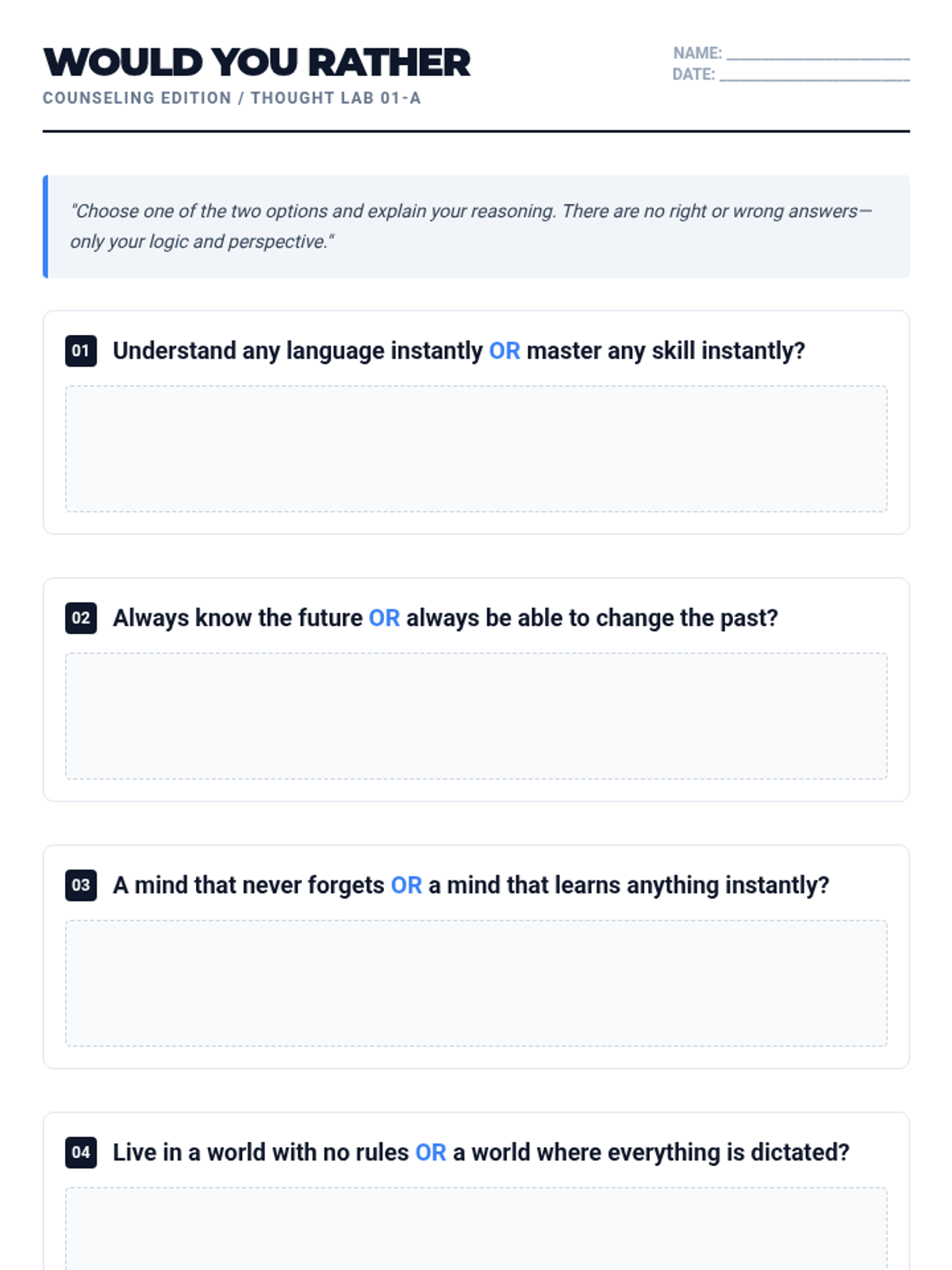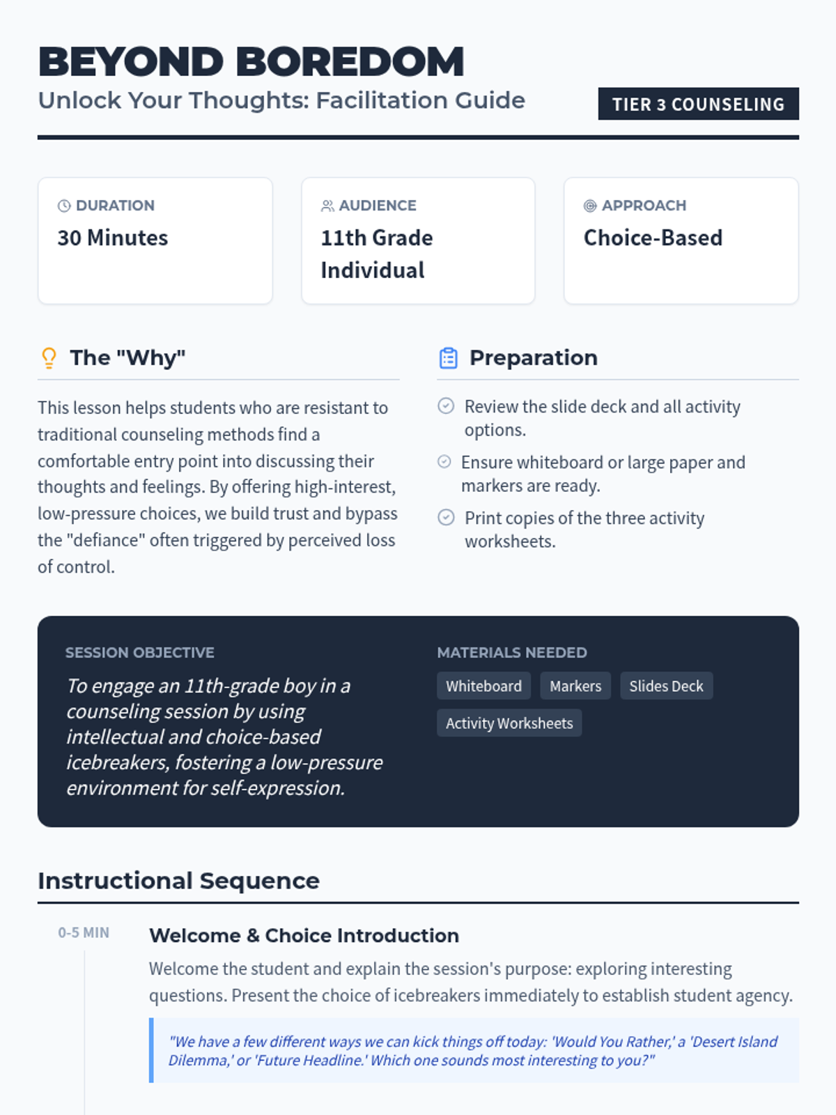A 30-minute individual counseling session for 11th-grade students designed to bypass resistance and boredom through choice-based, intellectually stimulating activities.