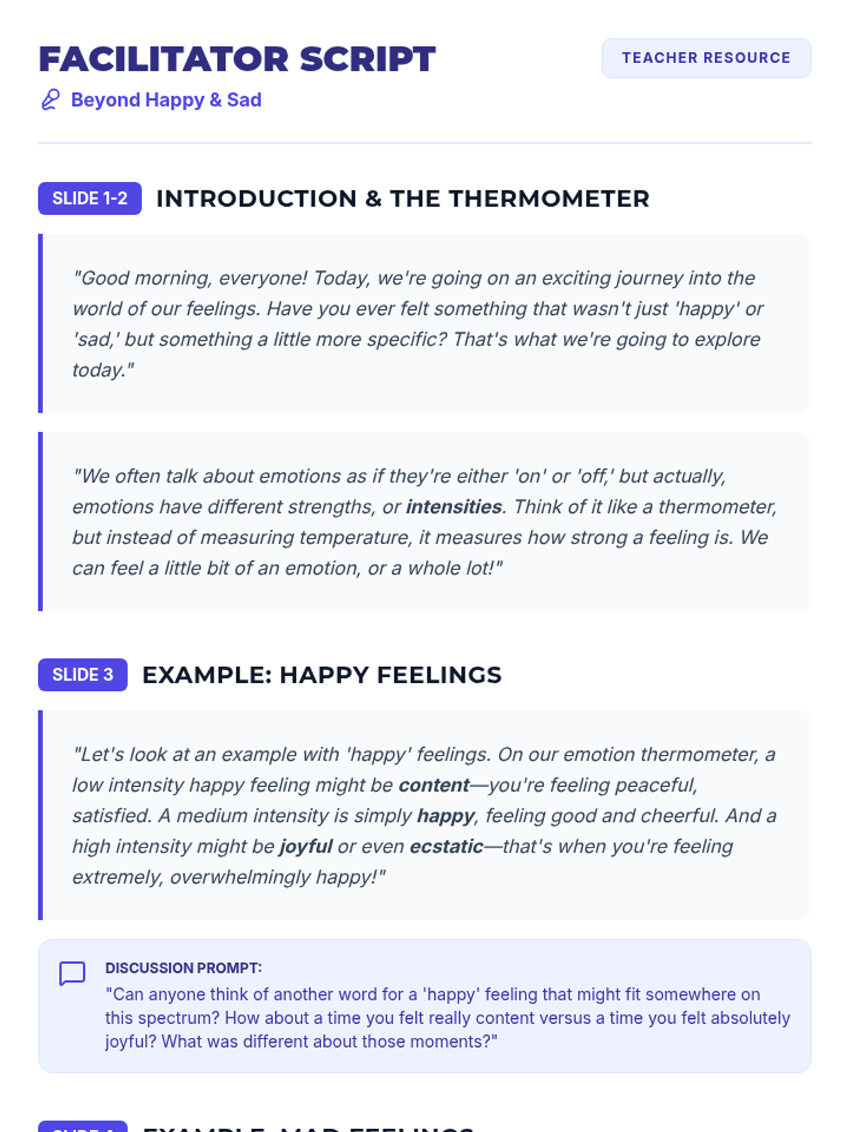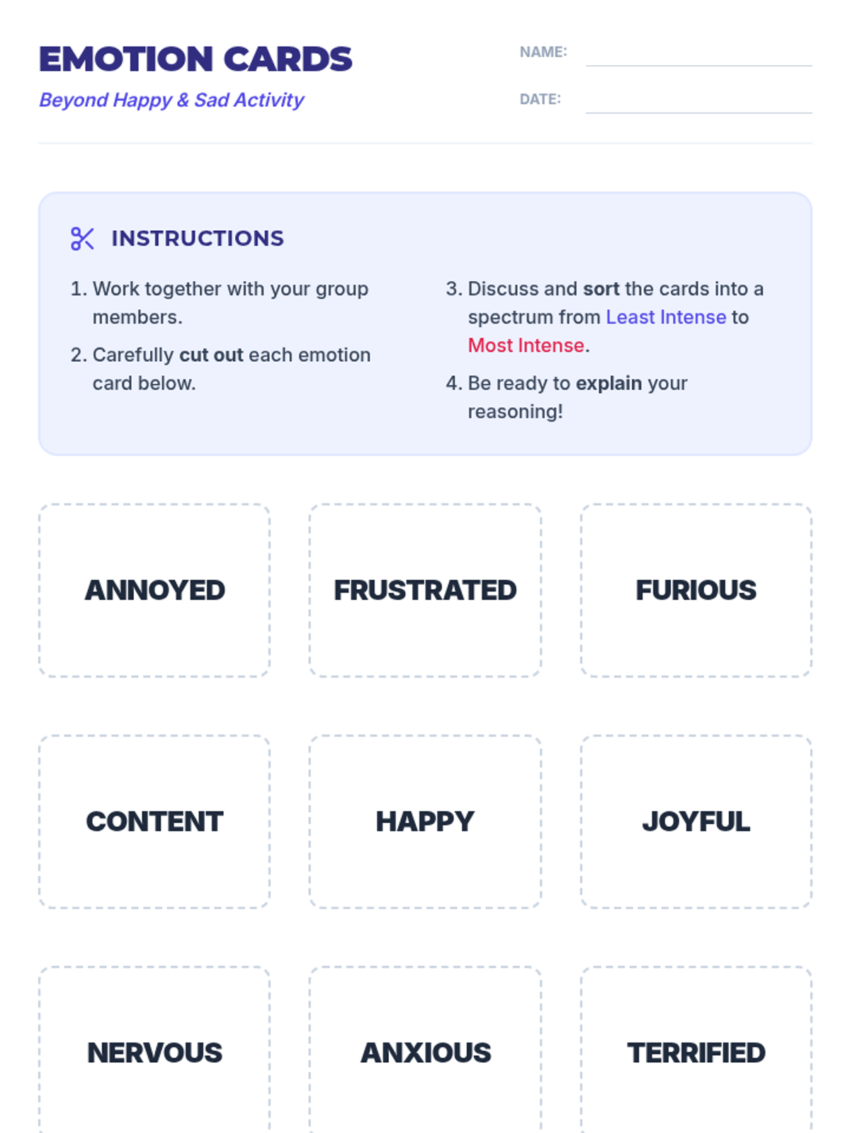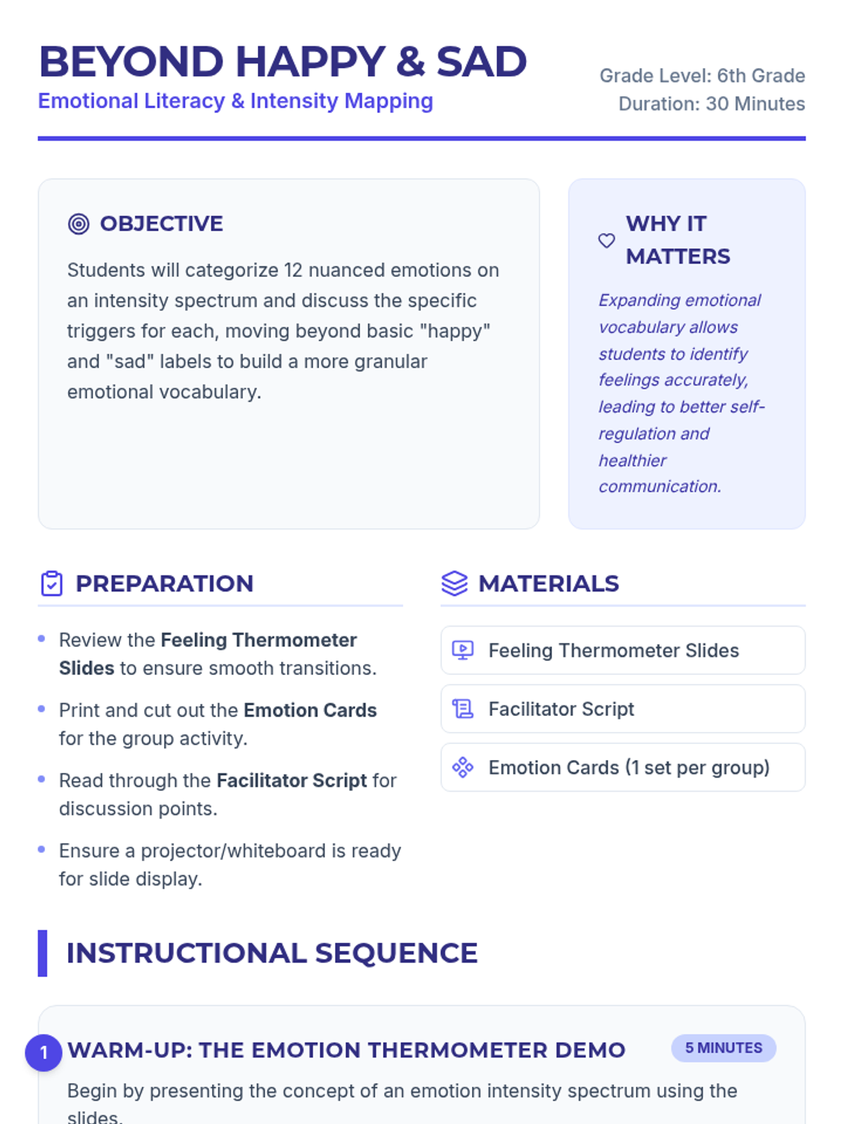 This lesson helps 6th-grade students explore 12 nuanced emotions on an intensity spectrum, fostering emotional literacy and self-awareness. Students will categorize feelings and discuss their triggers through interactive demonstrations and group sorting.