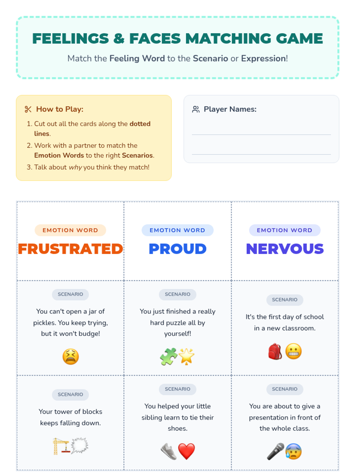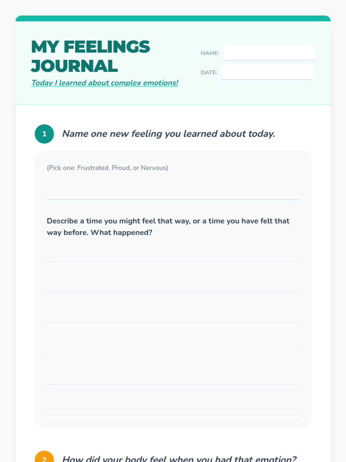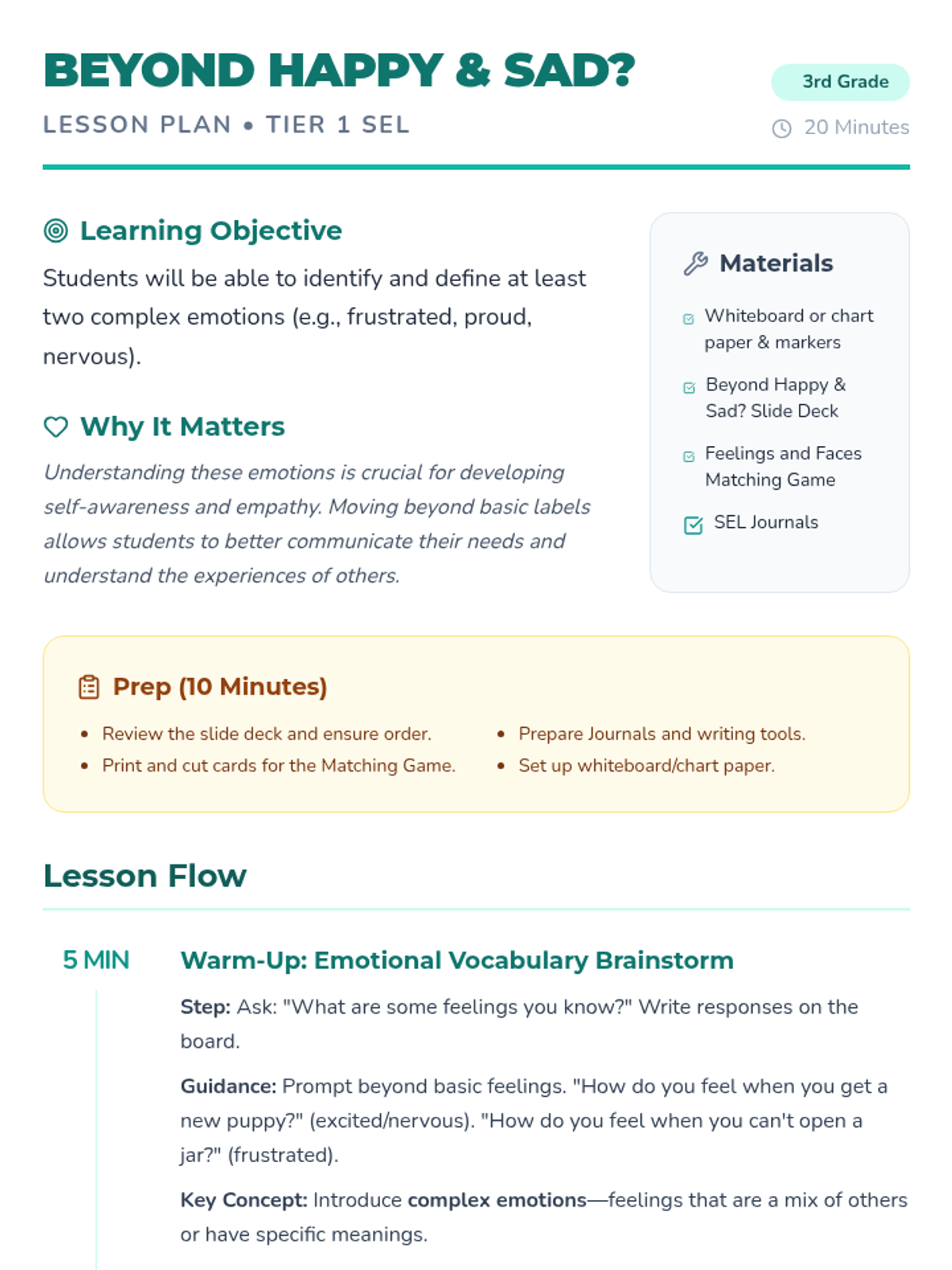 A 20-minute SEL lesson for 3rd graders focusing on expanding emotional vocabulary through the exploration of complex emotions like frustrated, proud, and nervous.