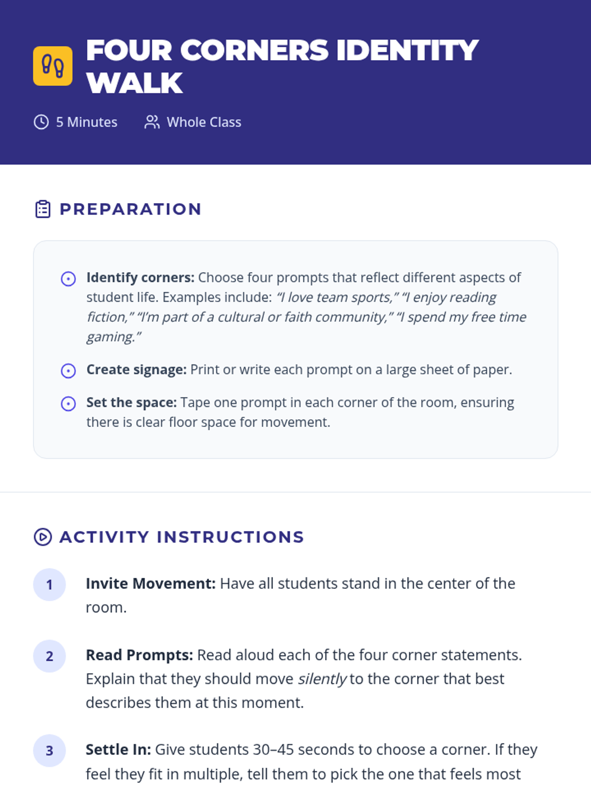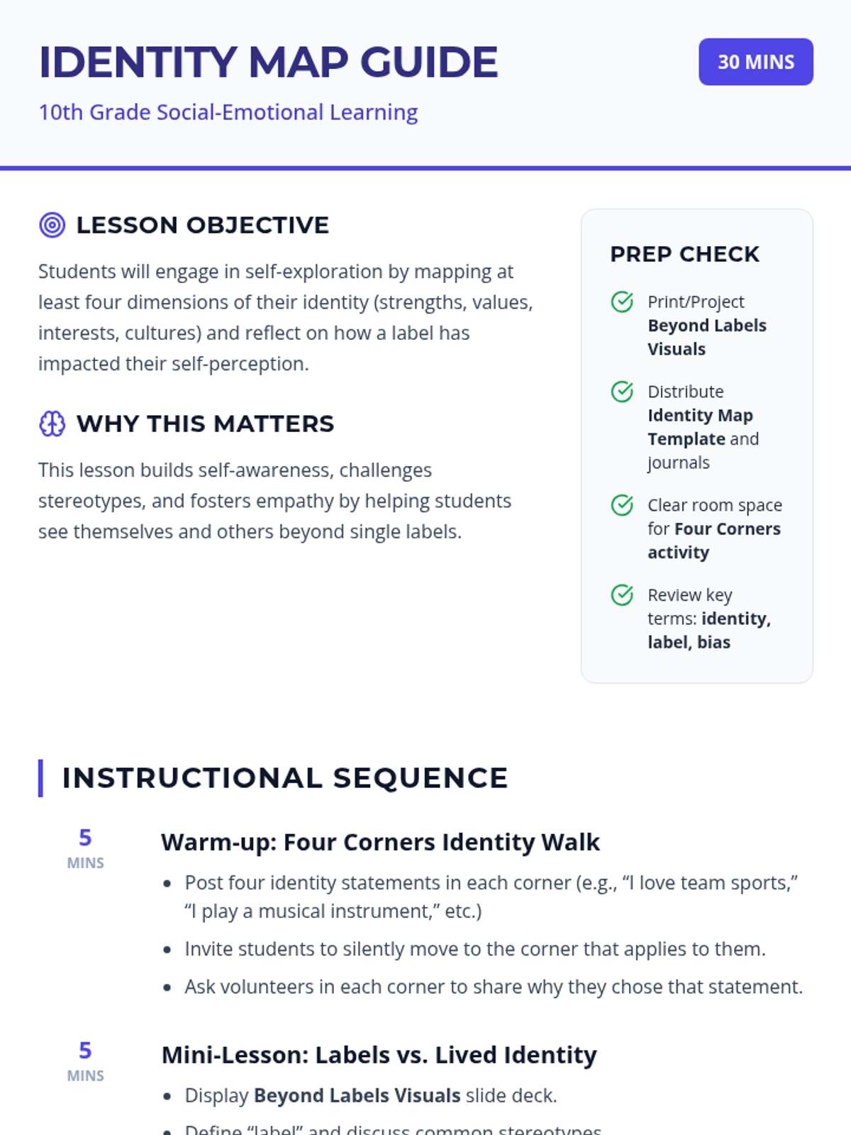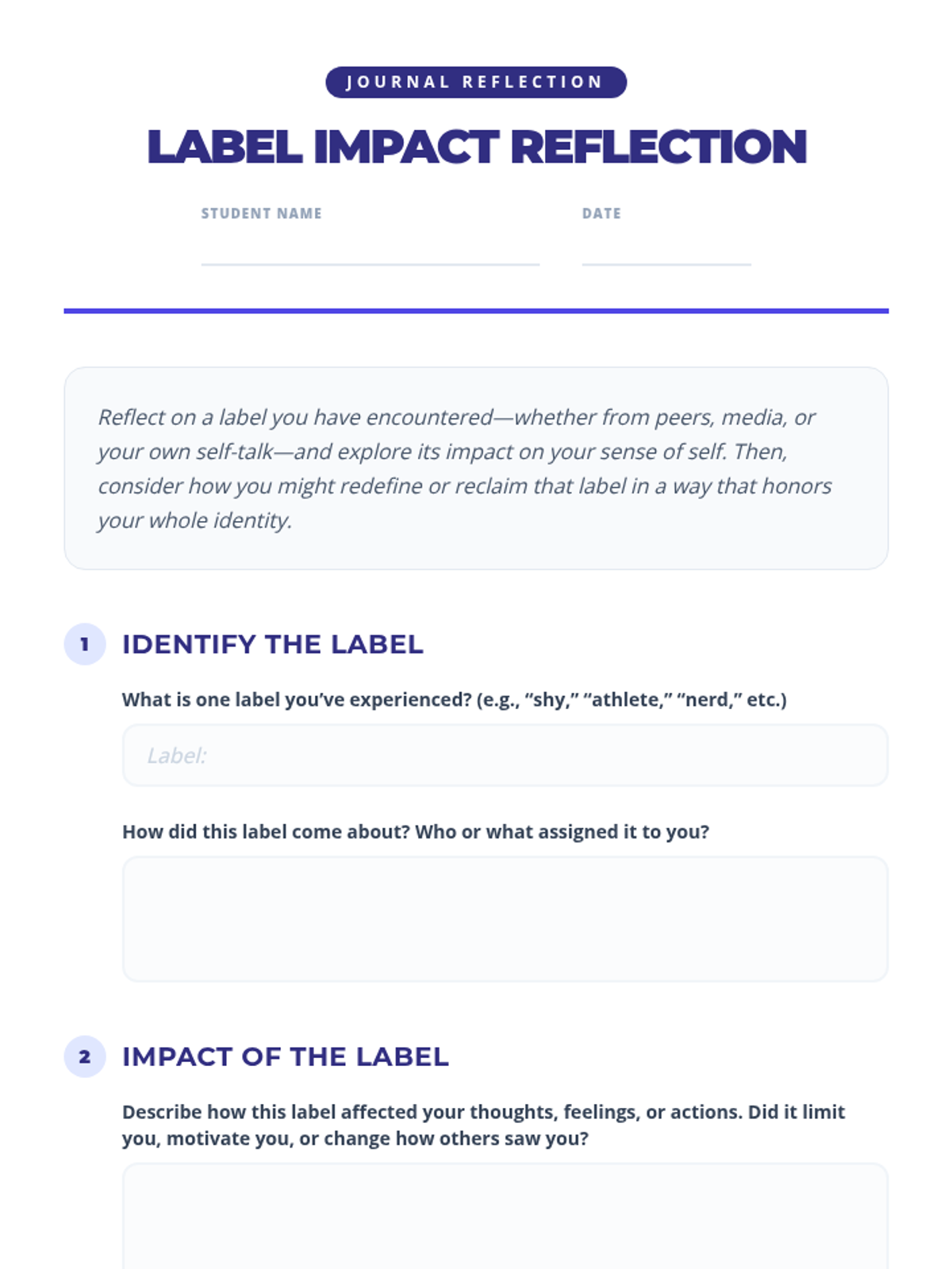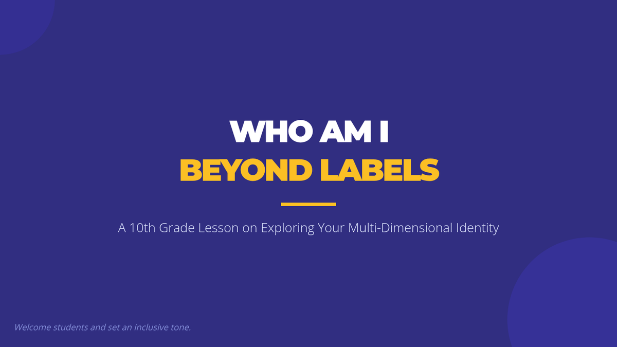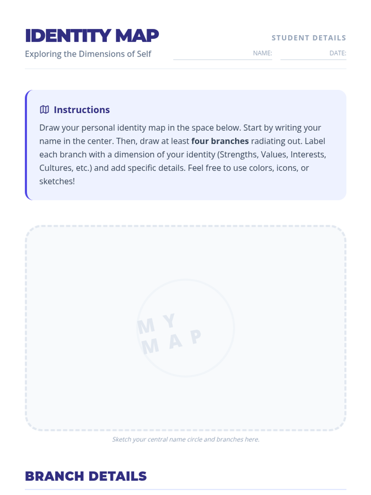 Students explore their multi-dimensional identities by creating personal identity maps and reflecting on the impact of labels to foster self-awareness and combat bias.