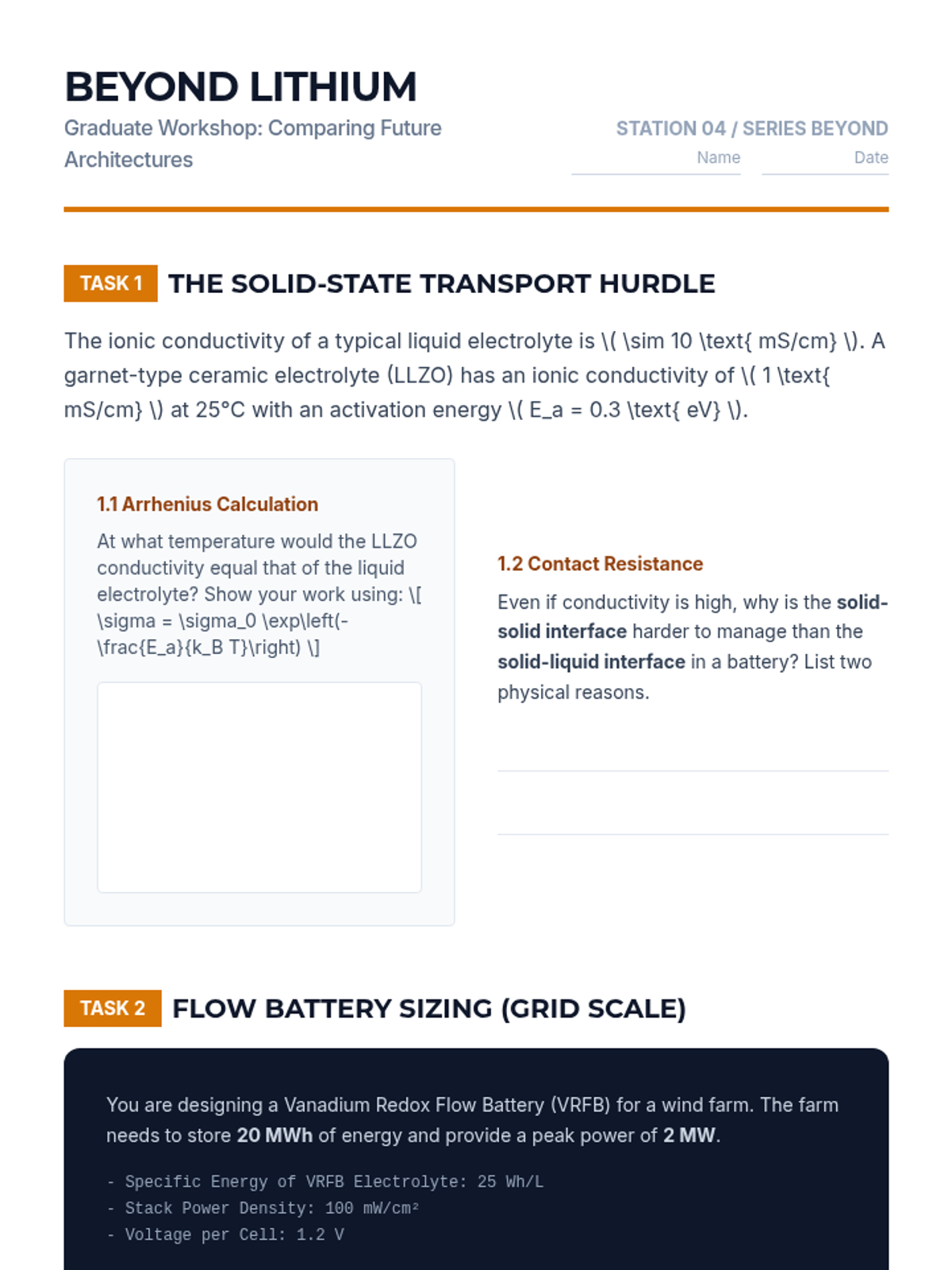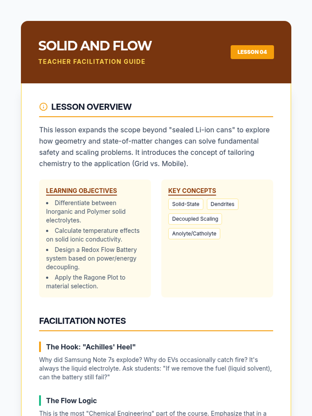 Focusing on future technologies, students explore solid-state electrolytes and redox flow batteries for grid-scale storage.