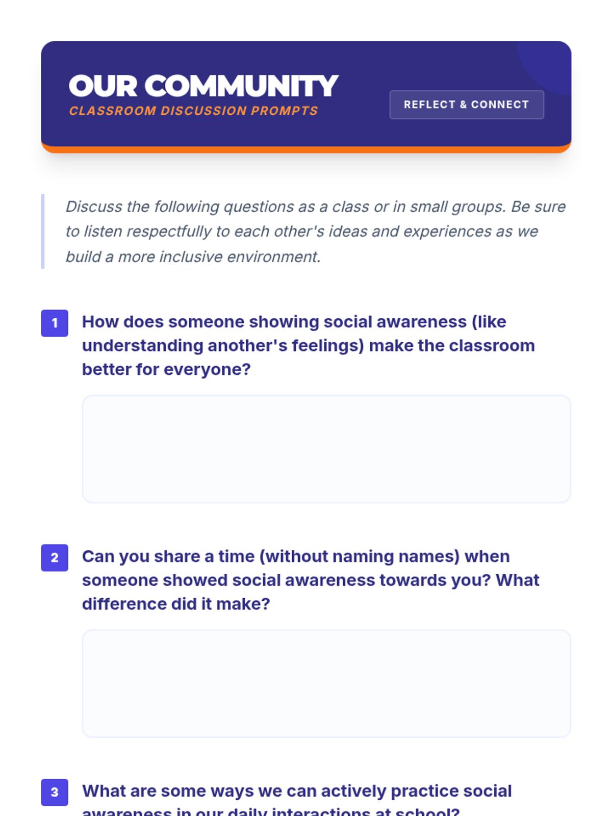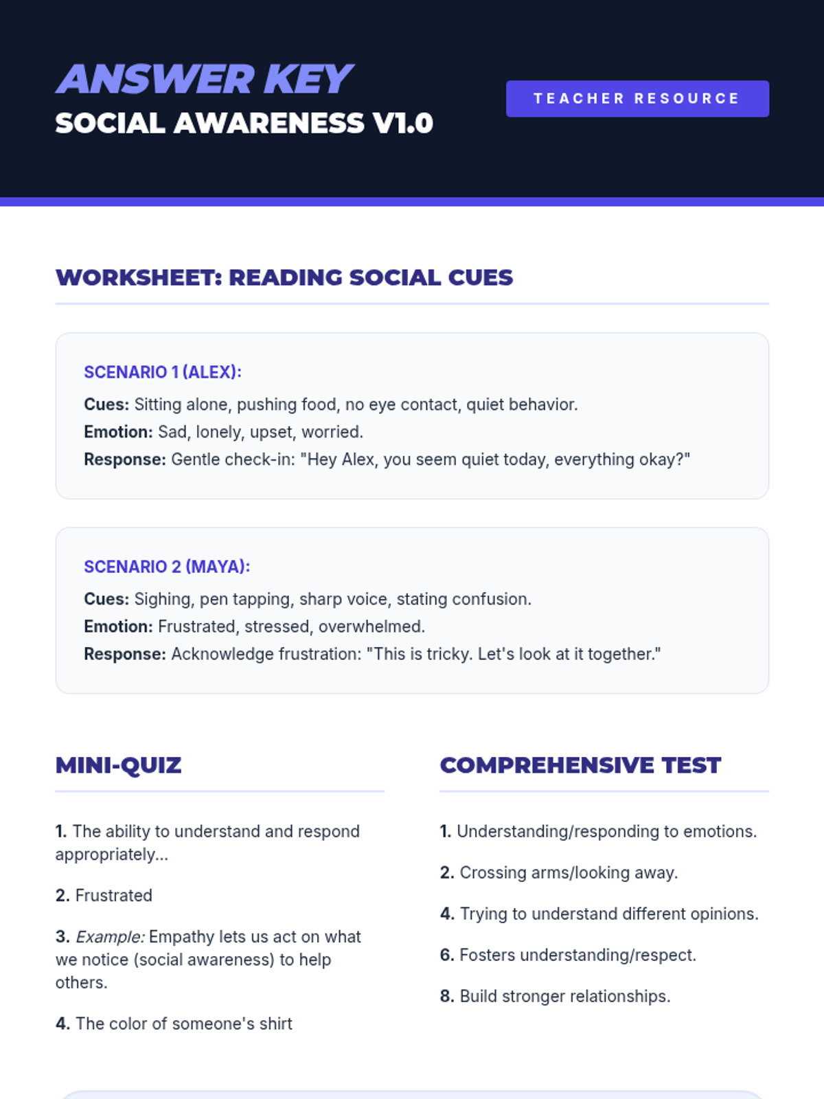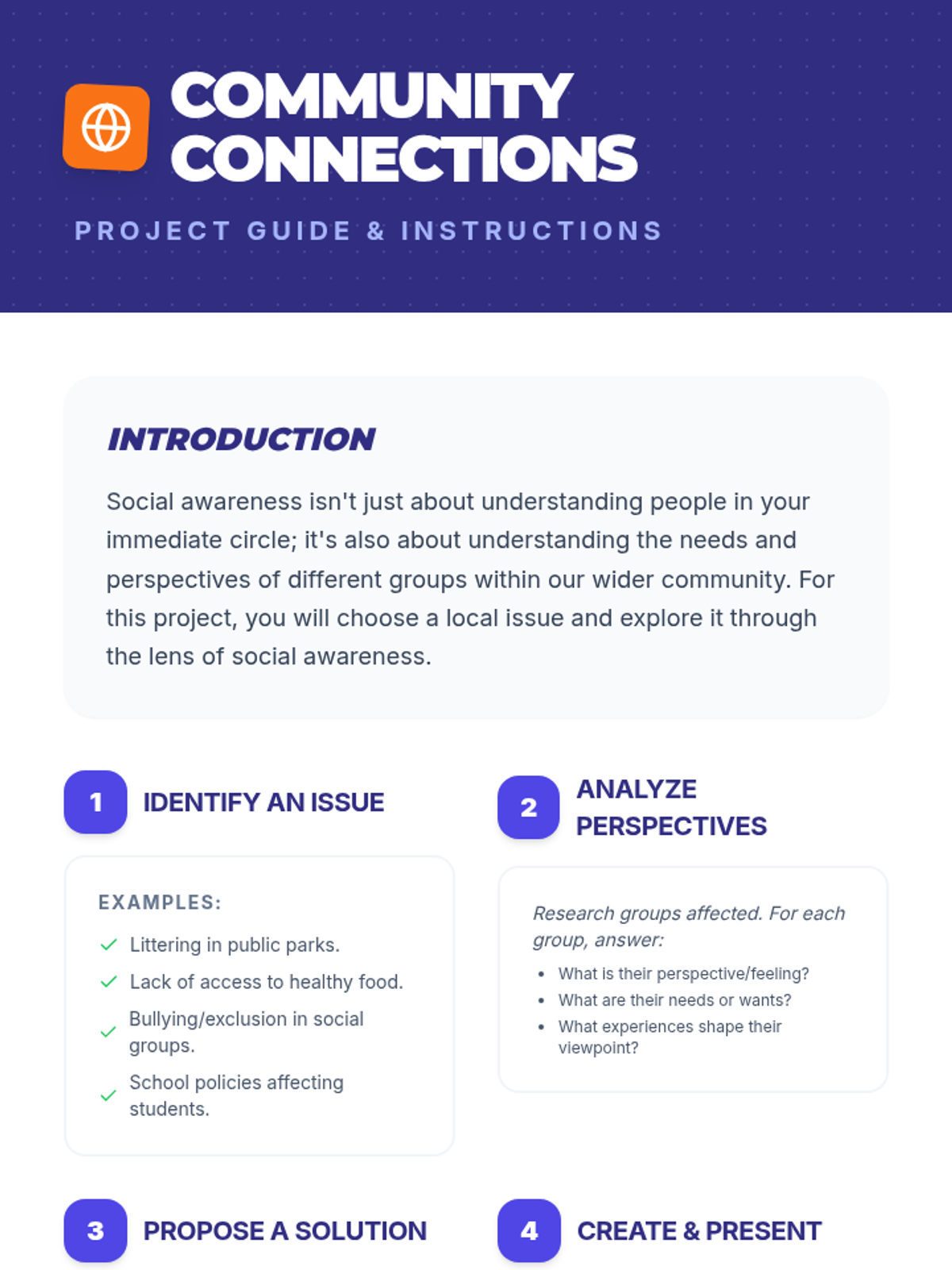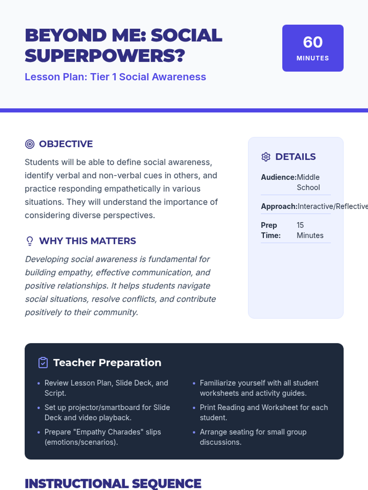 A middle school lesson focused on developing social awareness, empathy, and perspective-taking through interactive activities and real-world application. Students learn to read social cues and understand diverse viewpoints to build a stronger community.