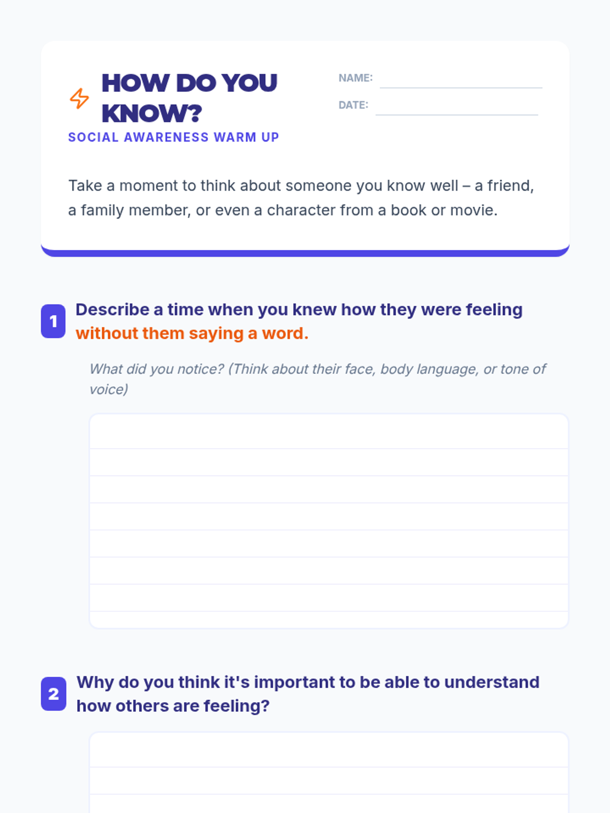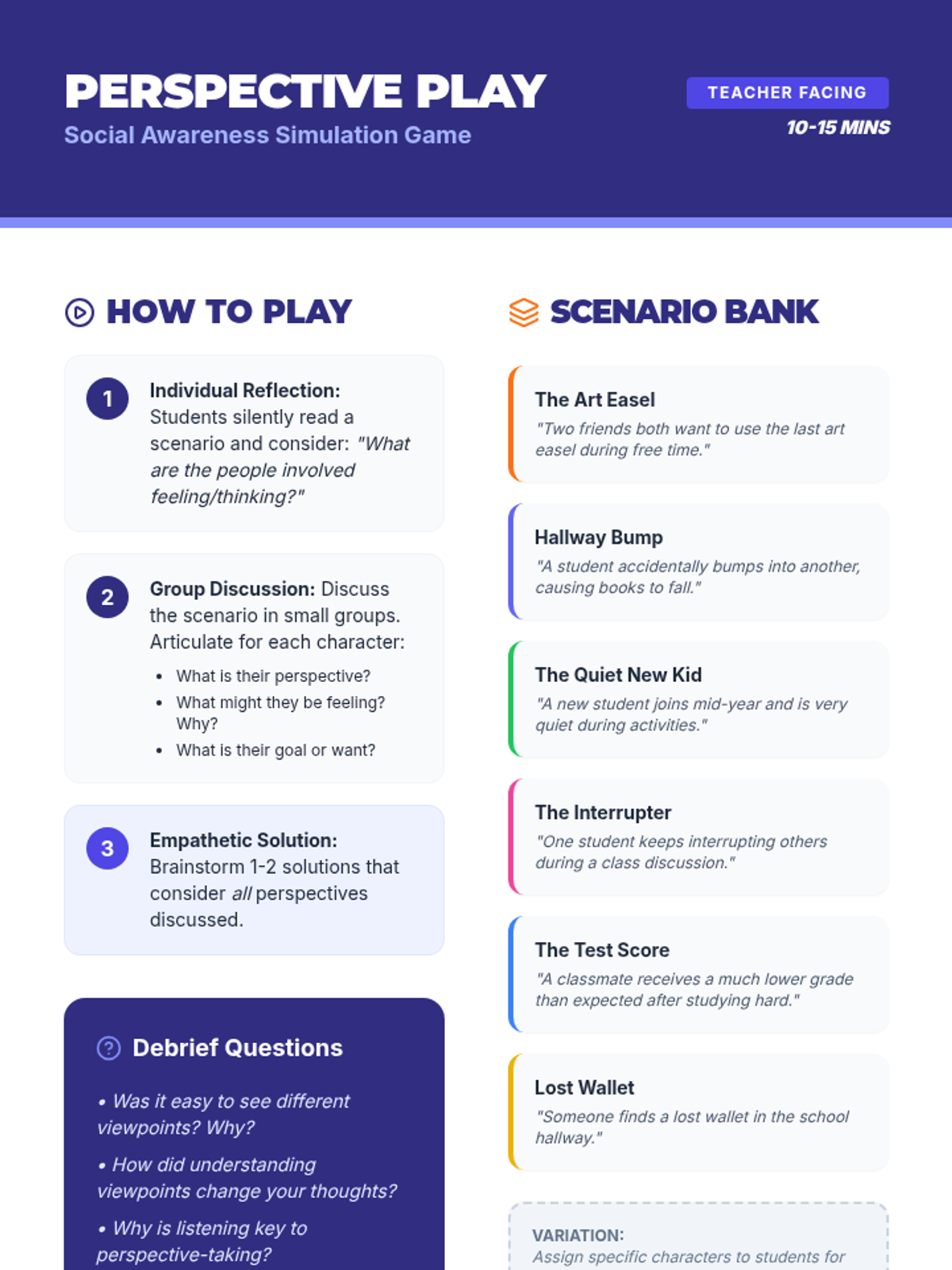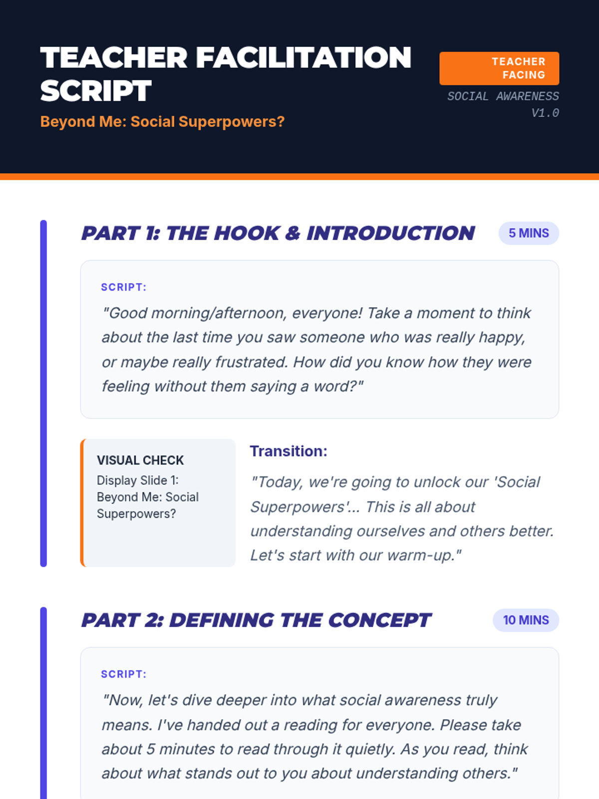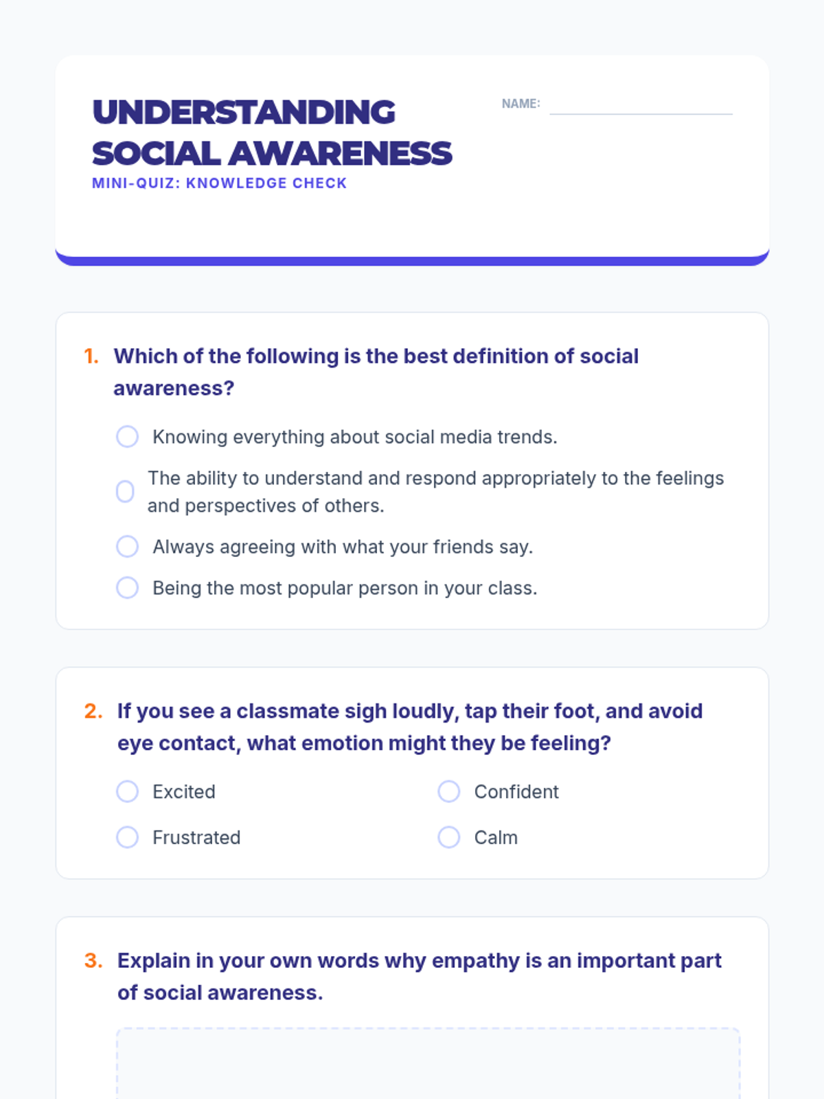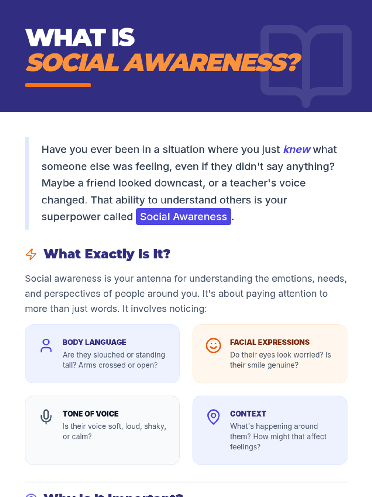 A middle school lesson focused on developing social awareness, empathy, and perspective-taking through interactive activities and real-world application. Students learn to read social cues and understand diverse viewpoints to build a stronger community.