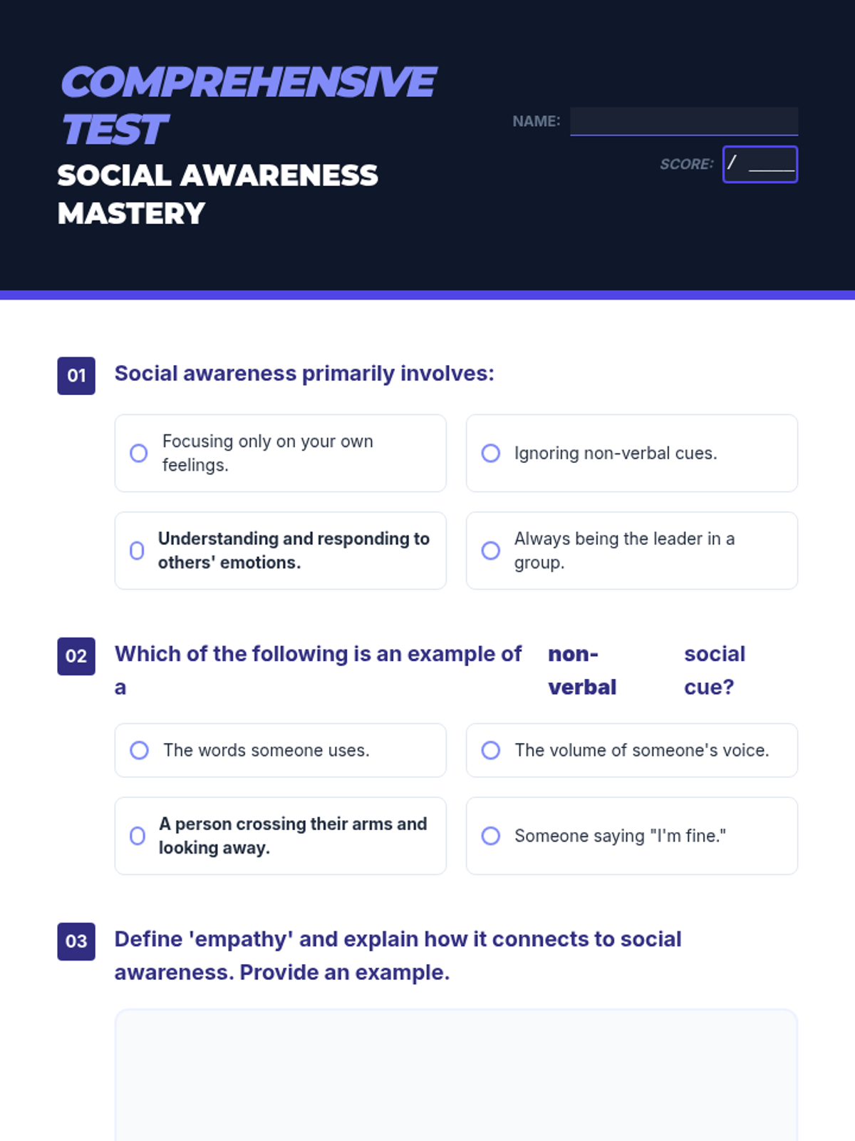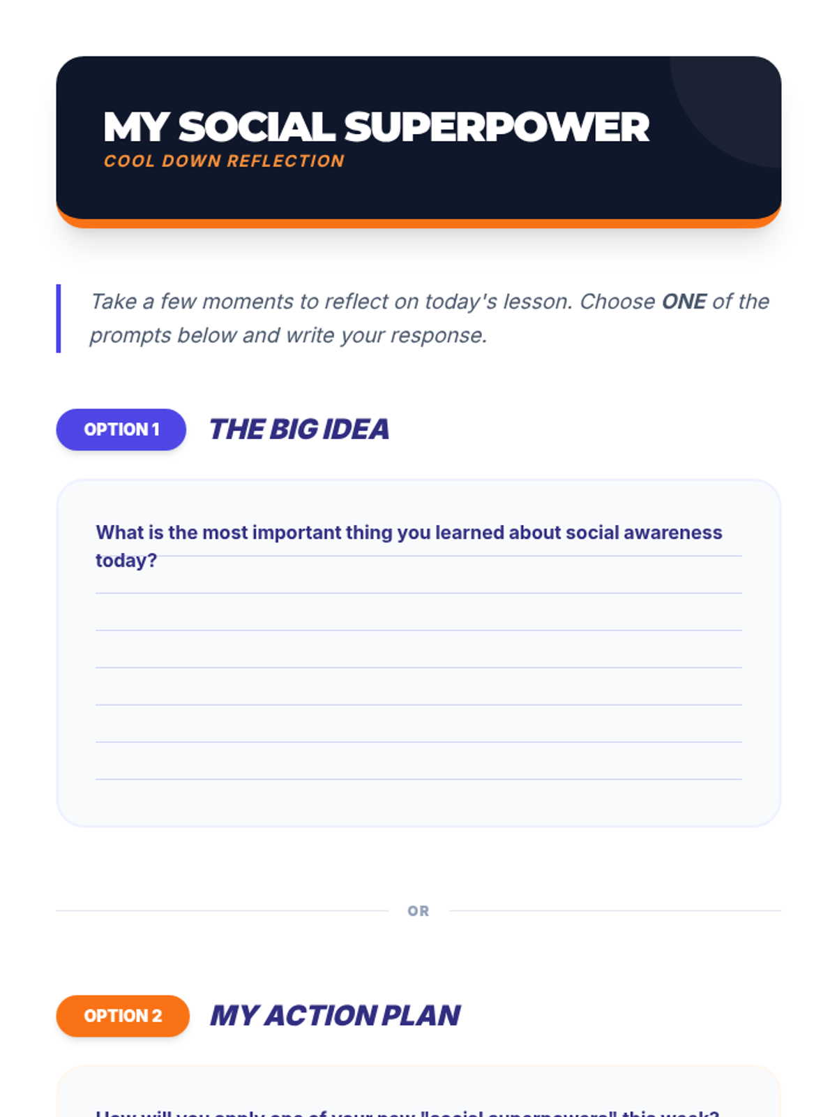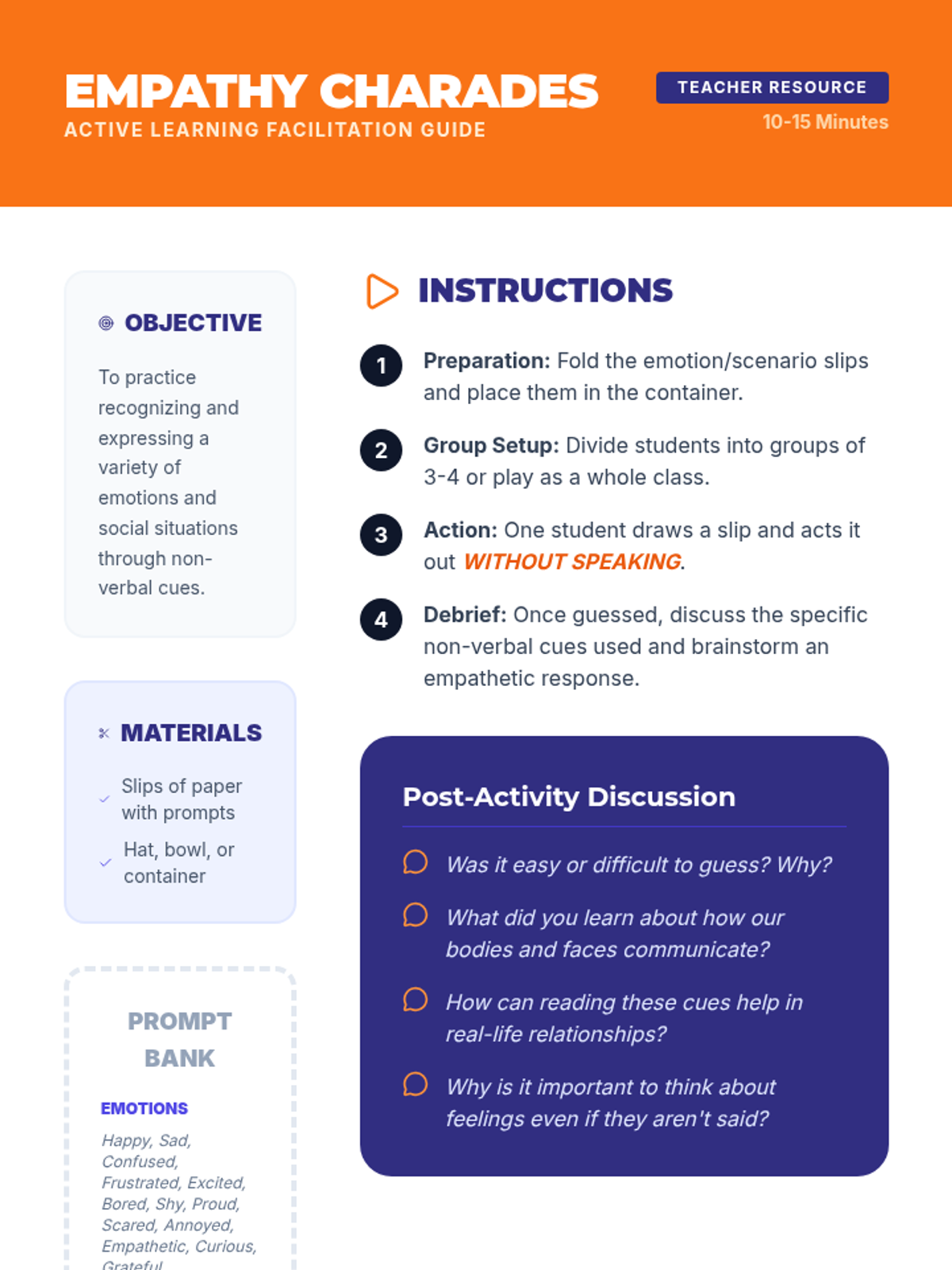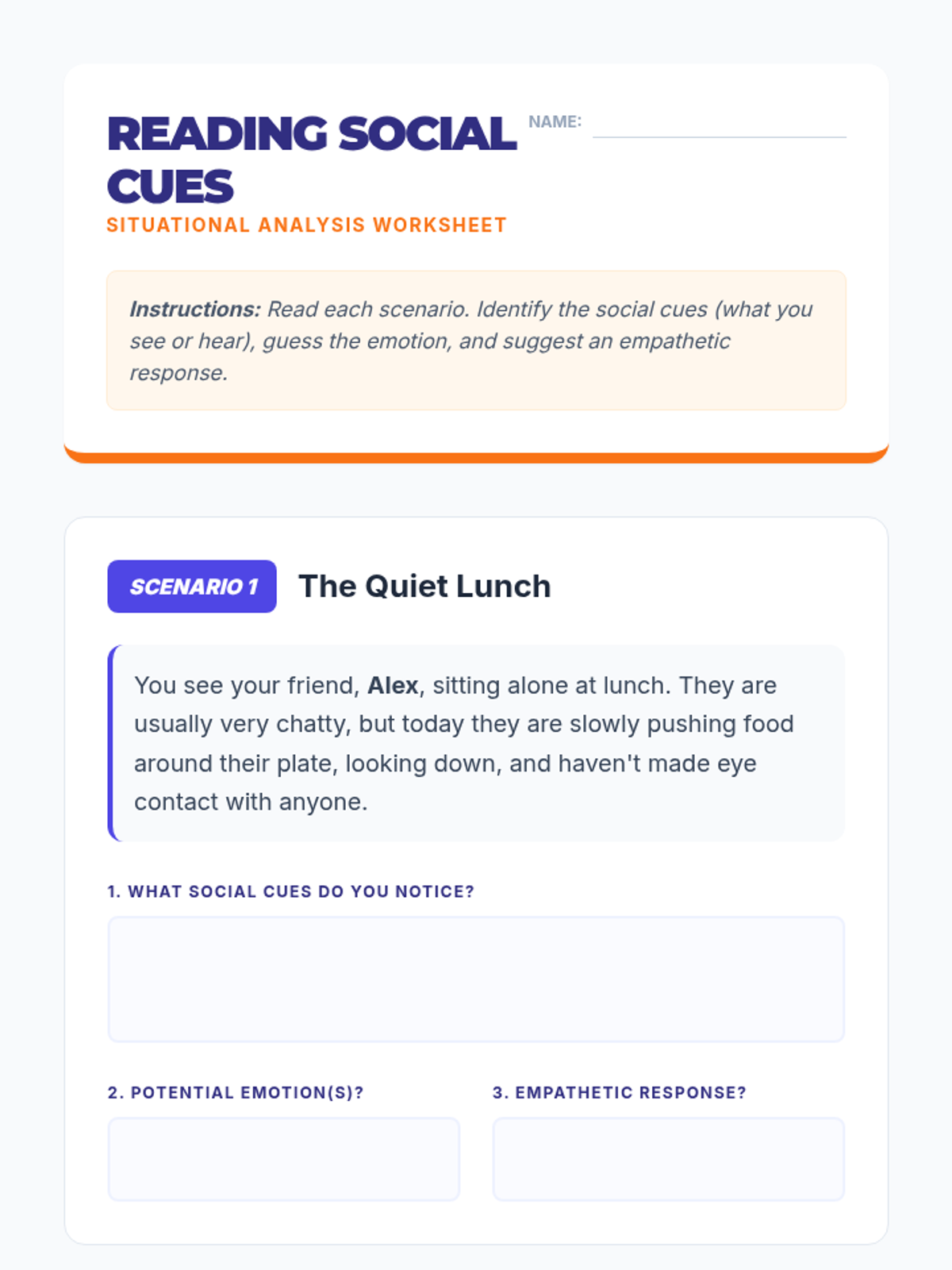A middle school lesson focused on developing social awareness, empathy, and perspective-taking through interactive activities and real-world application. Students learn to read social cues and understand diverse viewpoints to build a stronger community.