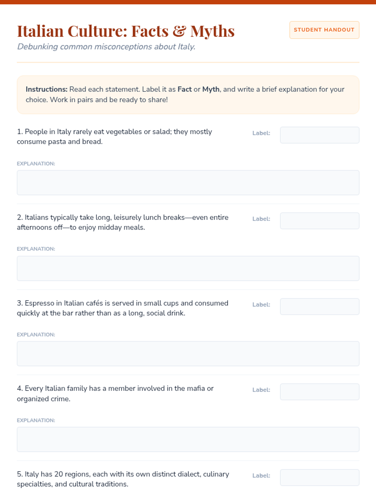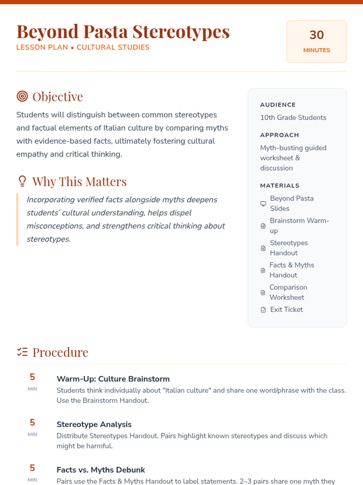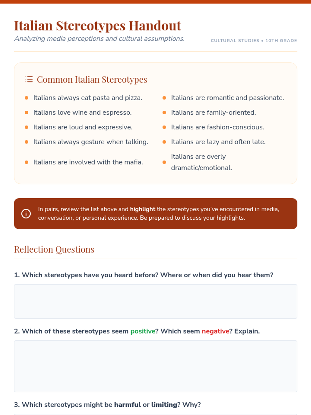 A 30-minute lesson for 10th graders exploring Italian culture, debunking stereotypes, and comparing cultural norms to foster empathy and critical thinking.