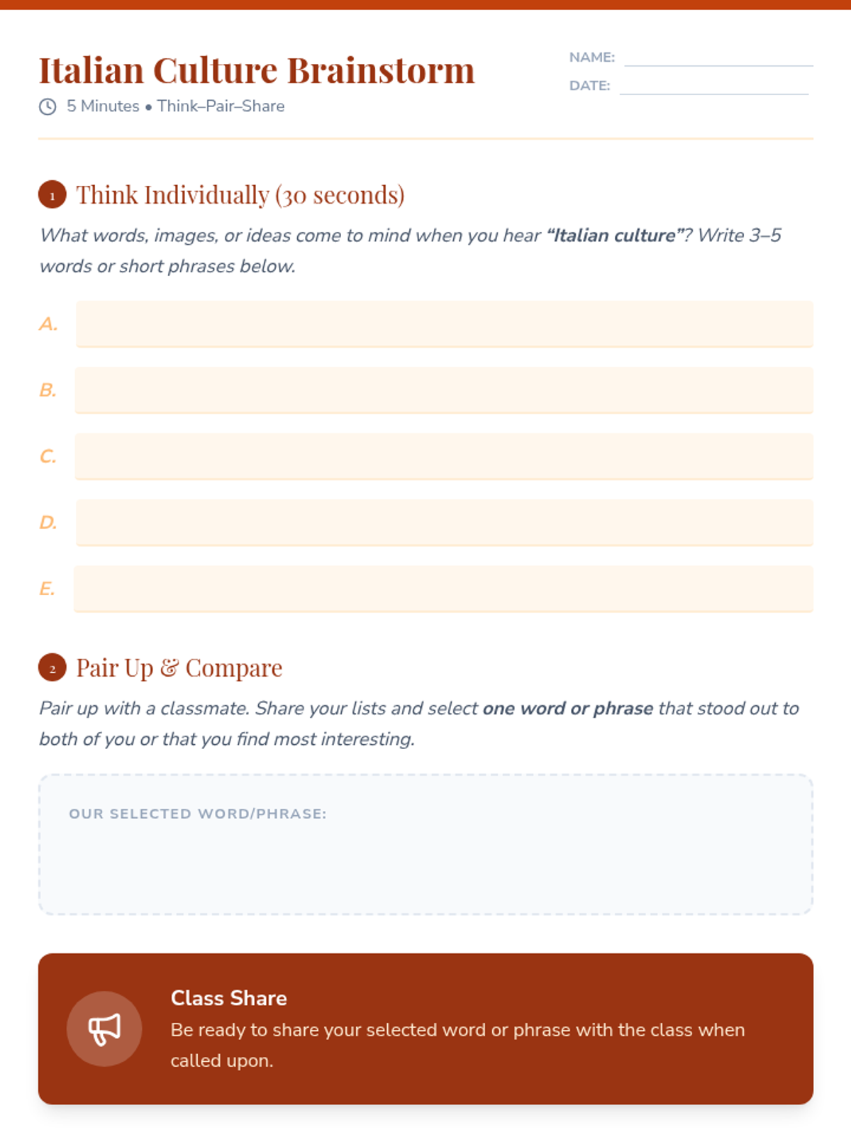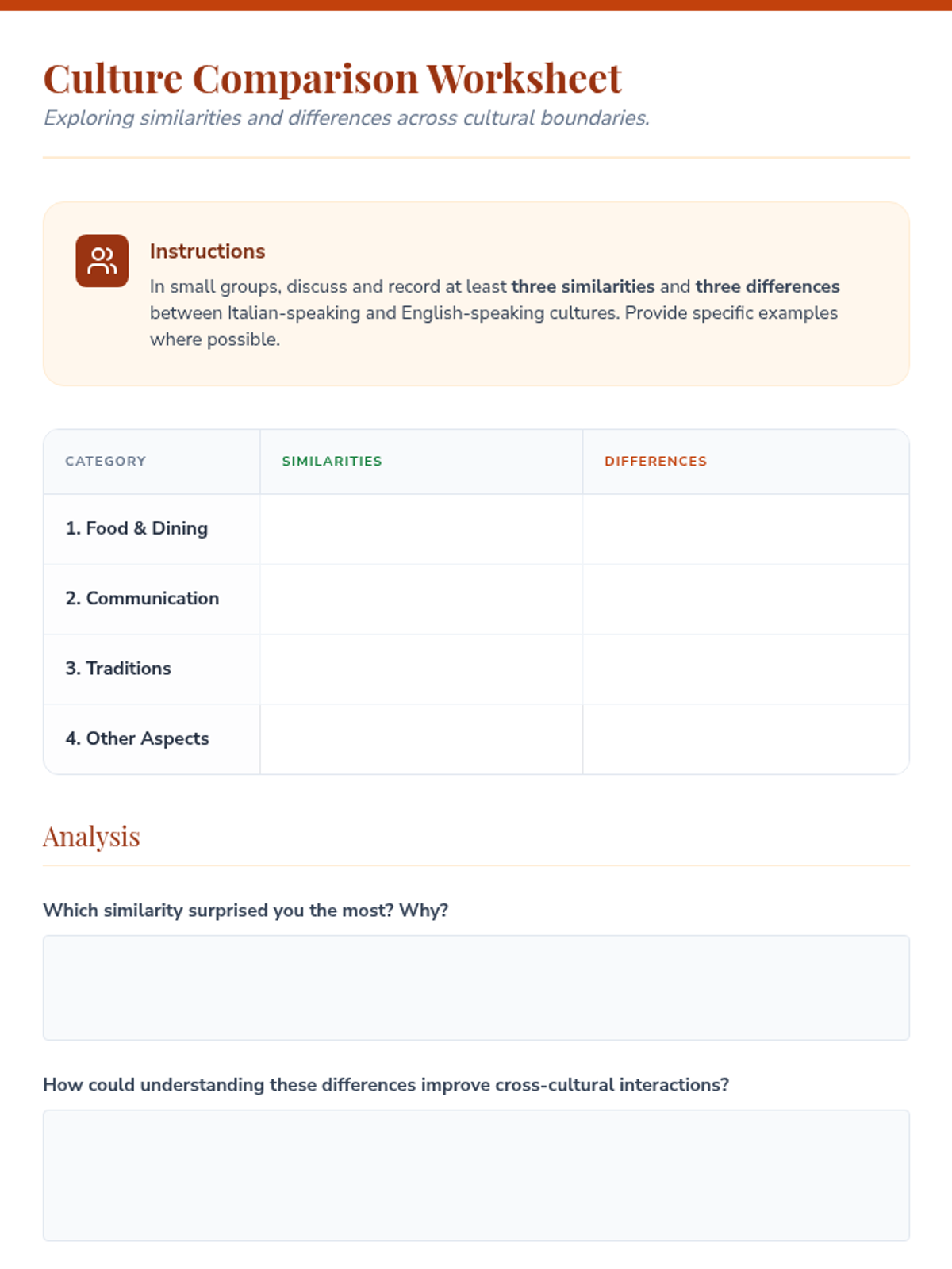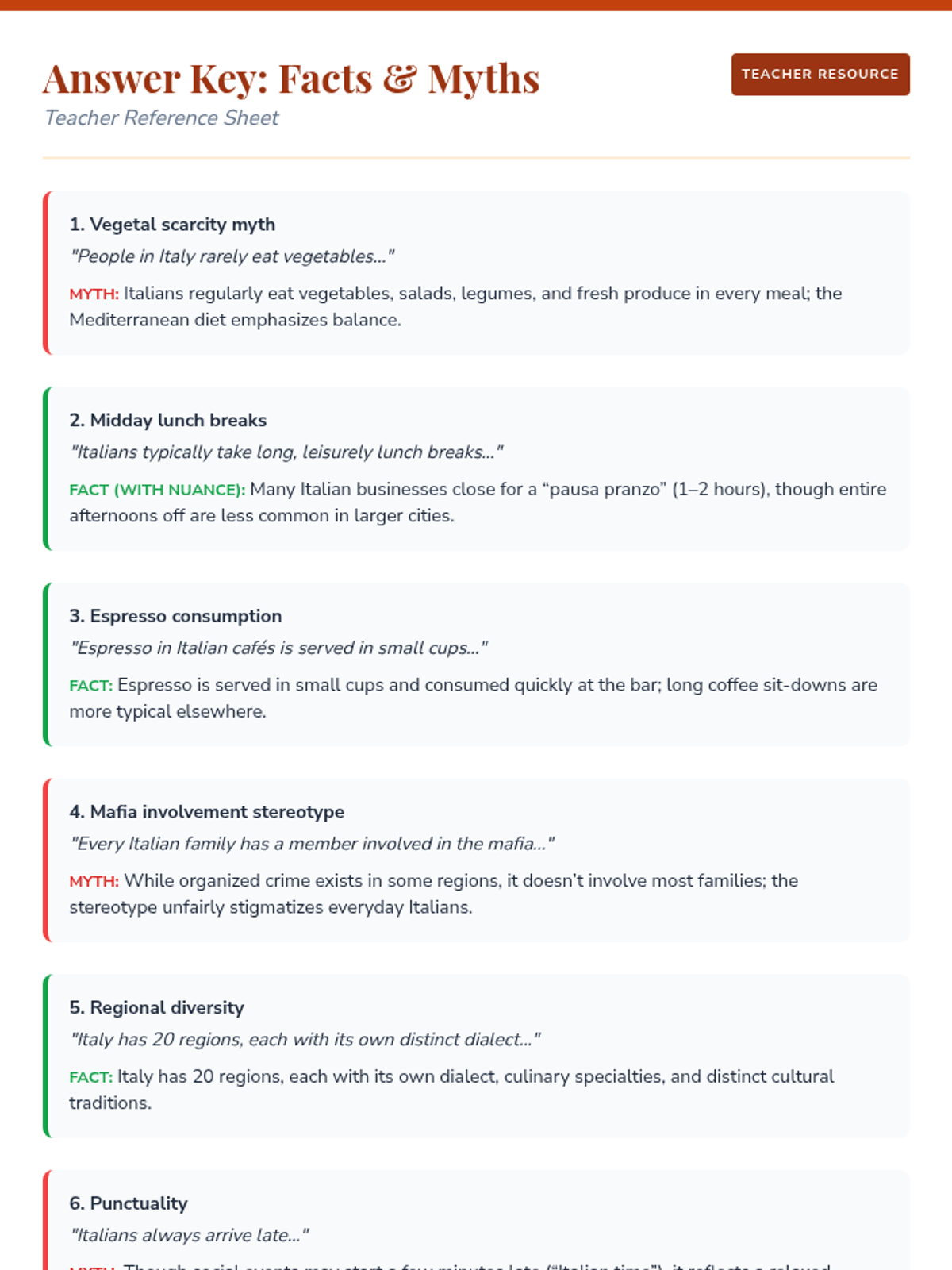 A 30-minute lesson for 10th graders exploring Italian culture, debunking stereotypes, and comparing cultural norms to foster empathy and critical thinking.