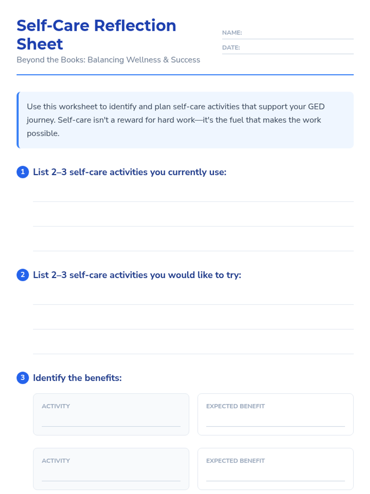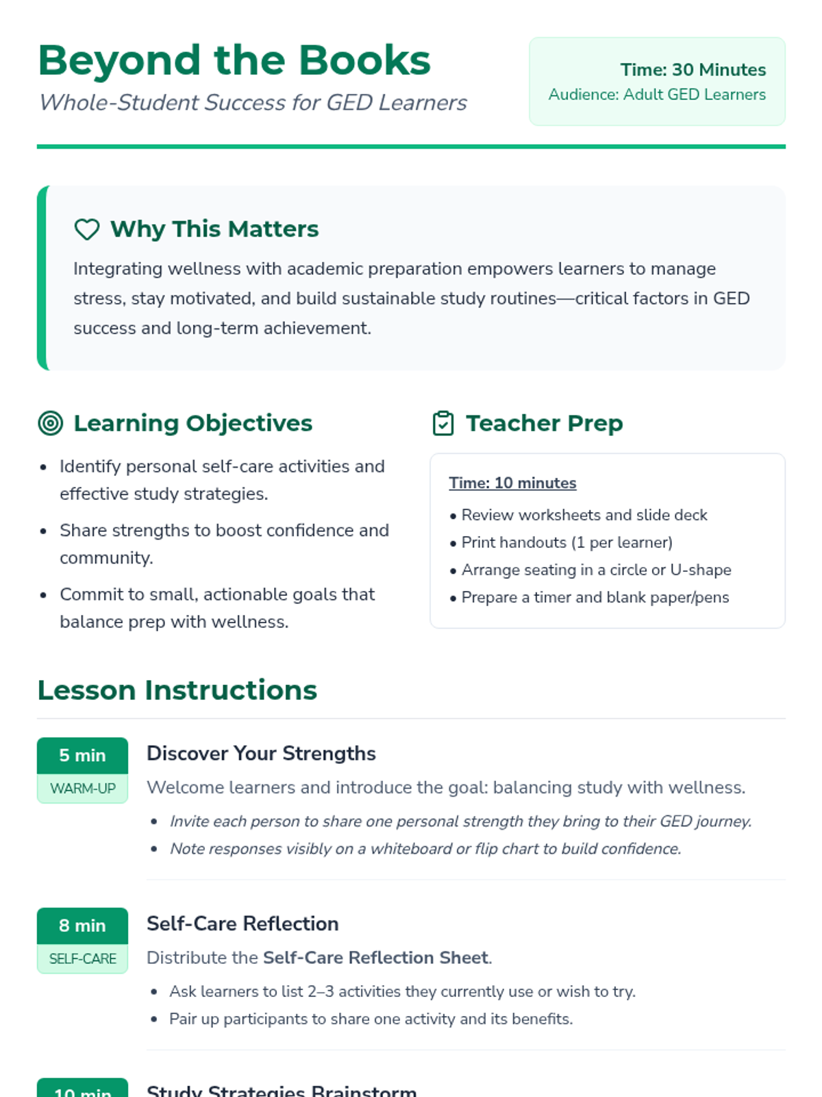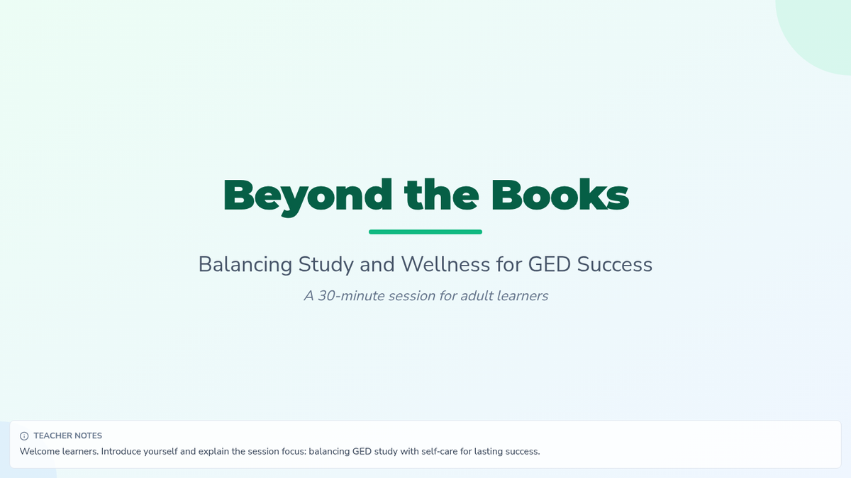 A 30-minute adult GED prep session that integrates study strategies, self-care, and confidence-building for whole-student success. This lesson provides practical tools for balancing academic preparation with personal wellness.