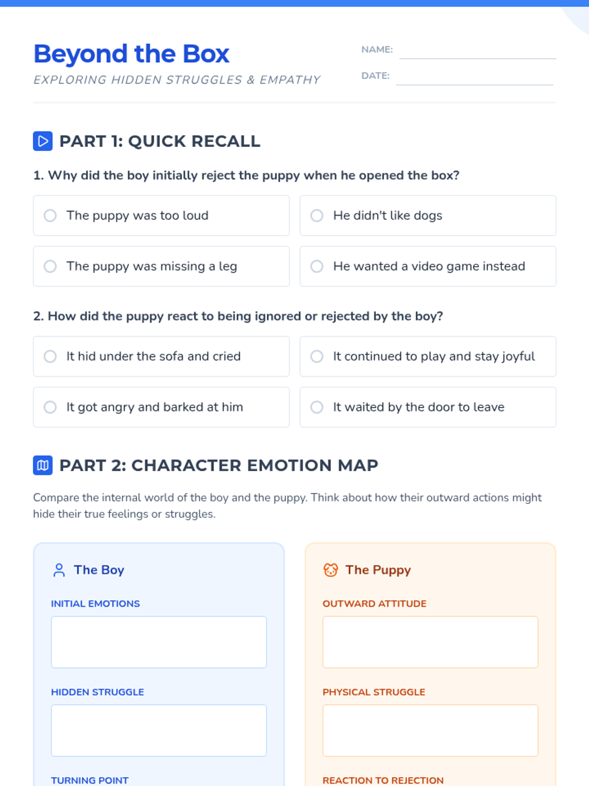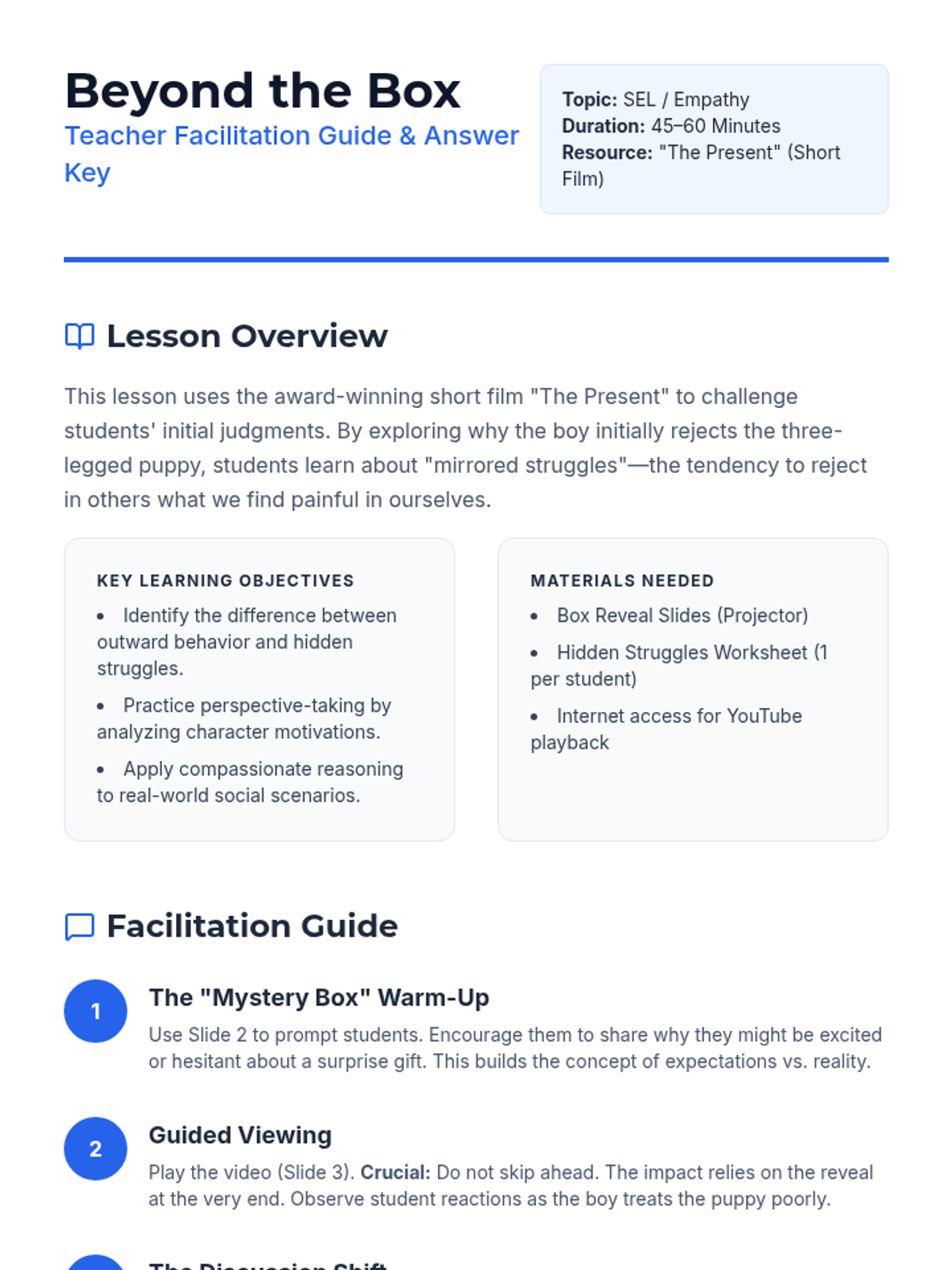 A Social Emotional Learning lesson centered on the short film 'The Present' to explore themes of judgment, empathy, and hidden struggles. Students practice perspective-taking by analyzing character emotions and applying compassion to real-world scenarios.