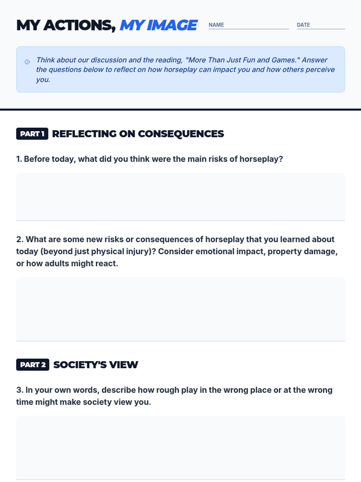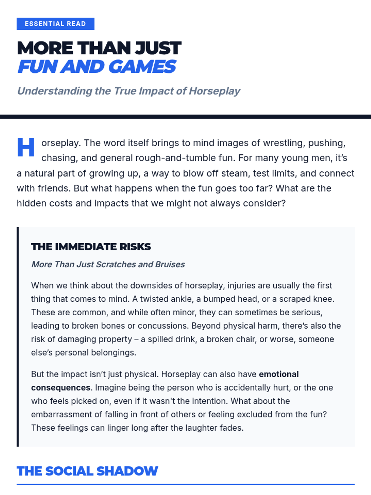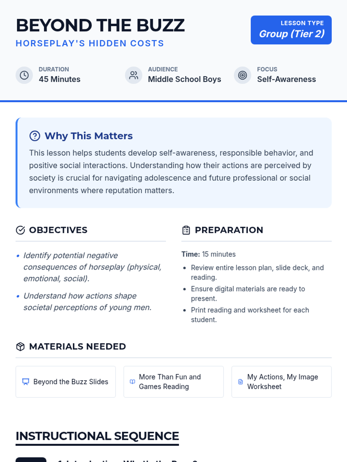 A 45-minute lesson for middle school boys exploring the hidden physical, emotional, and social consequences of horseplay, with a focus on societal perceptions and self-awareness.