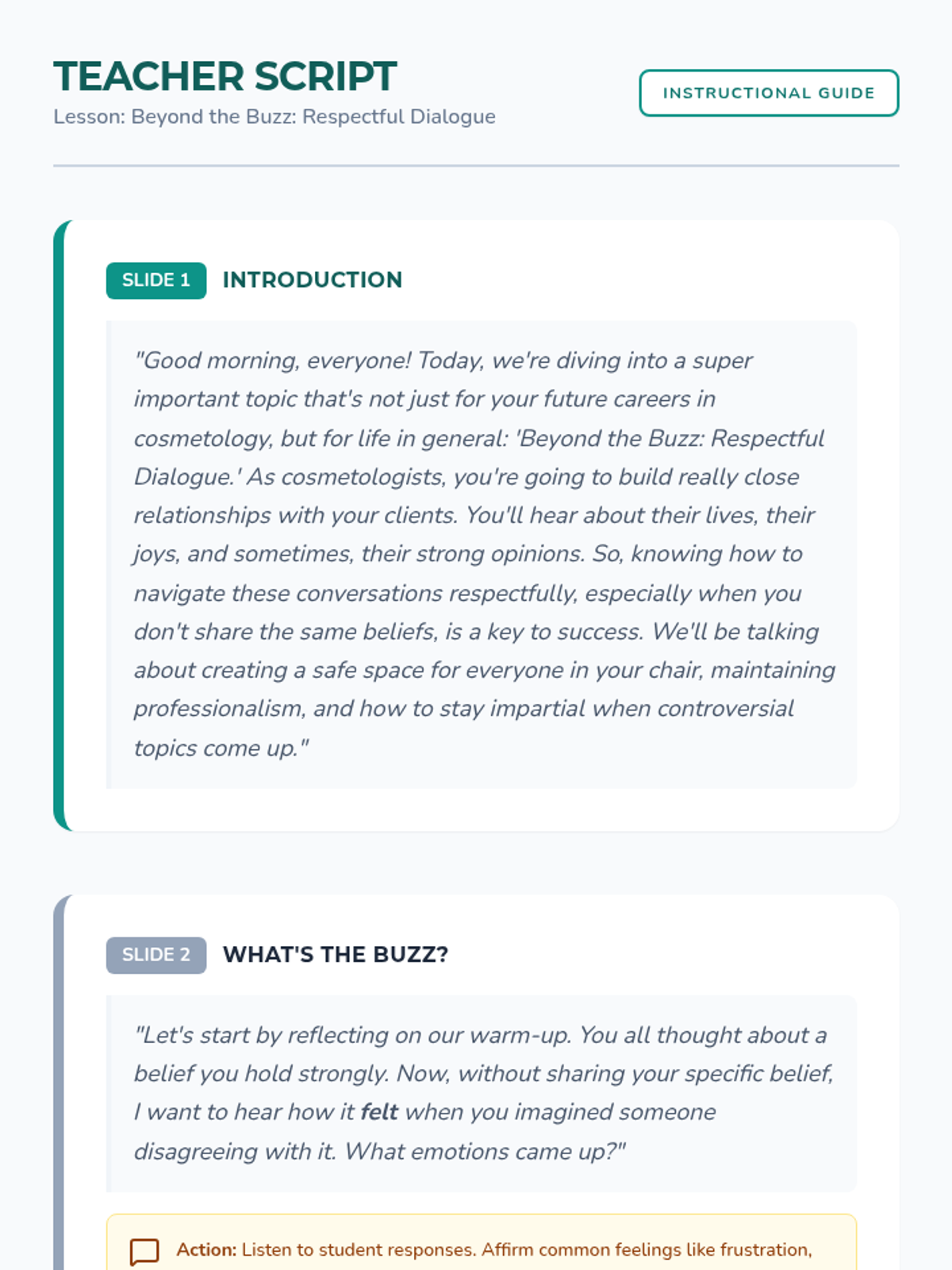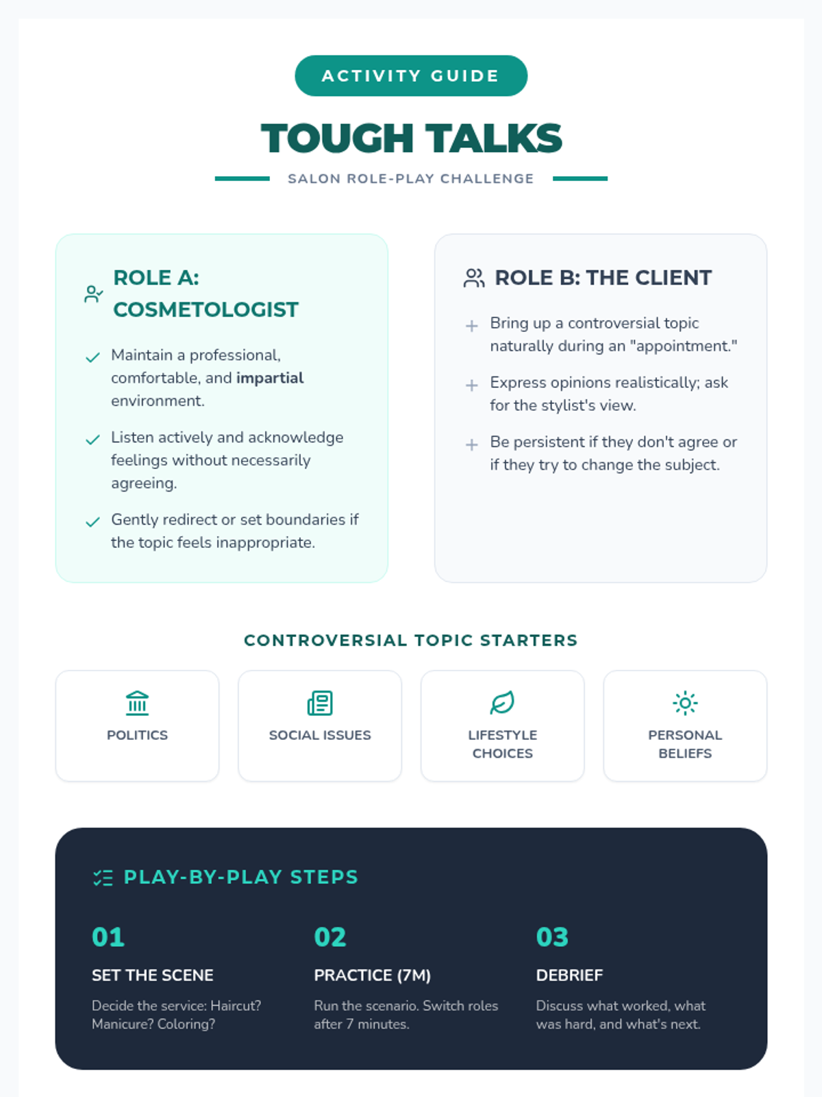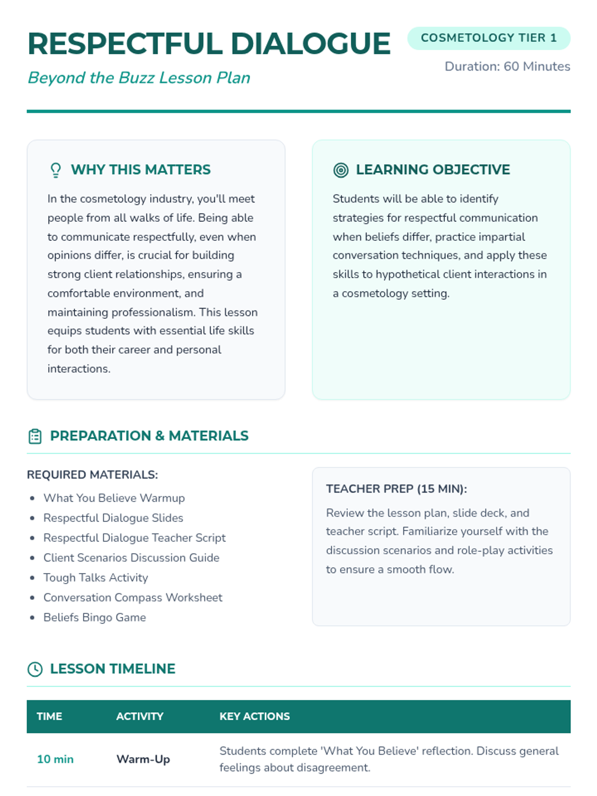 A 60-minute lesson for 10th-grade cosmetology students focused on navigating sensitive conversations with clients through respectful dialogue, impartiality, and active listening.