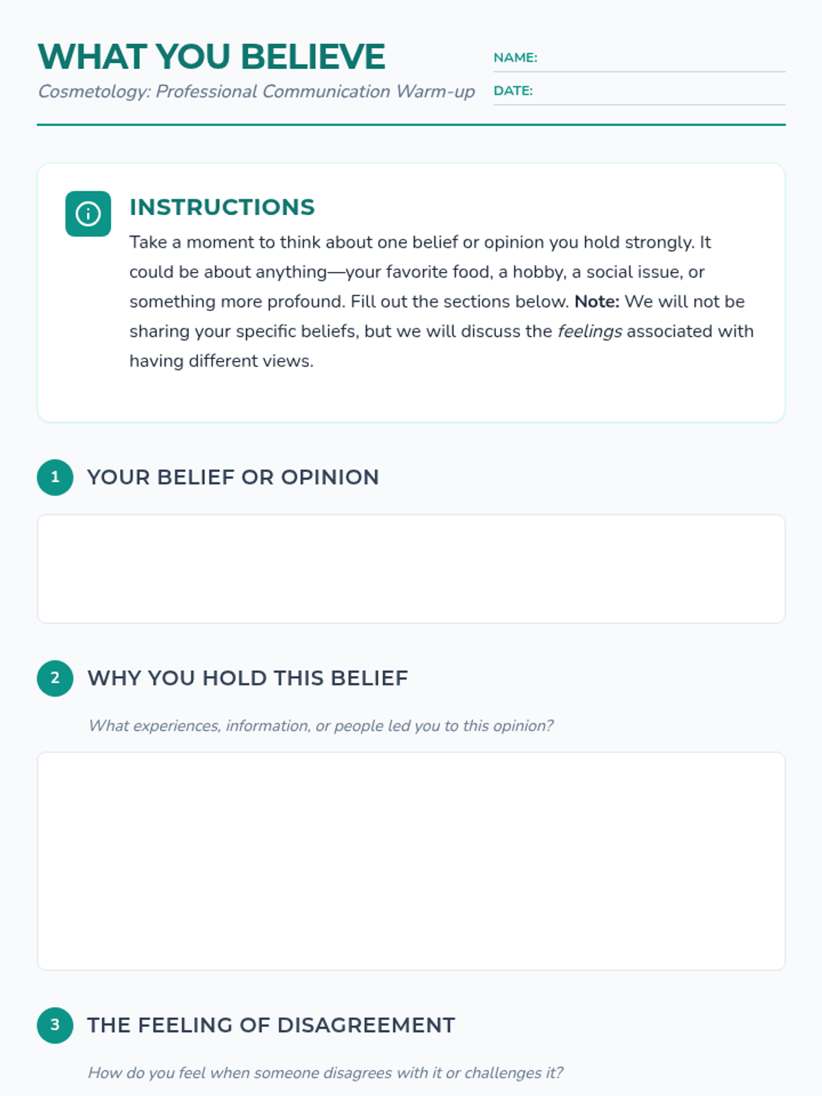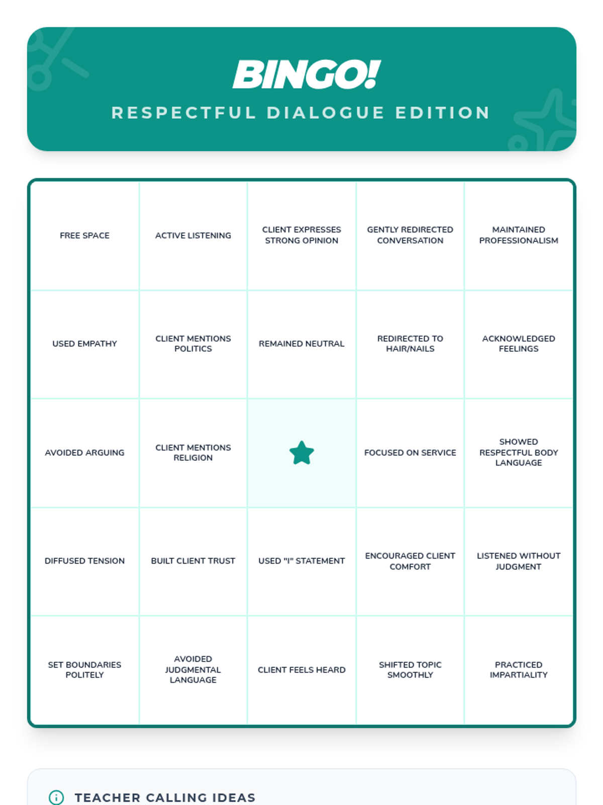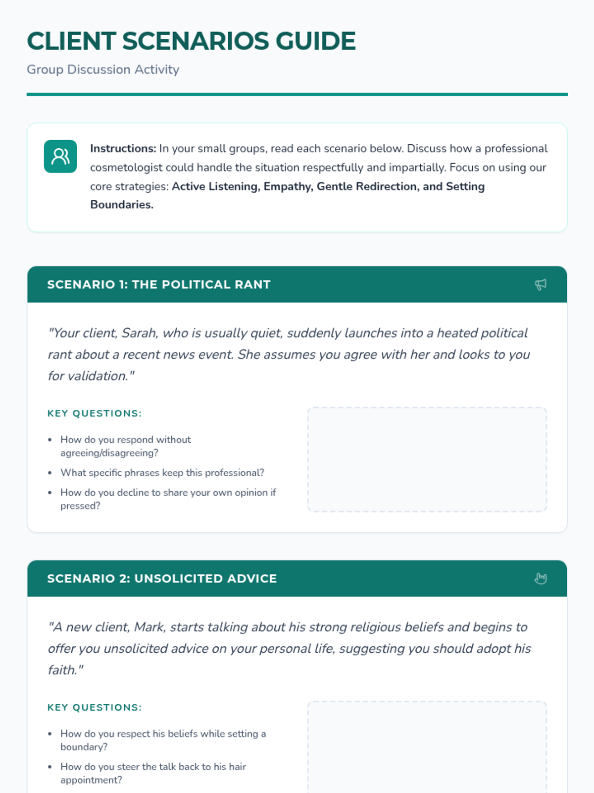 A 60-minute lesson for 10th-grade cosmetology students focused on navigating sensitive conversations with clients through respectful dialogue, impartiality, and active listening.