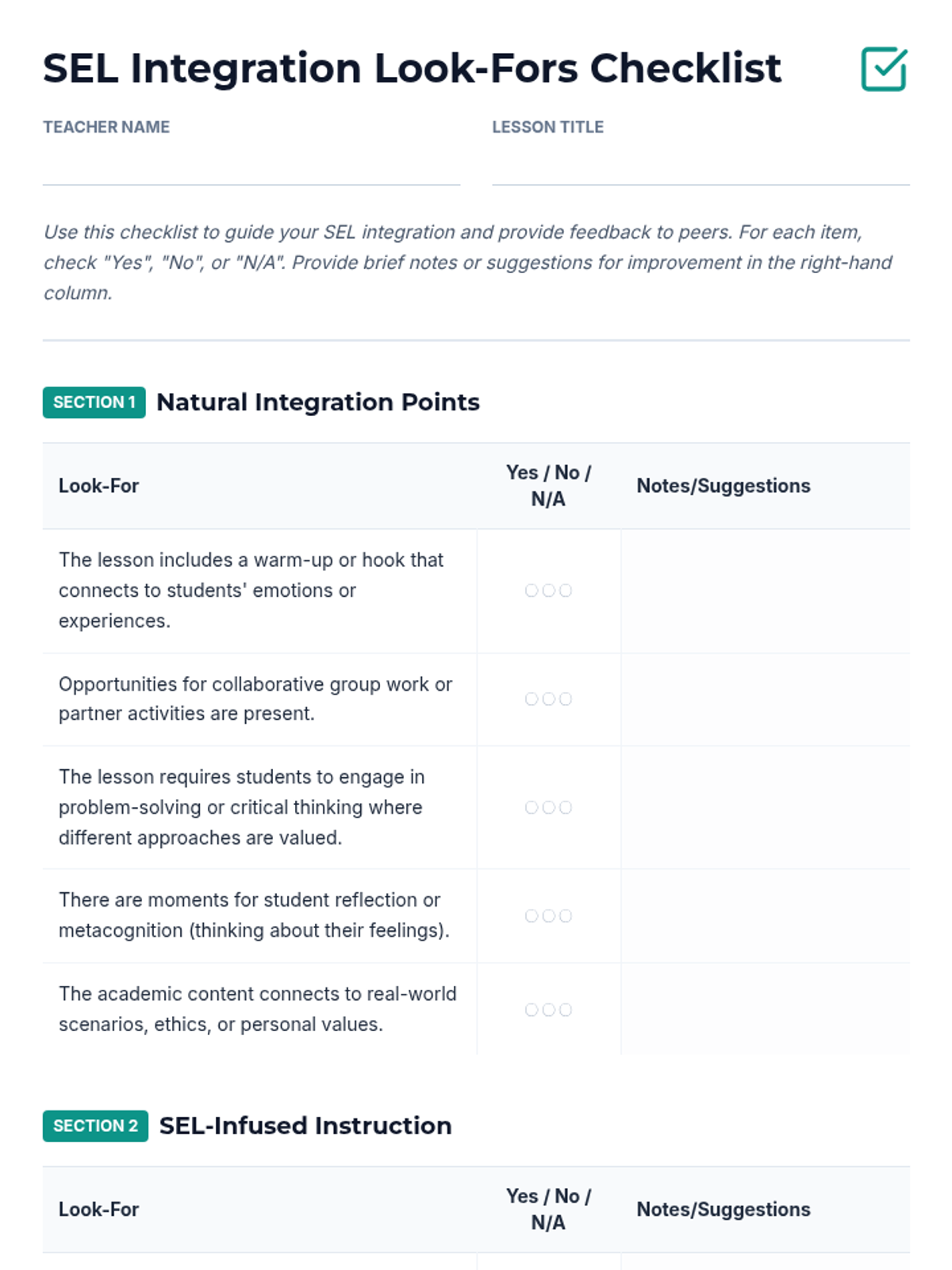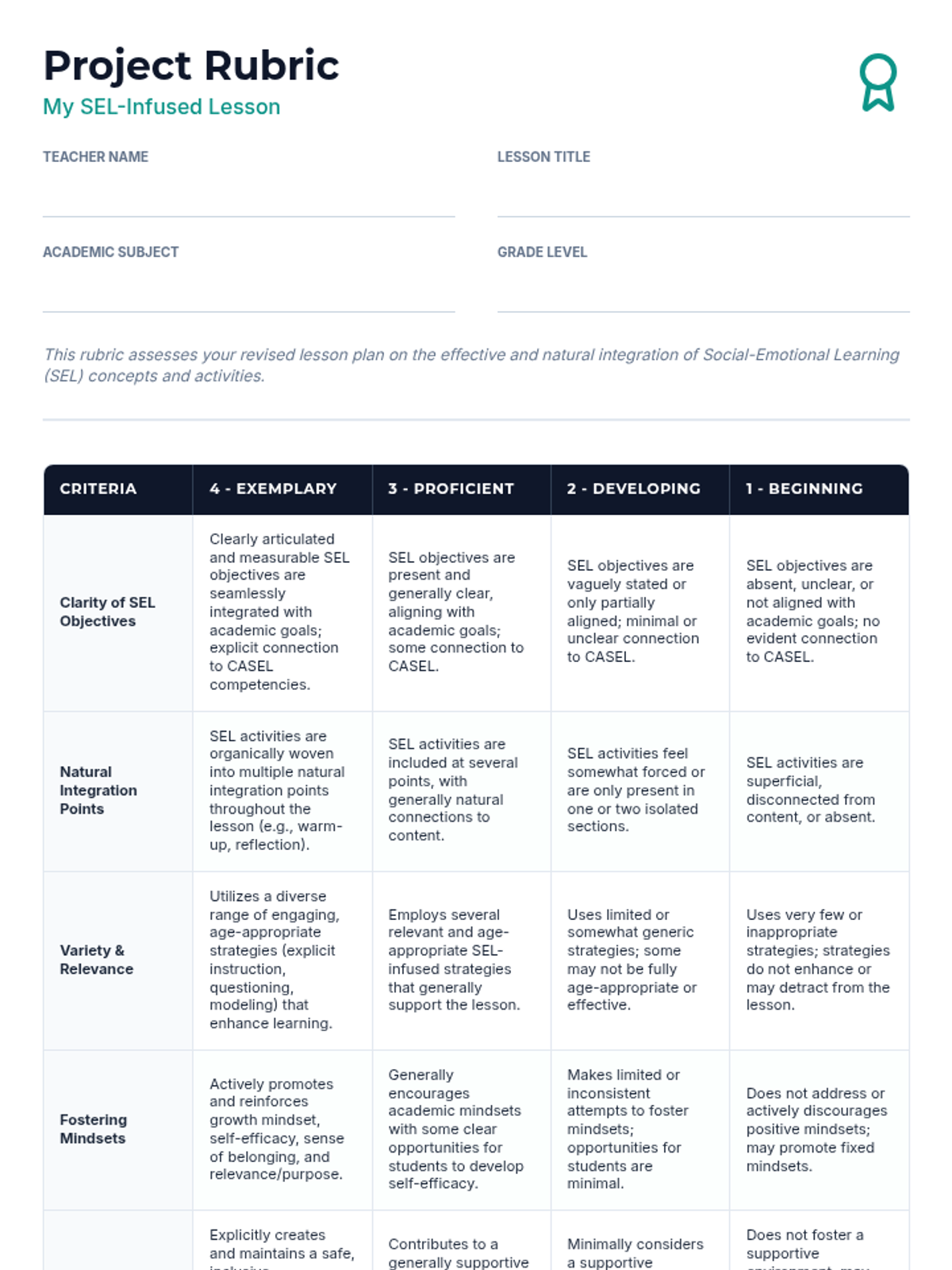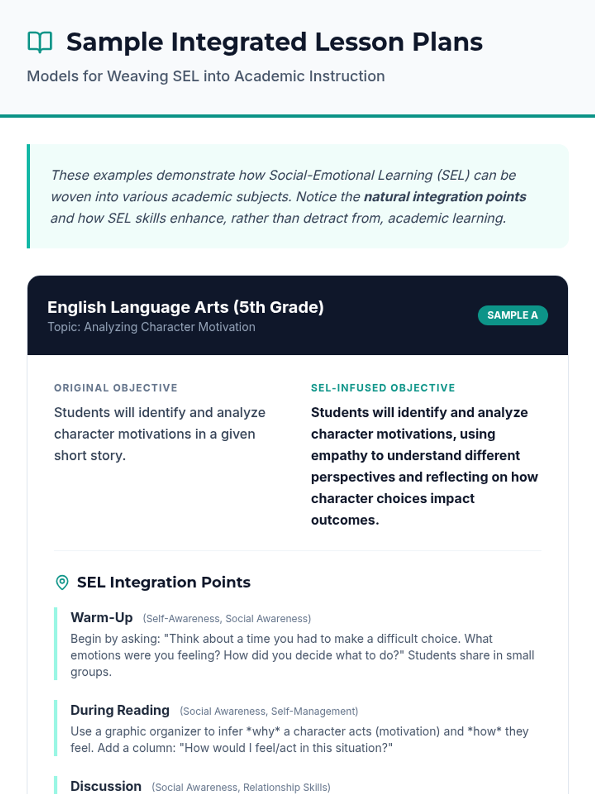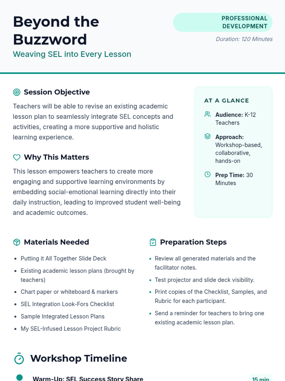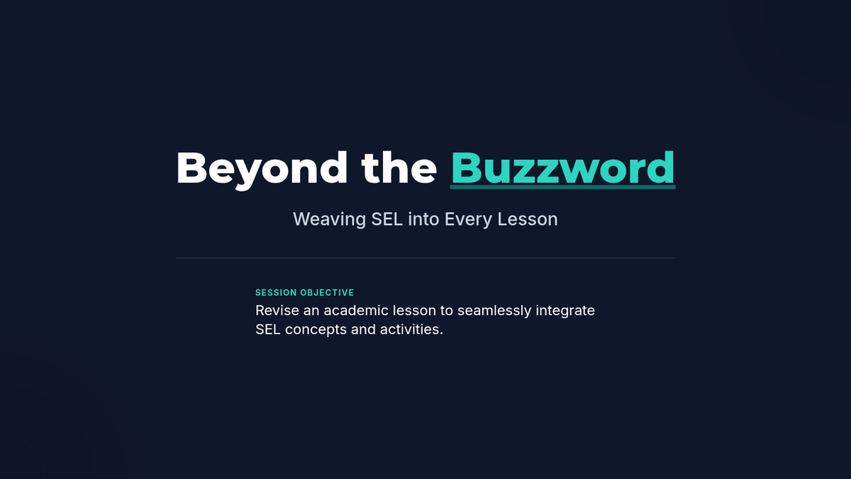 A 120-minute professional development workshop for K-12 teachers focused on identifying natural integration points for Social-Emotional Learning (SEL) within existing academic curricula. Teachers will learn practical strategies to foster academic mindsets and create supportive learning environments without sacrificing academic rigor.