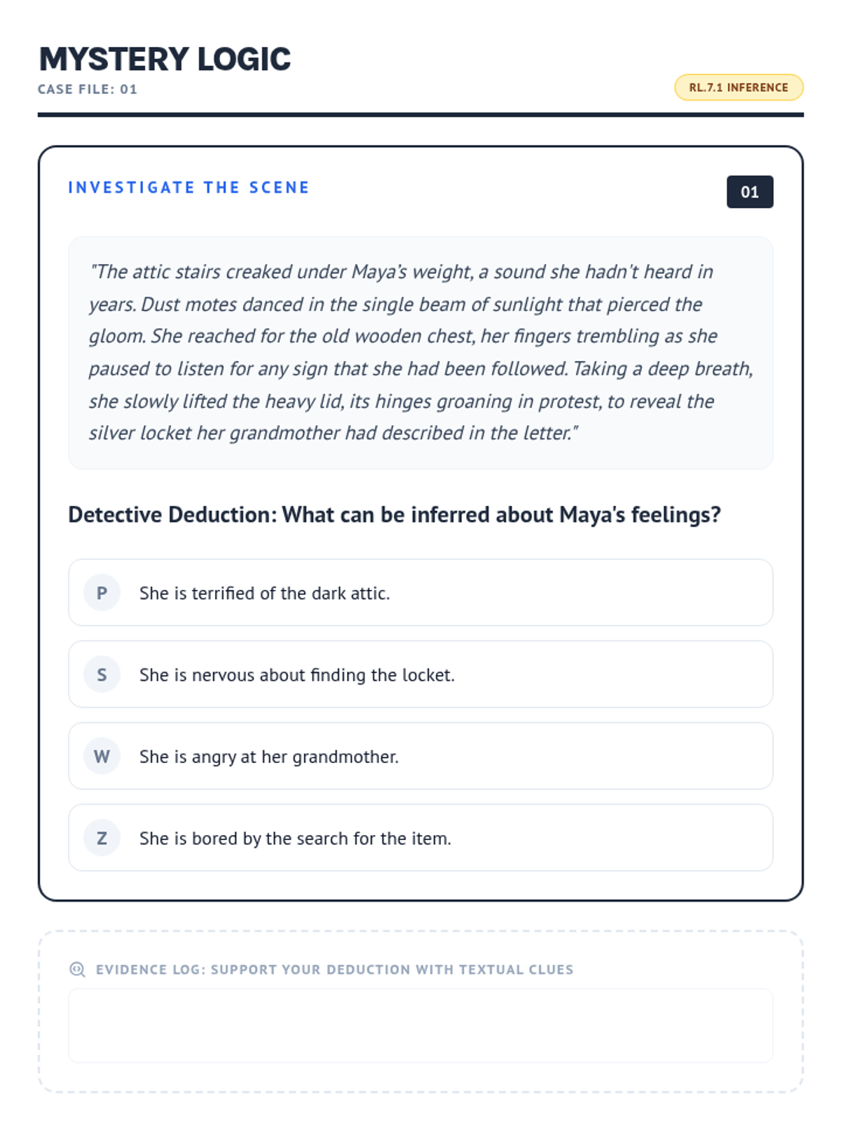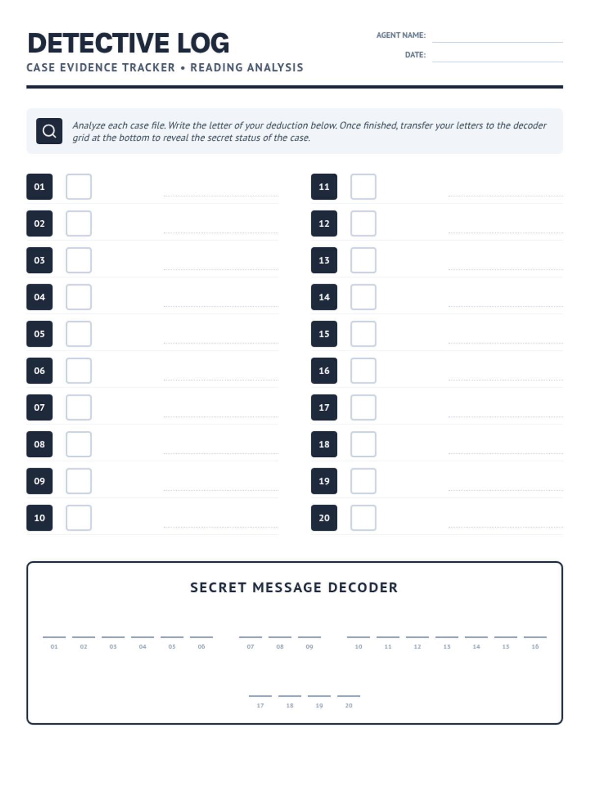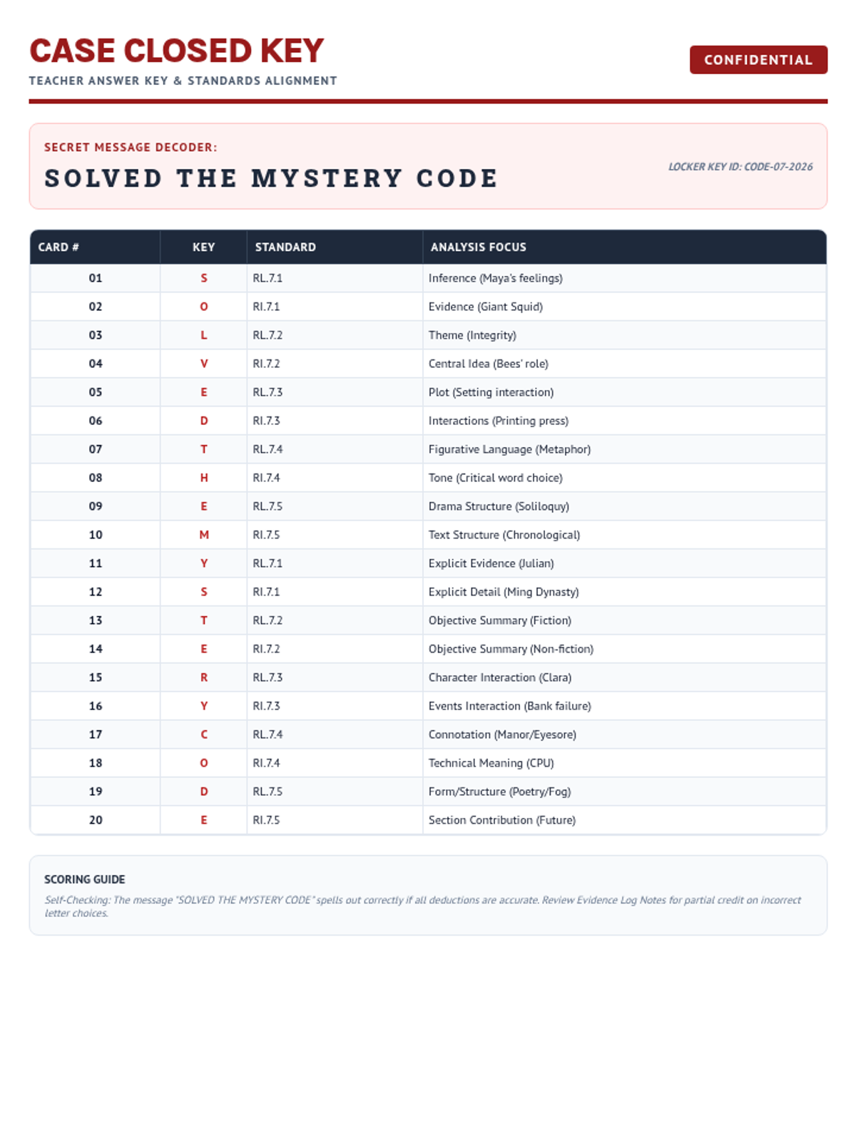 A comprehensive set of 20 task cards and supporting materials designed to review Grade 7 RL and RI standards (7.1-7.5) through short texts and multiple-choice questions. Students act as detectives to solve reading comprehension 'cases' using evidence and analysis.