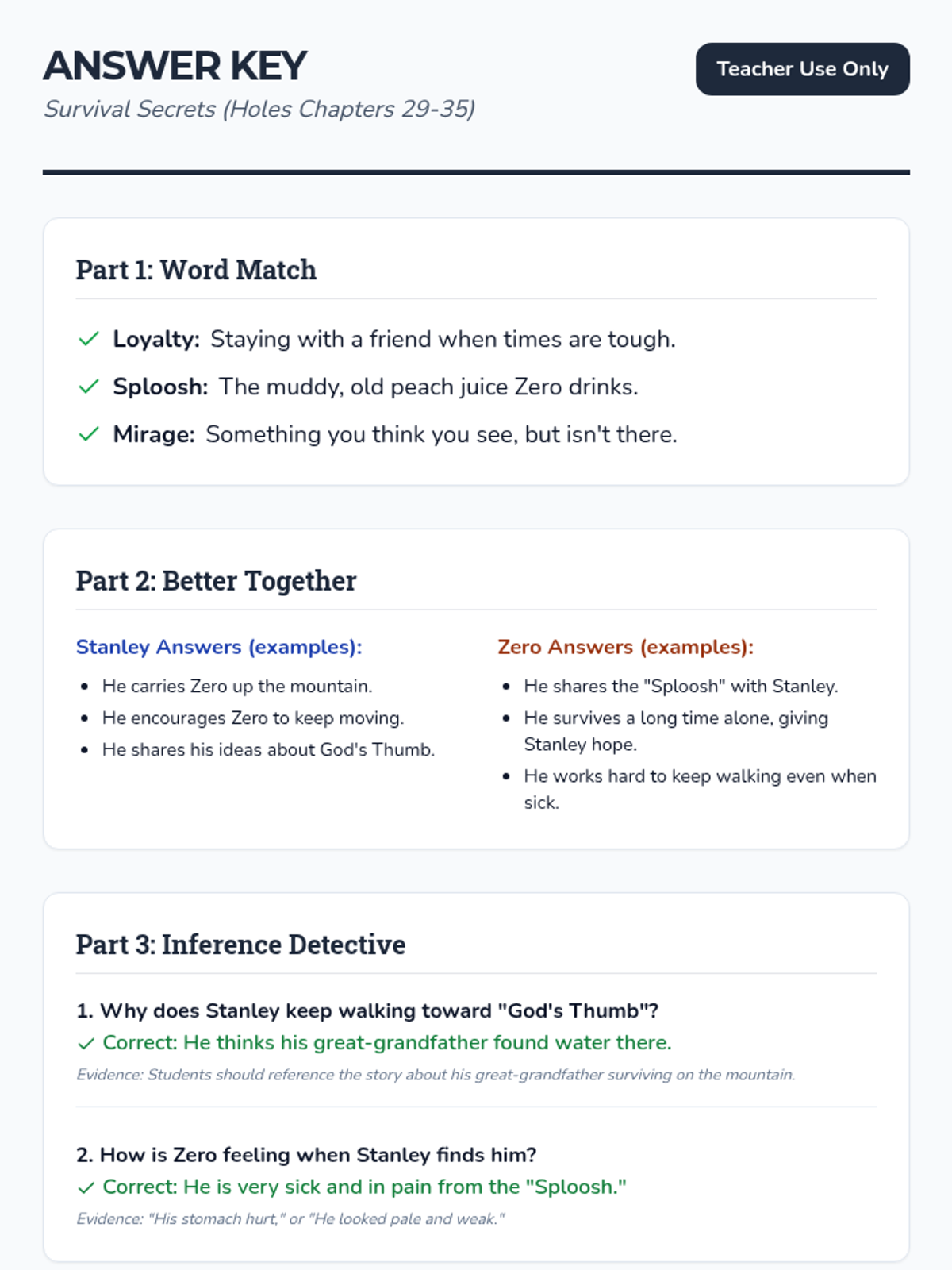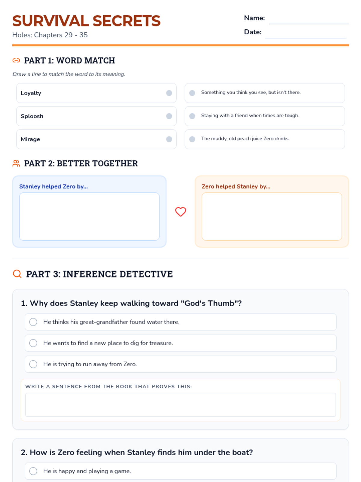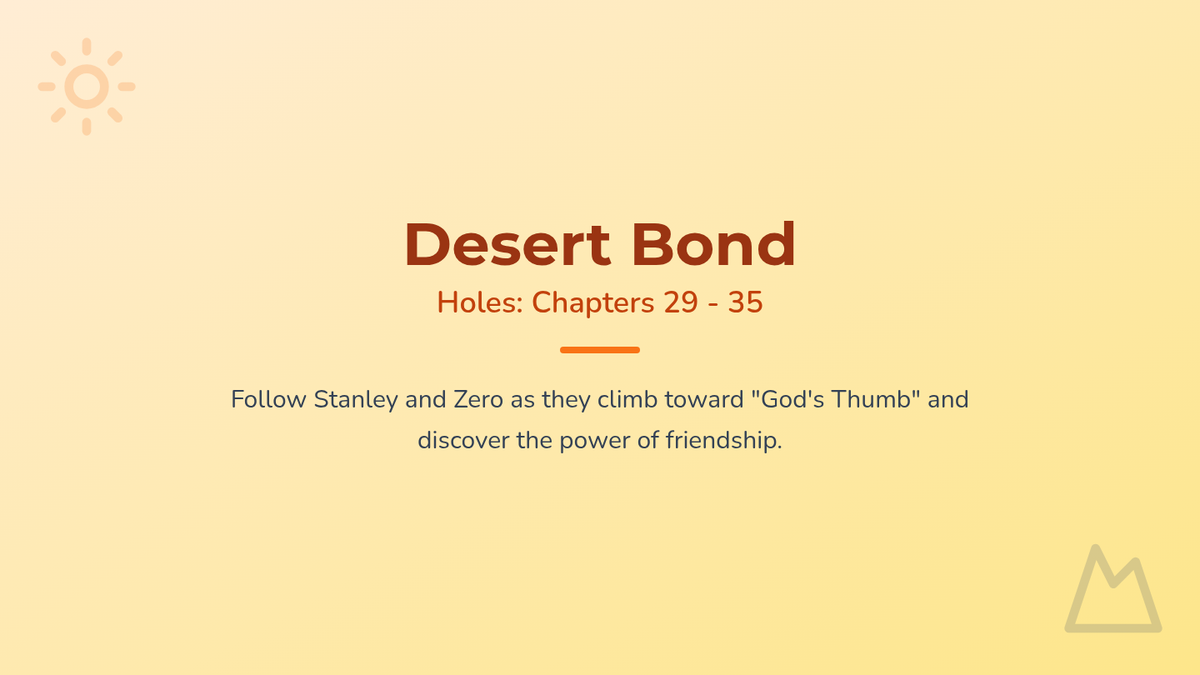 A lesson focused on chapters 29-35 of Louis Sachar's Holes, exploring the deepening friendship between Stanley and Zero as they face the challenges of the desert. Students will analyze character relationships, make inferences about their survival, and identify the central theme of loyalty.