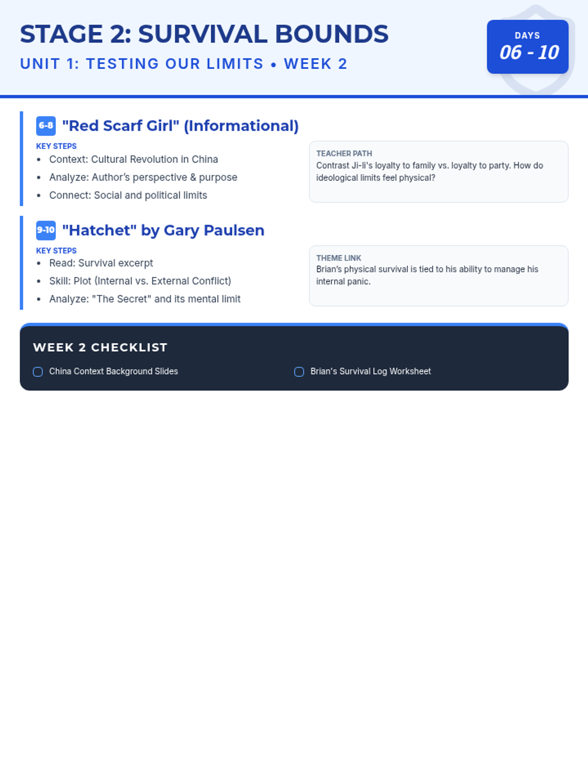 Exploring cultural pressure and physical survival through 'Red Scarf Girl' and 'Hatchet'.