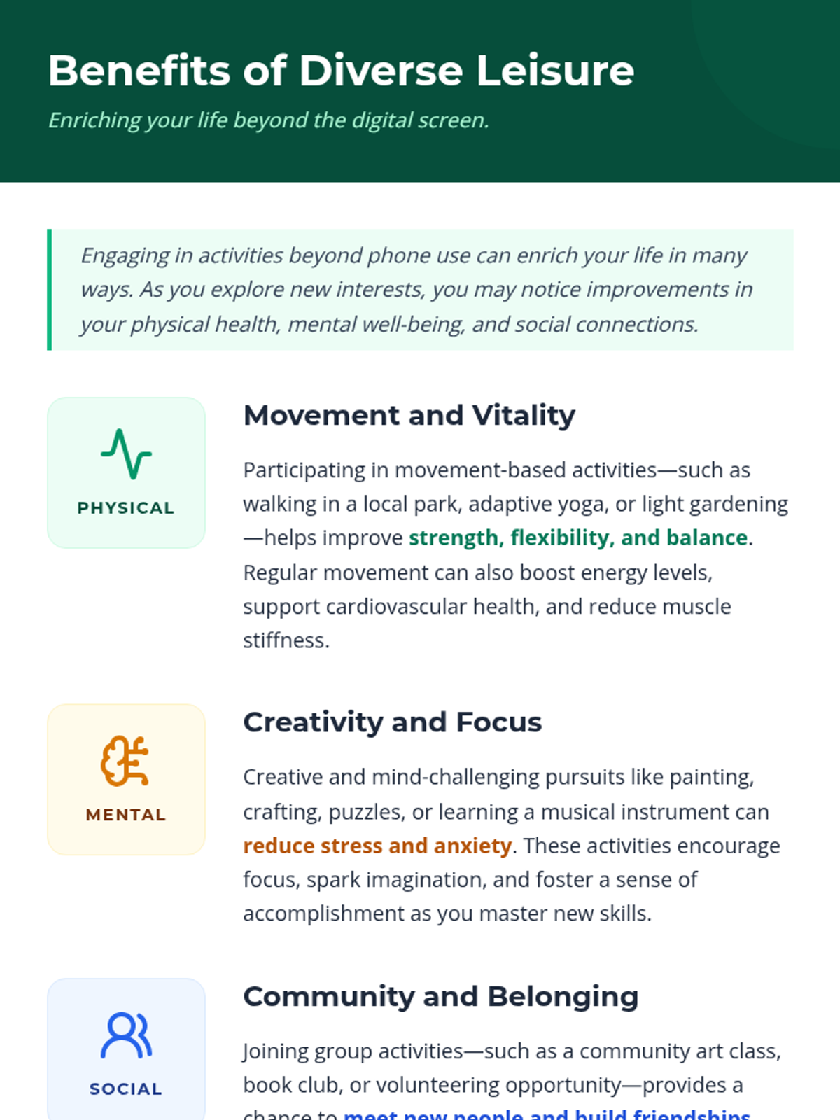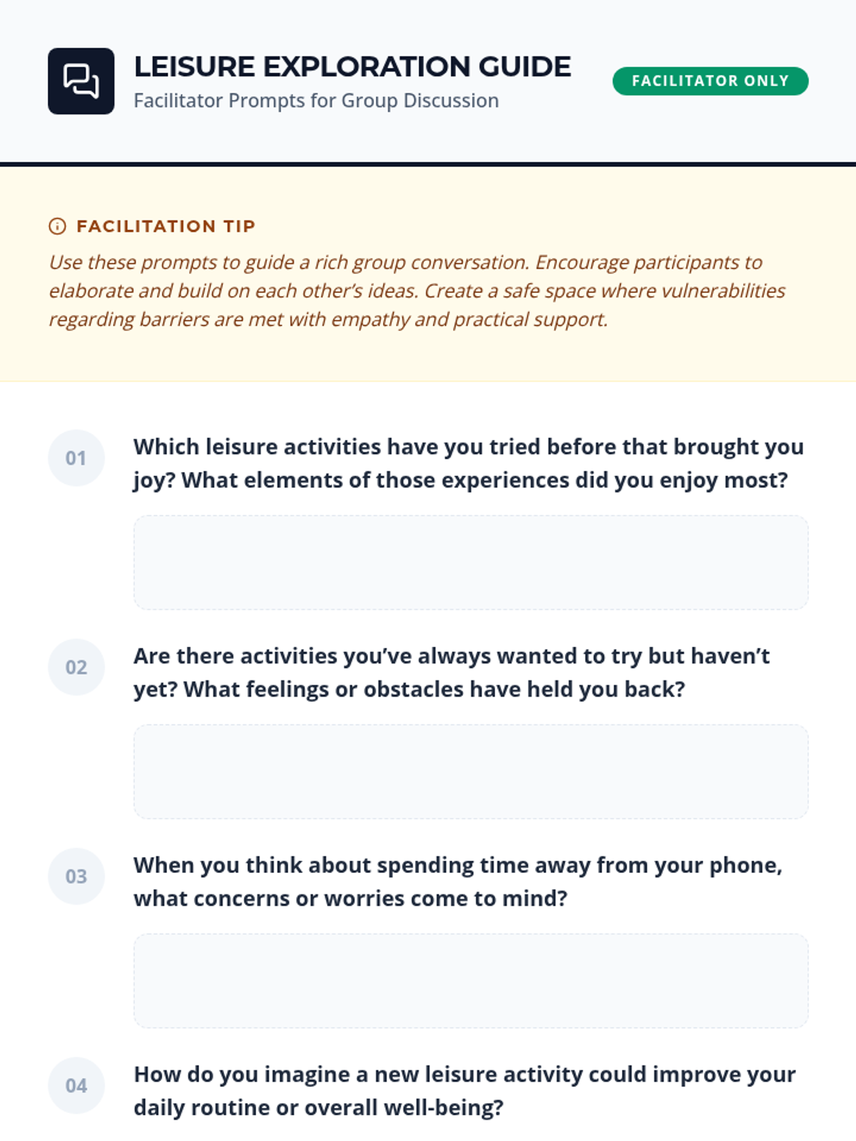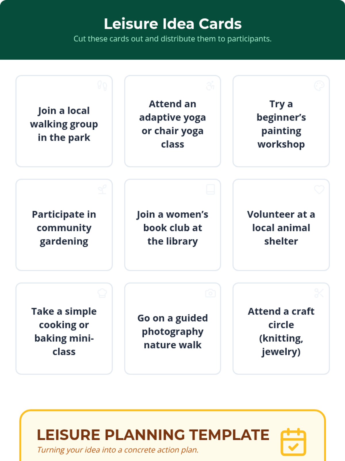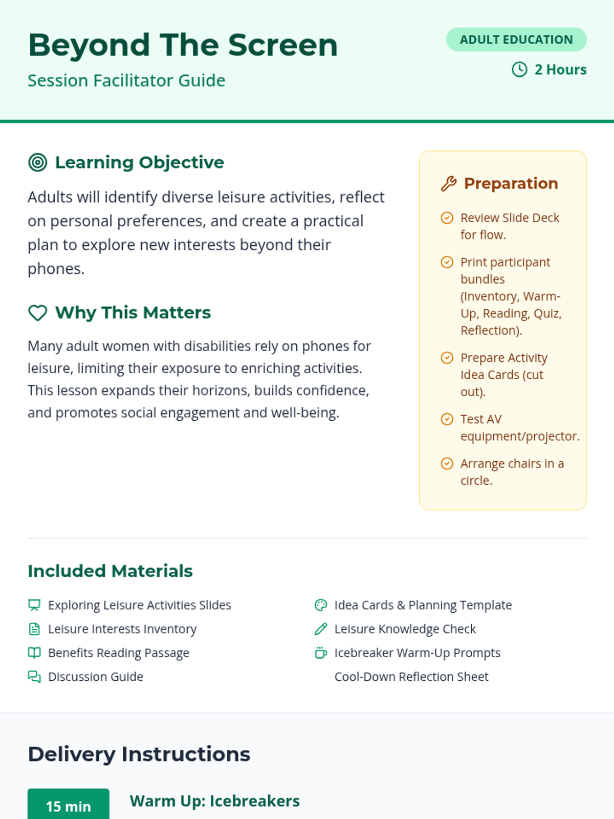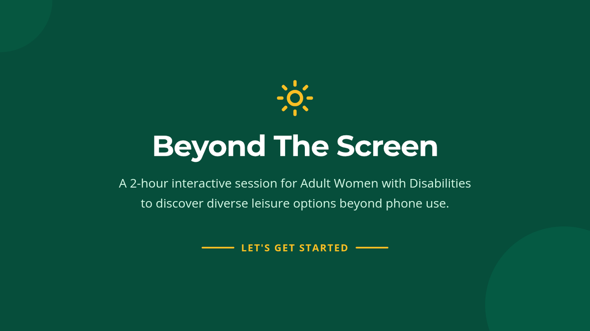 A 2-hour session for adult women with disabilities to discover enriching leisure activities beyond digital screens, fostering social connection and personal well-being through practical planning and reflection.