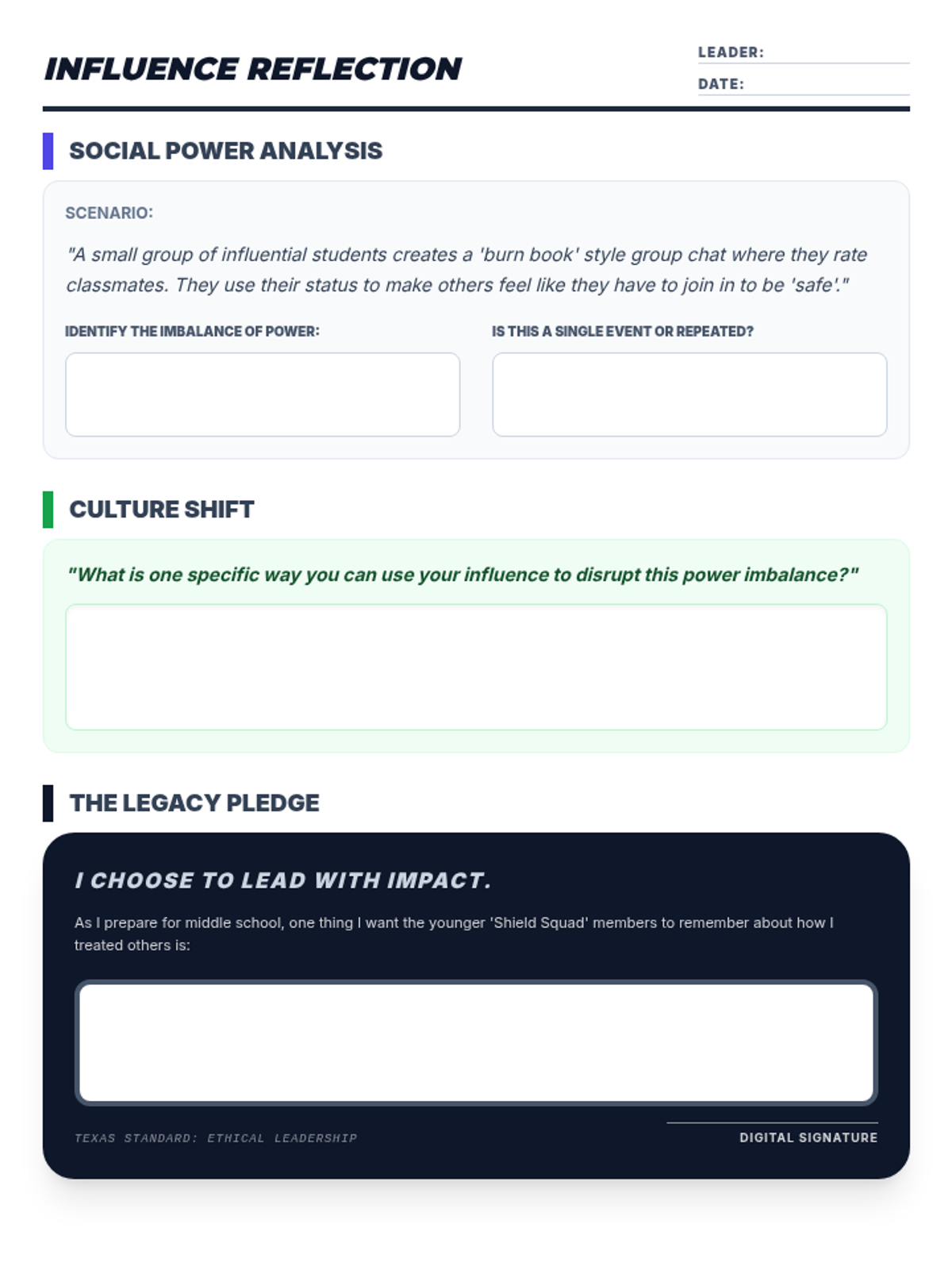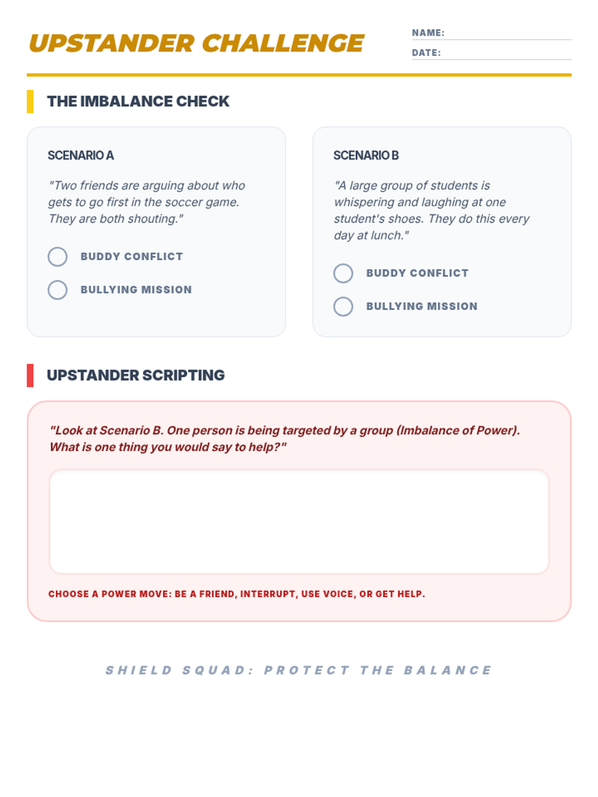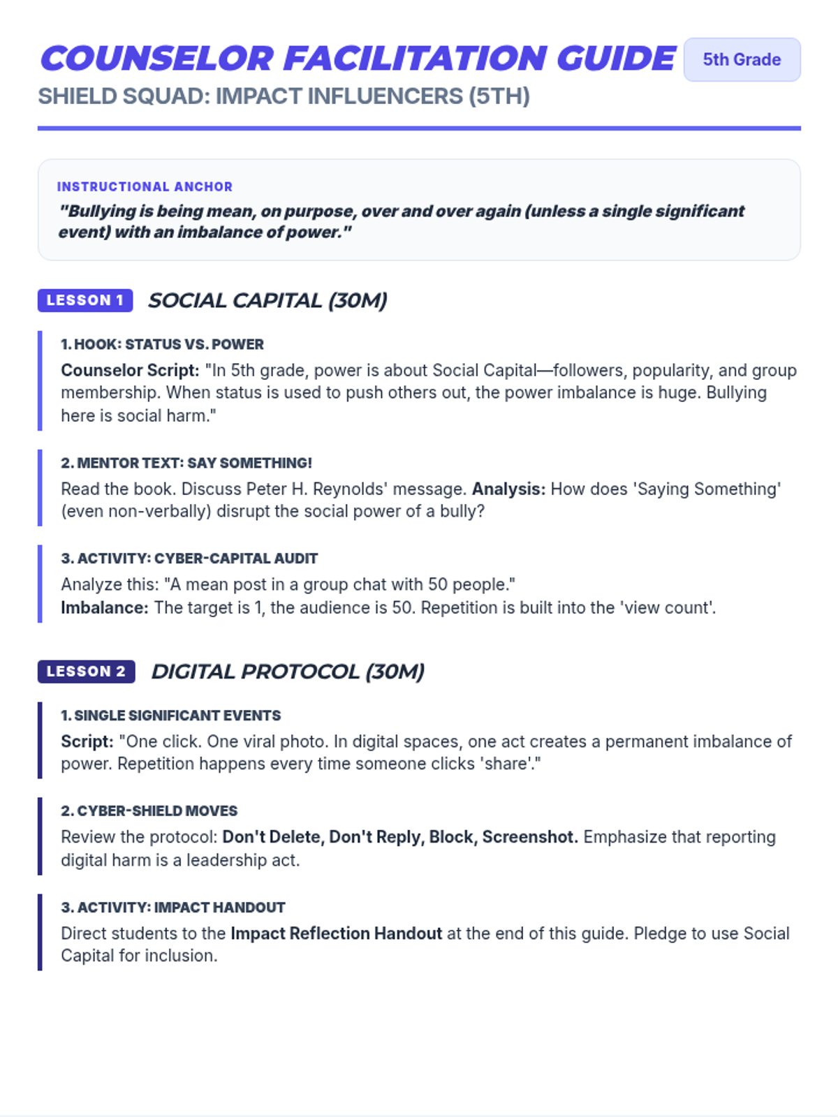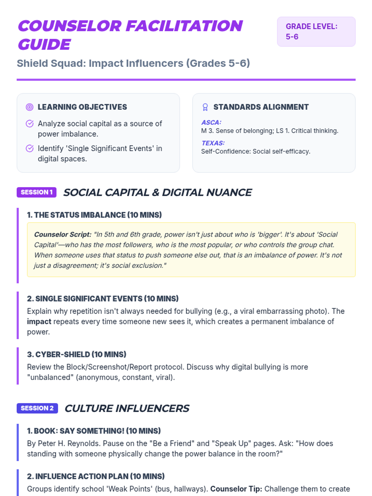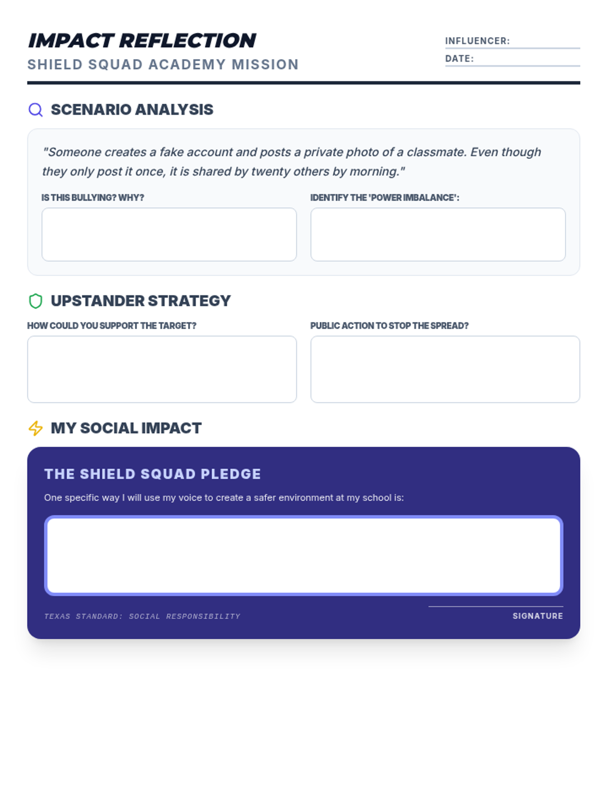 Upper elementary students explore the nuance of 'Single Significant Events' and cyberbullying. Using 'Say Something!', students reflect on their digital footprint and social influence, learning how to lead school-wide kindness initiatives.
