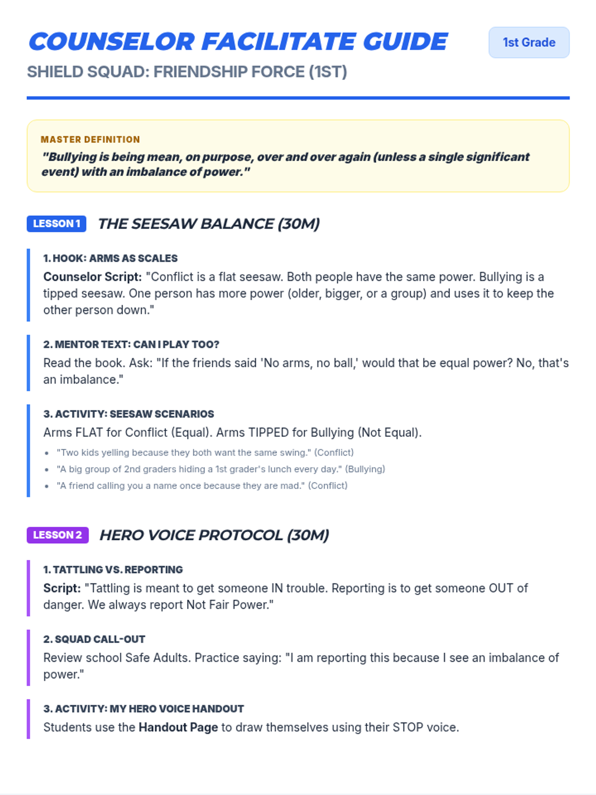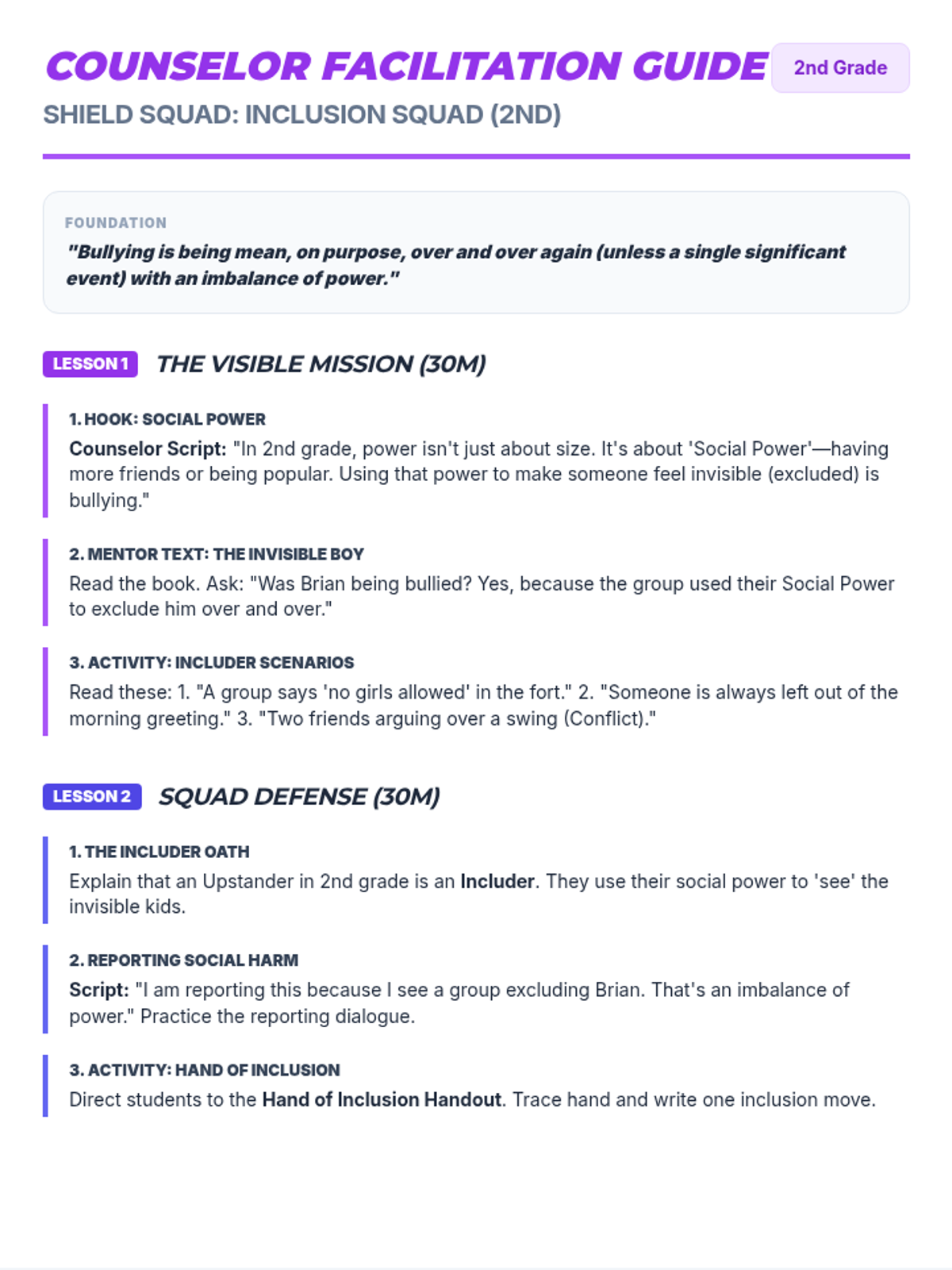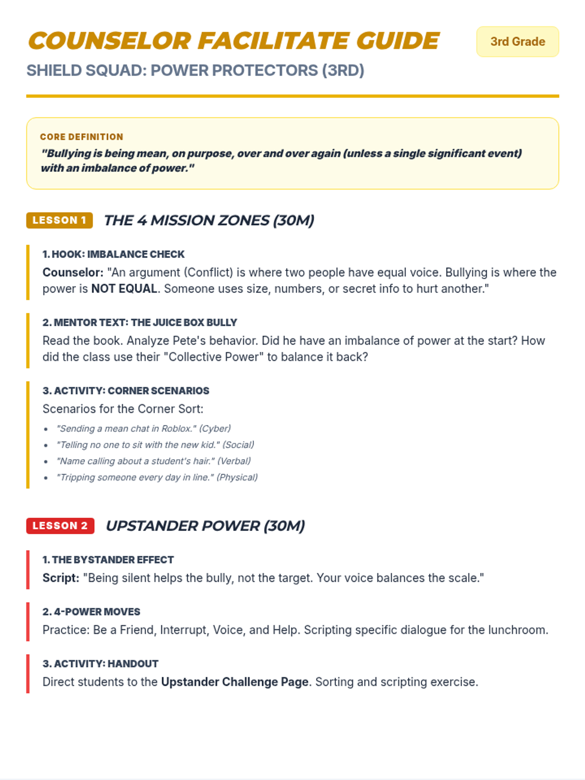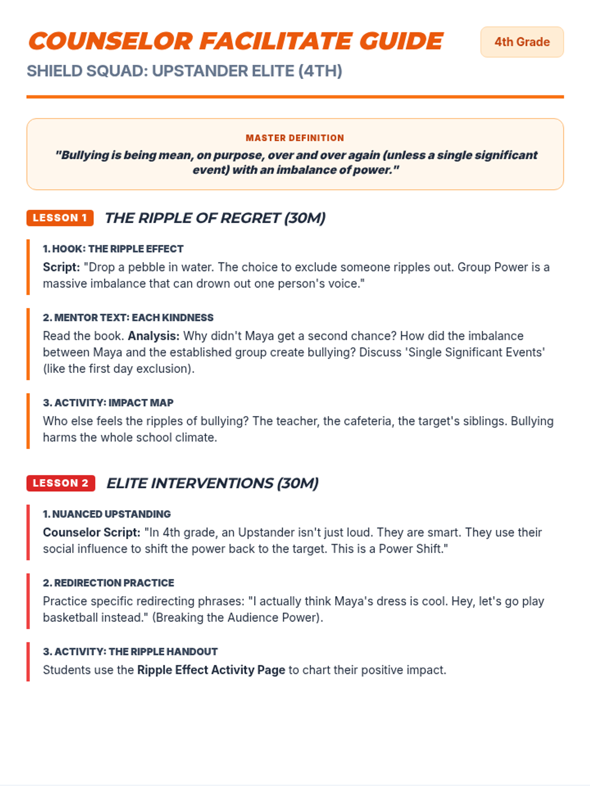 Two 30-minute sessions for 4th grade using 'Confessions of a Former Bully' by Trudy Ludwig to understand the roles in the bullying circle and practice specific 'Power Shift' strategies.