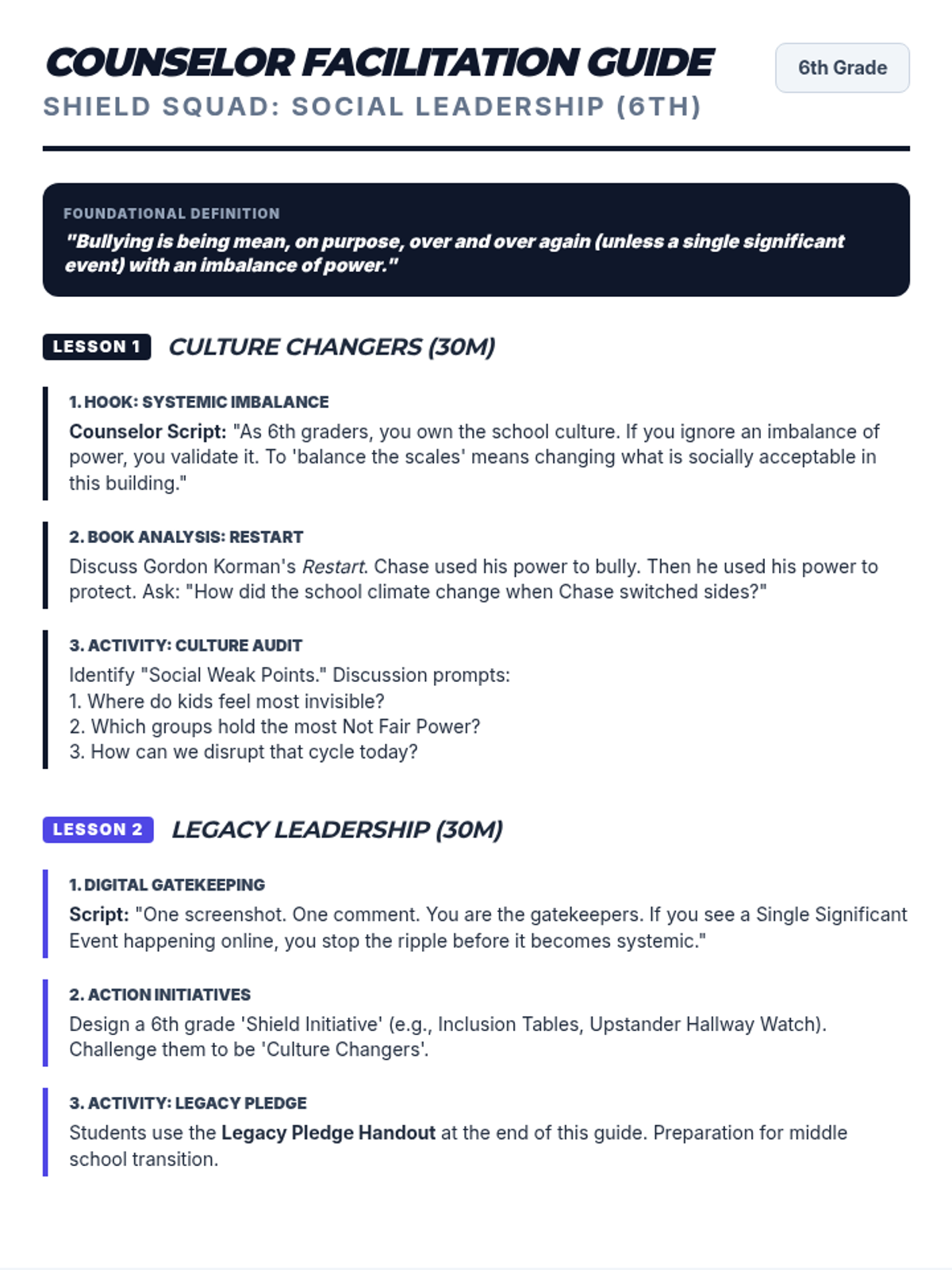 Two 30-minute sessions for 6th grade using concepts from 'Restart' by Gordon Korman to analyze social leadership, school-wide culture, and building a legacy of advocacy.