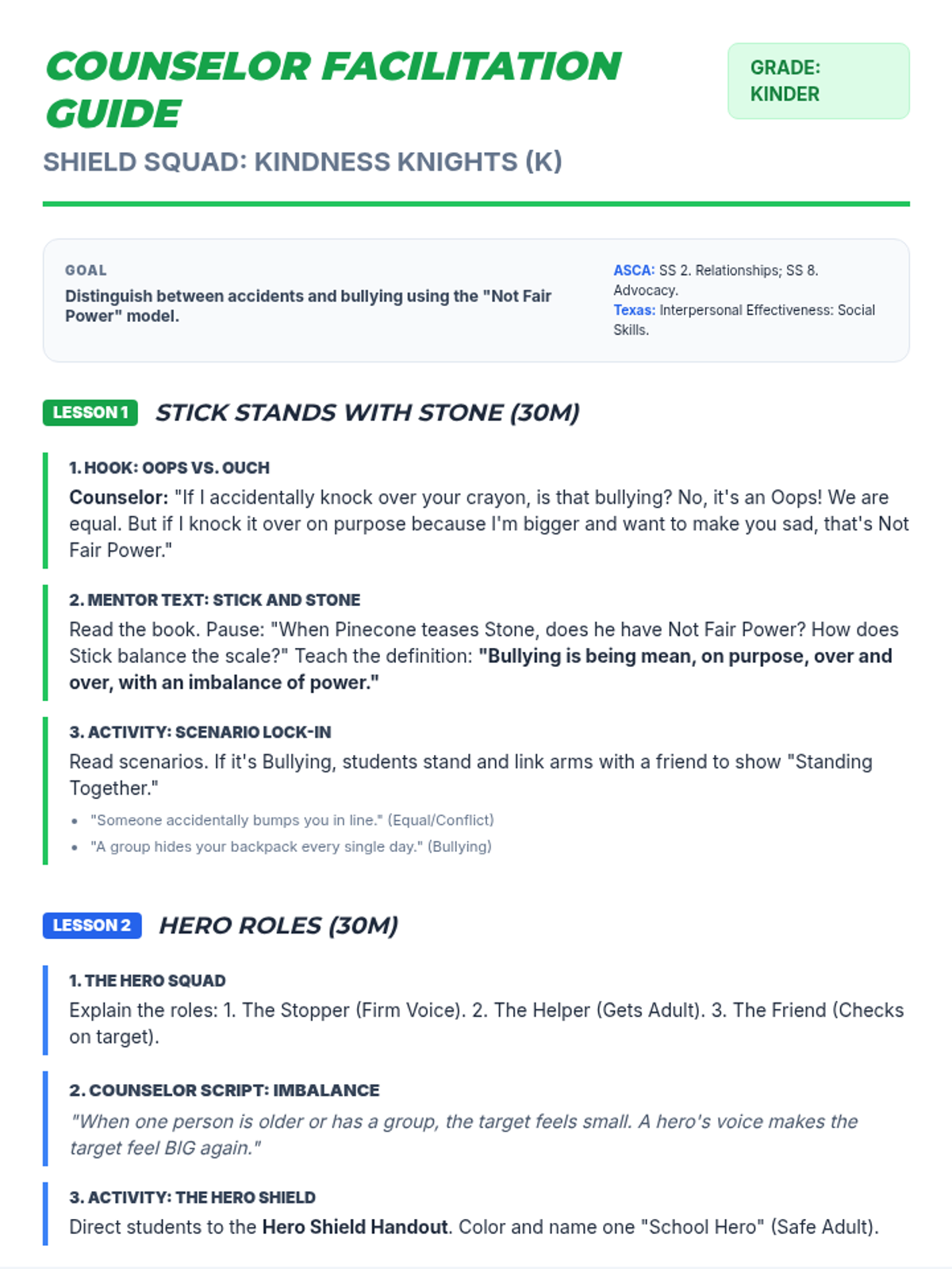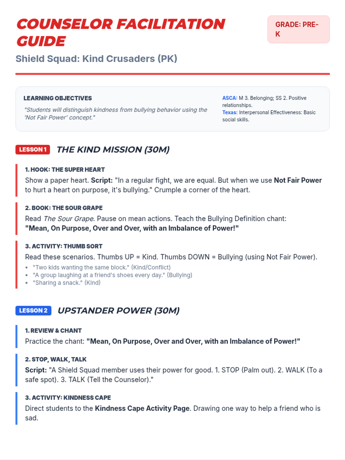 Two 30-minute sessions for Kindergarten using 'Bully B.E.A.N.S.' by Julia Cook to distinguish between accidents and bullying, and to practice the 'Stop, Walk, Talk' strategy.