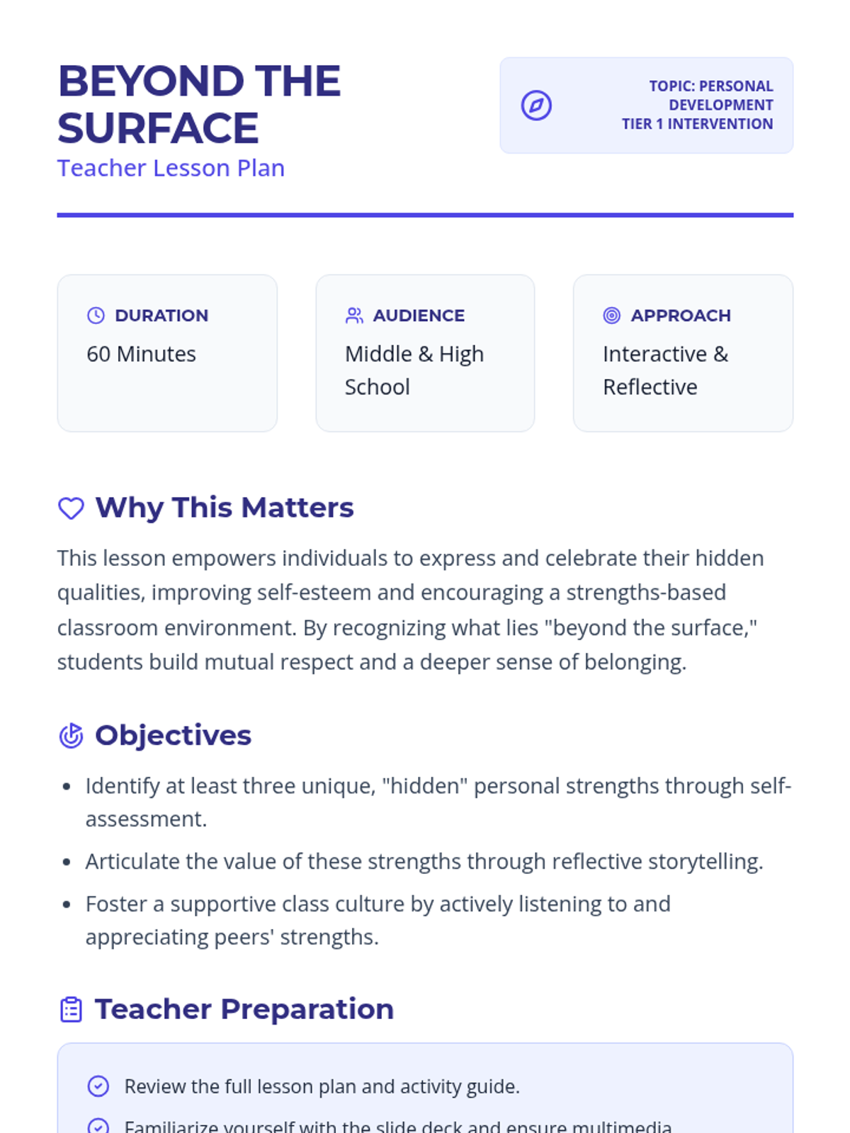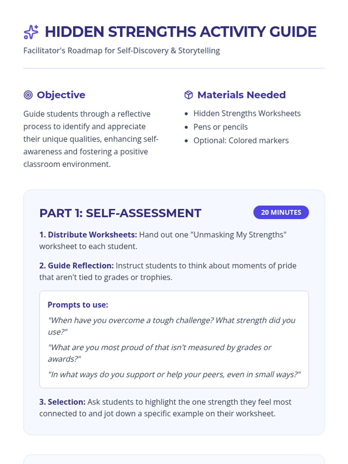 A lesson focused on self-discovery and appreciation of unique, often overlooked personal qualities. Students engage in reflective self-assessment and group storytelling to build self-awareness and a positive classroom culture.