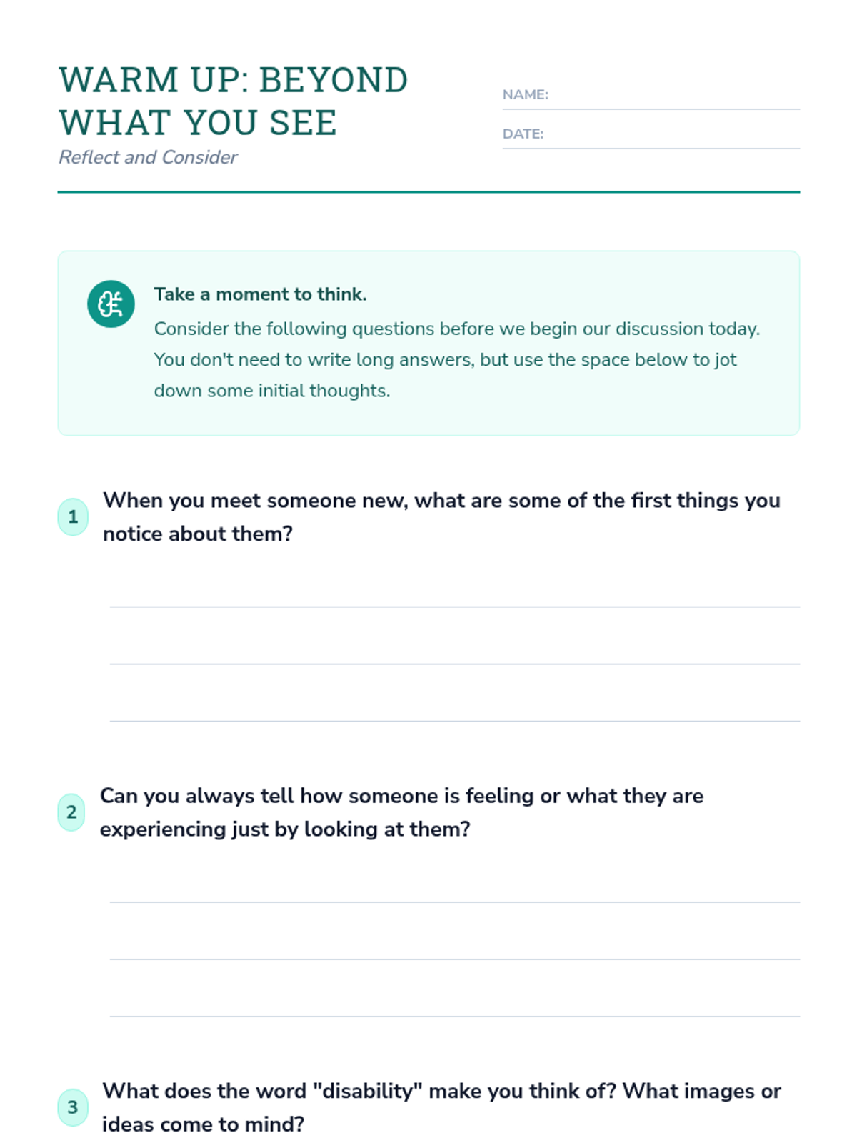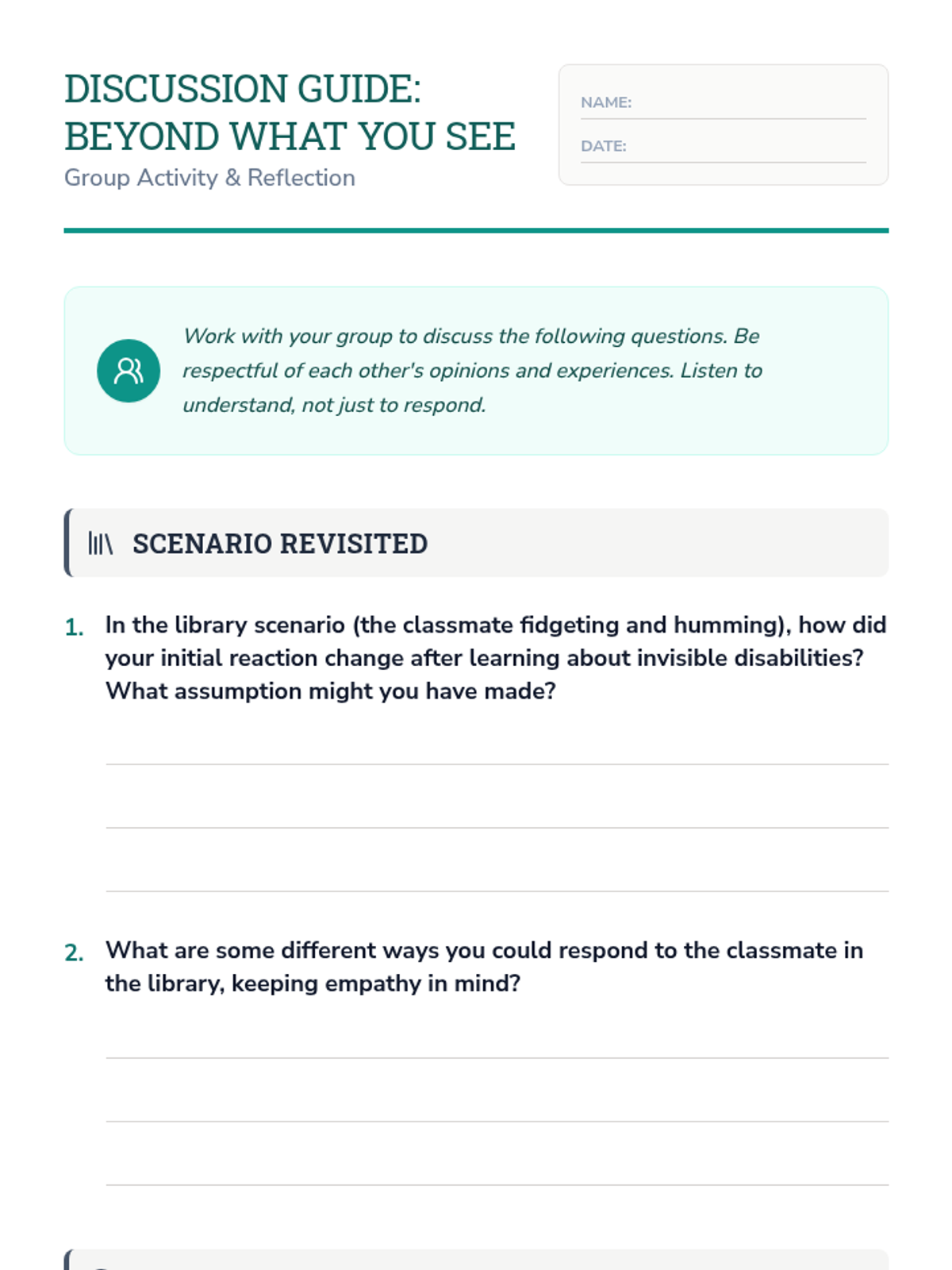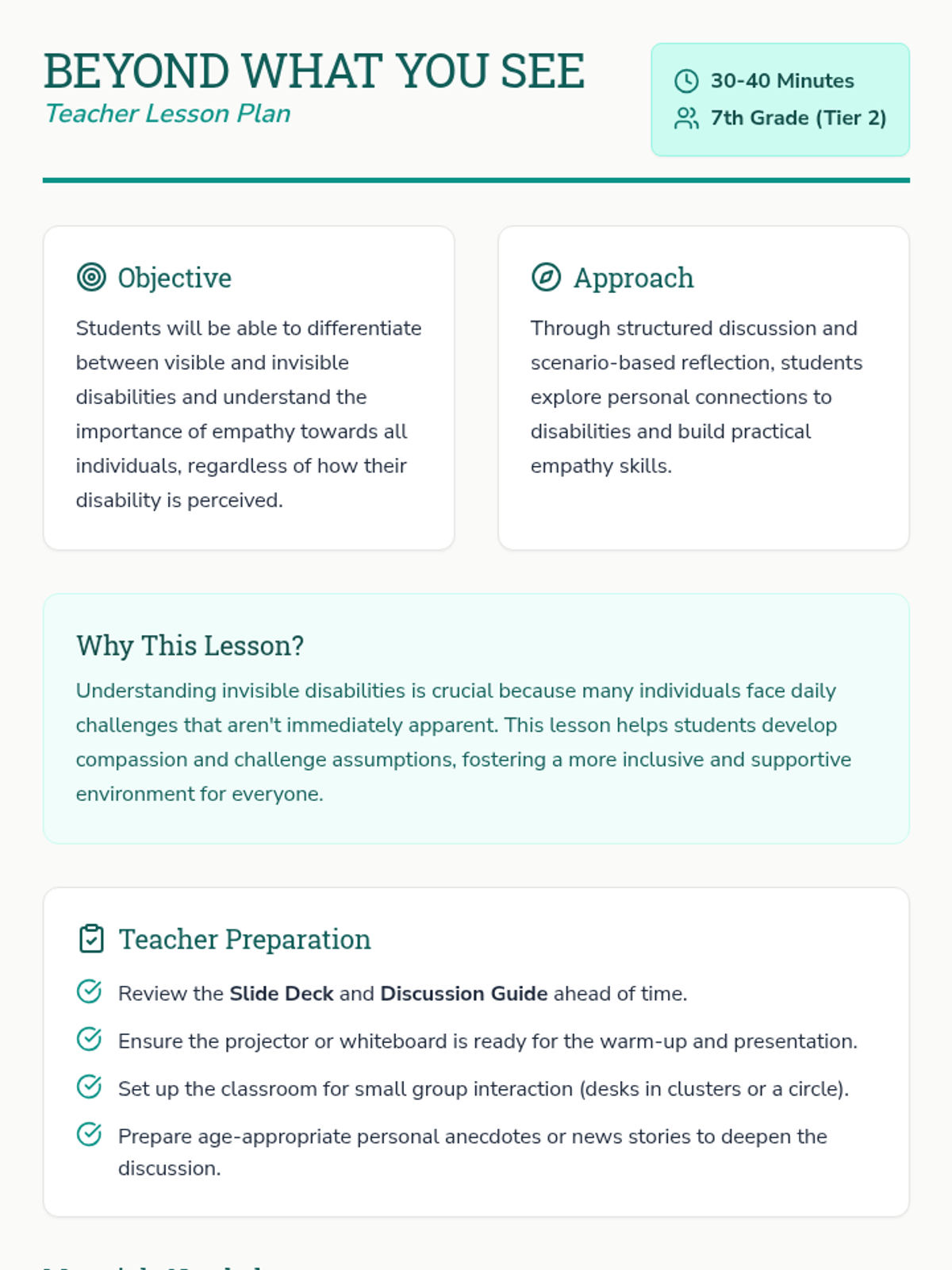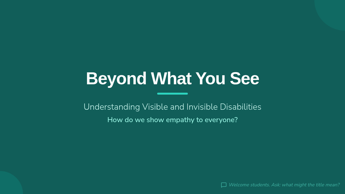 A 7th-grade Tier 2 lesson exploring visible and invisible disabilities to build empathy and challenge assumptions. Students analyze scenarios and discuss the impact of hidden challenges.