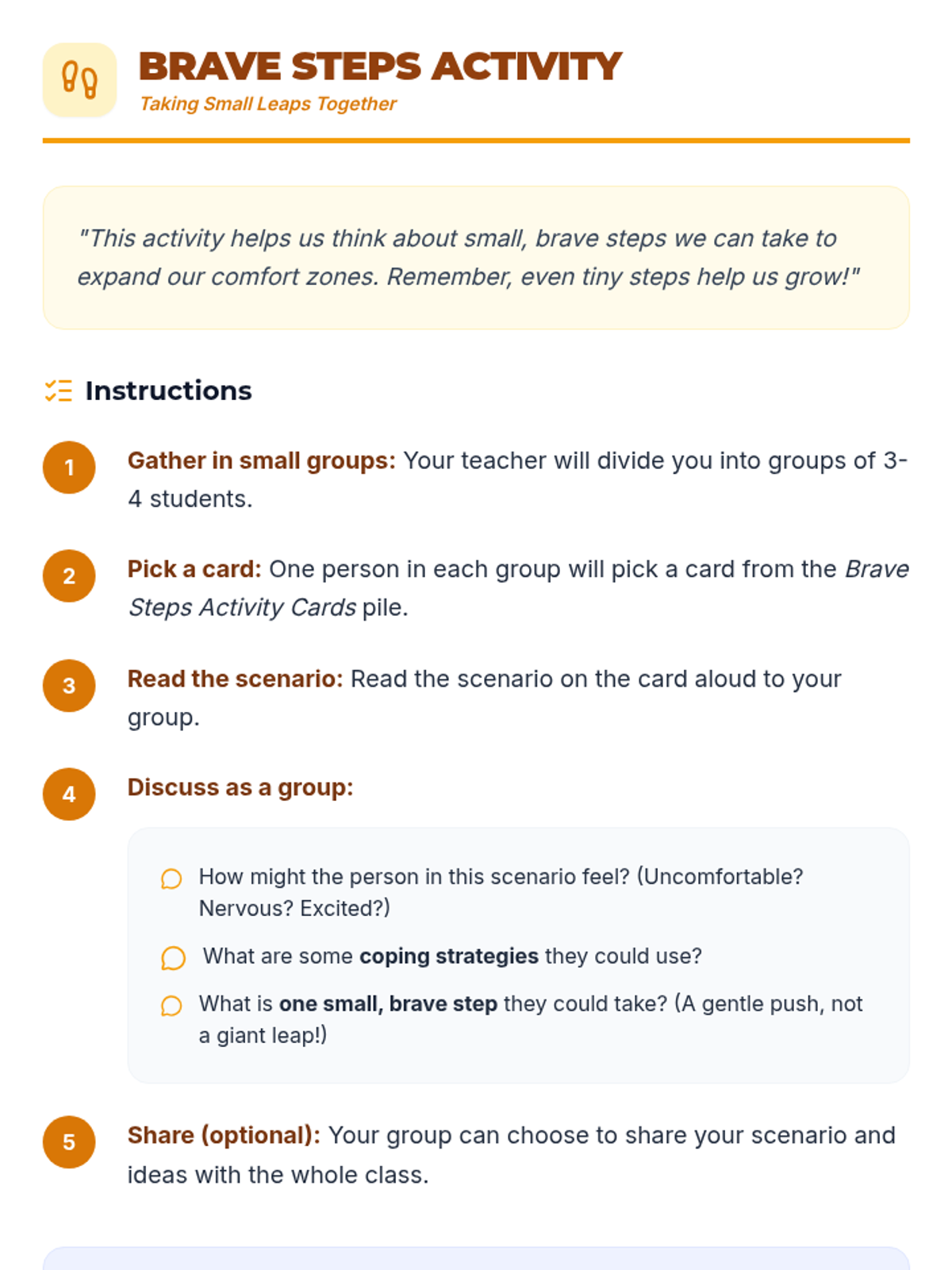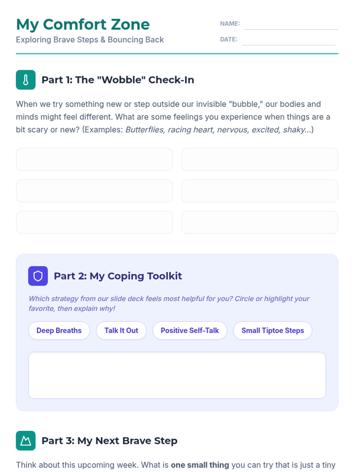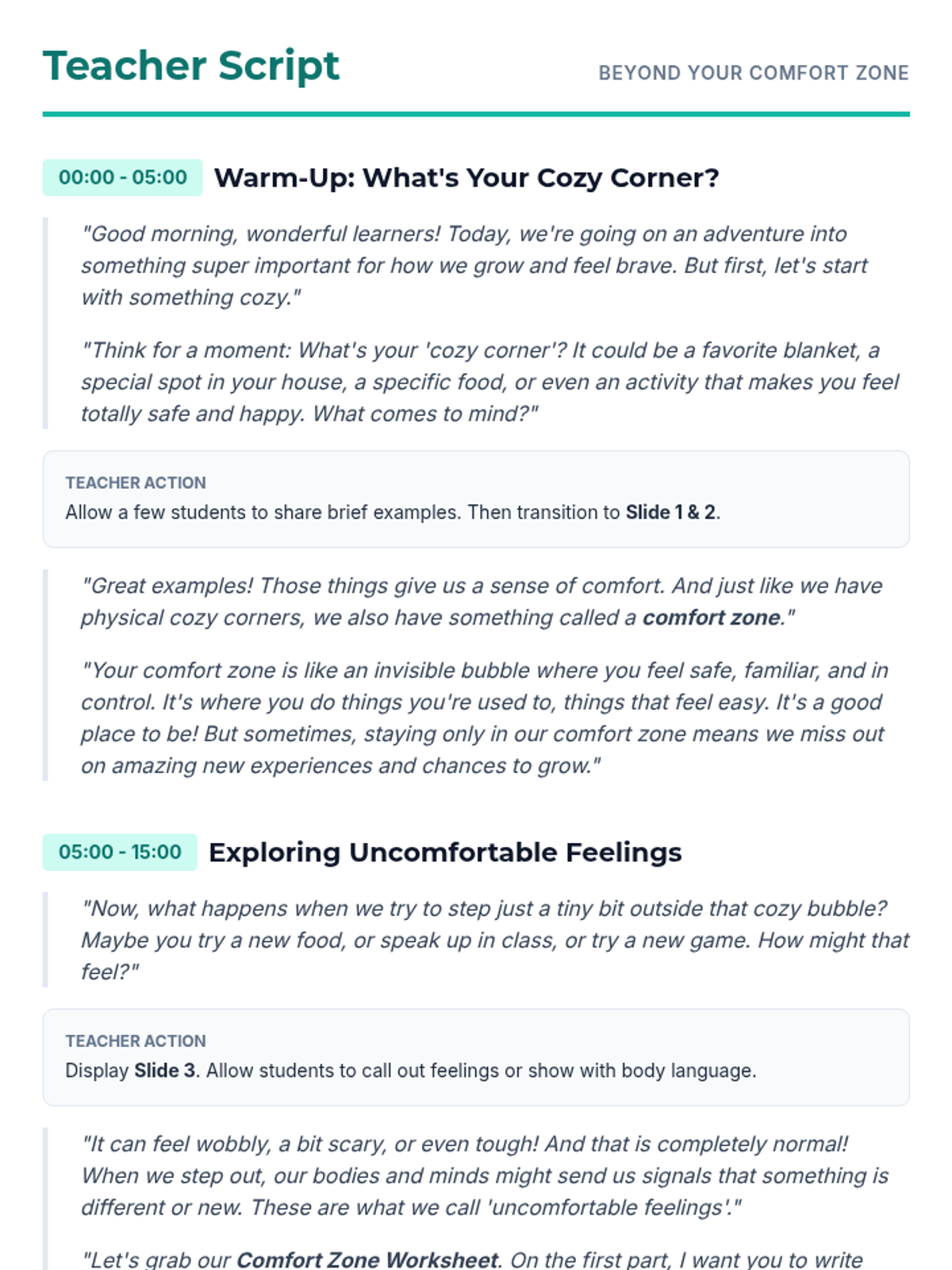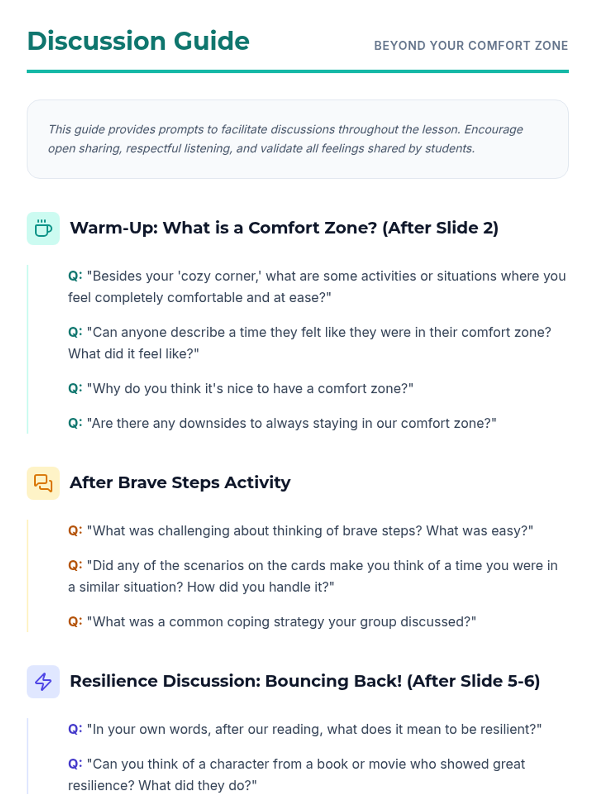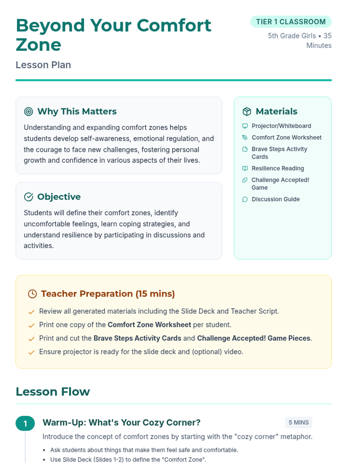 A 35-minute lesson for 5th-grade girls focused on identifying comfort zones, managing uncomfortable feelings, and building resilience through interactive activities.