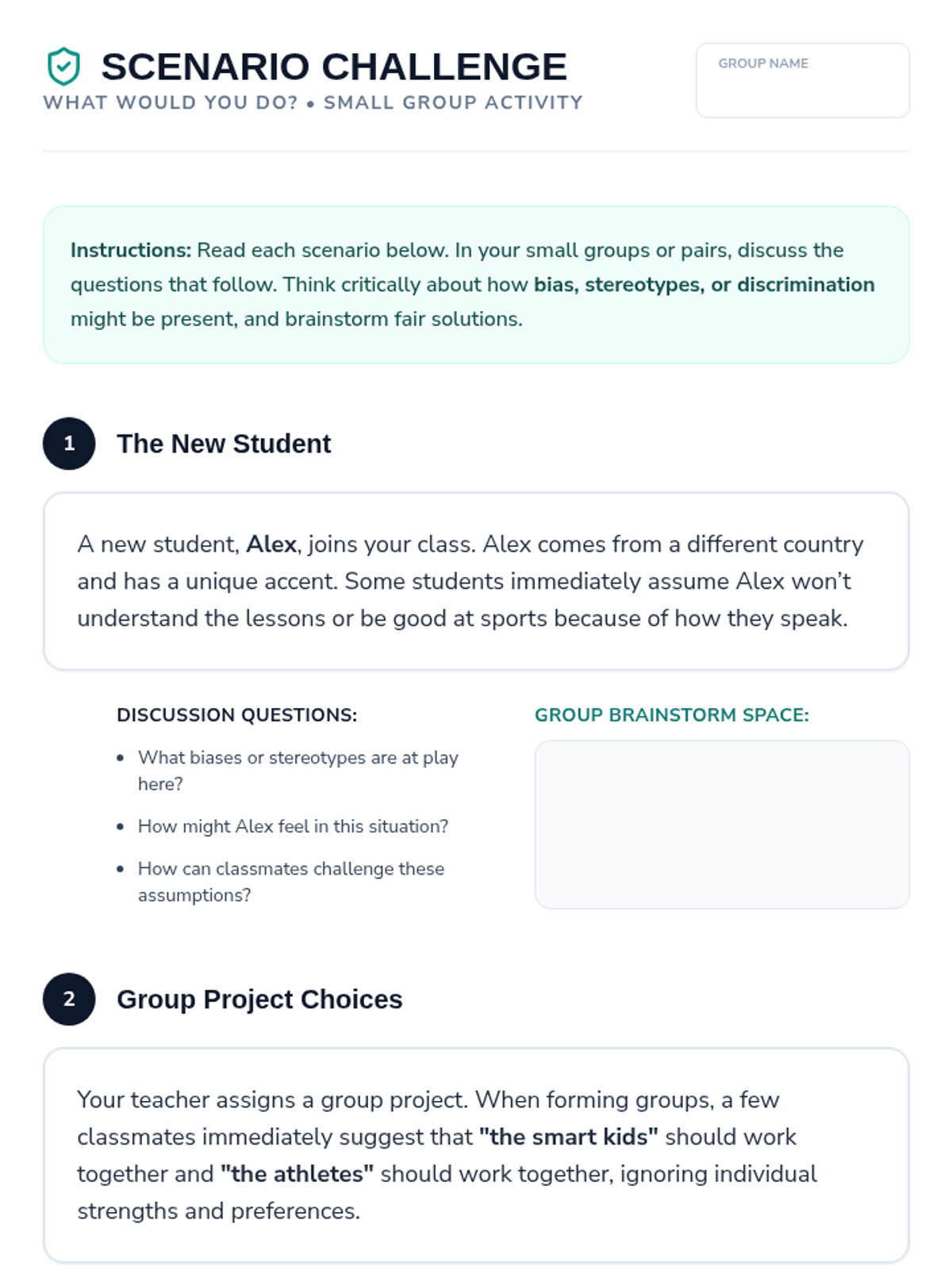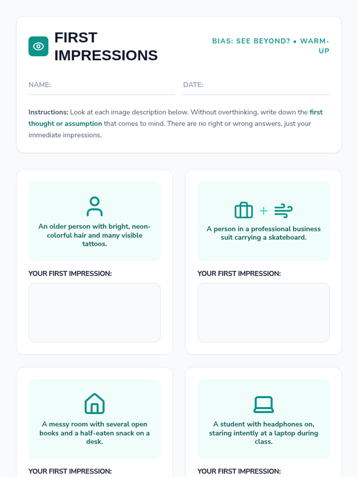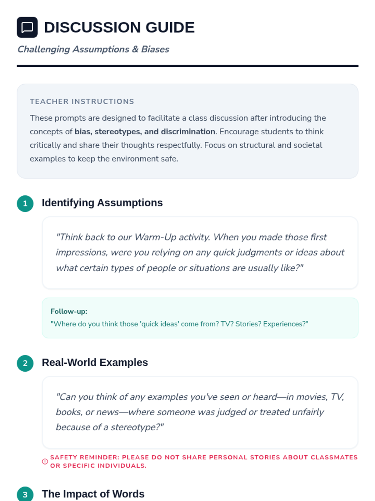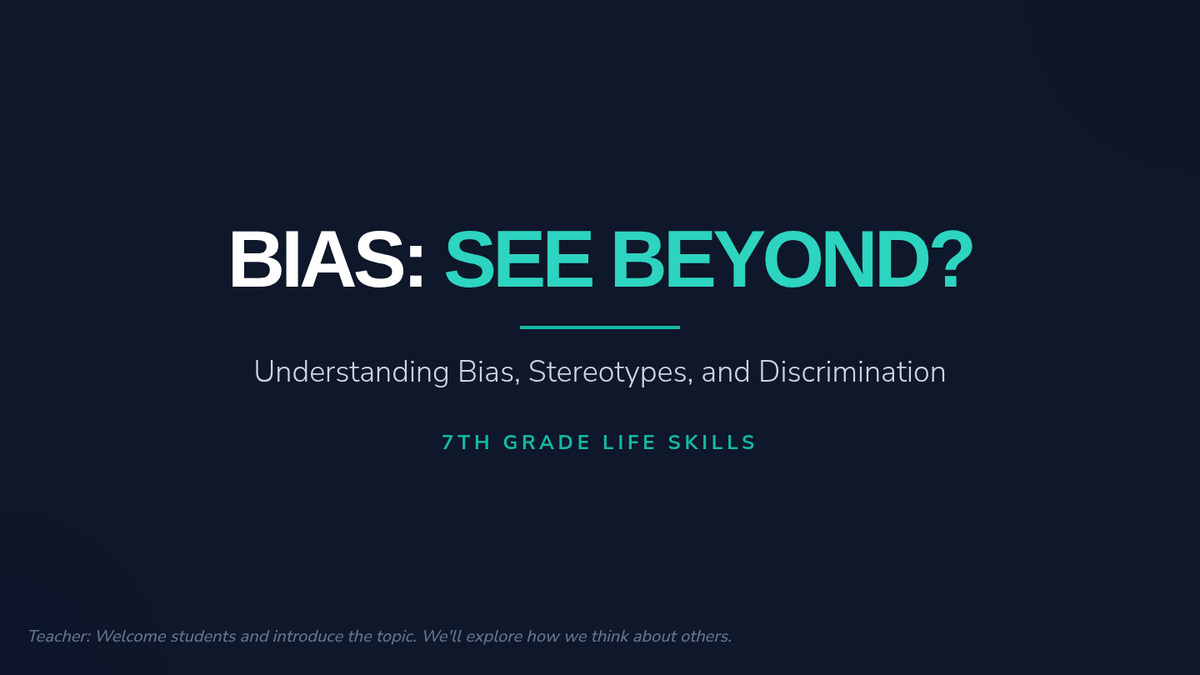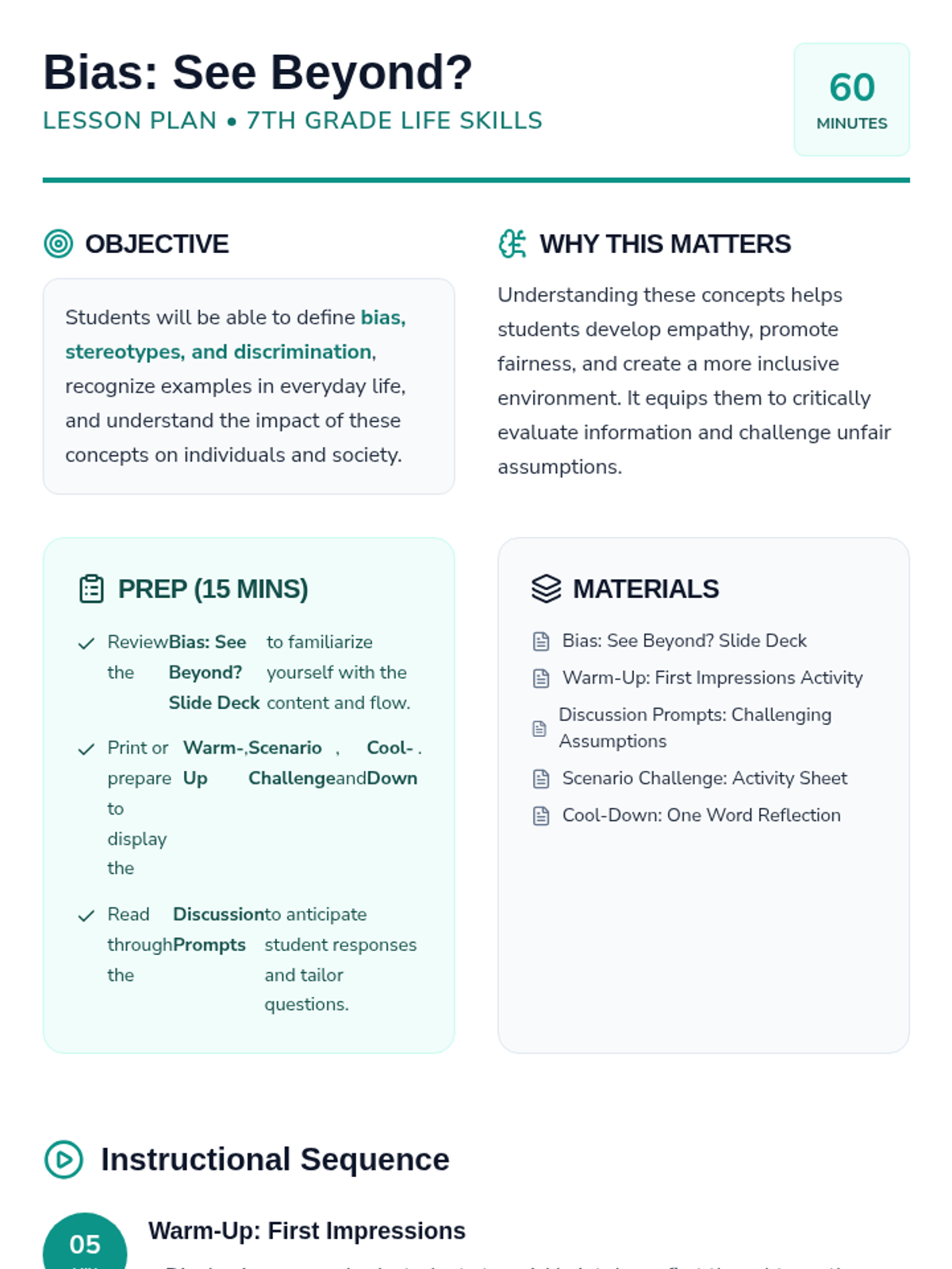 This lesson introduces 7th-grade students to the concepts of bias, stereotypes, and discrimination, fostering critical thinking about how these issues impact daily life. Students will learn to identify and challenge preconceived notions and promote a more inclusive environment.