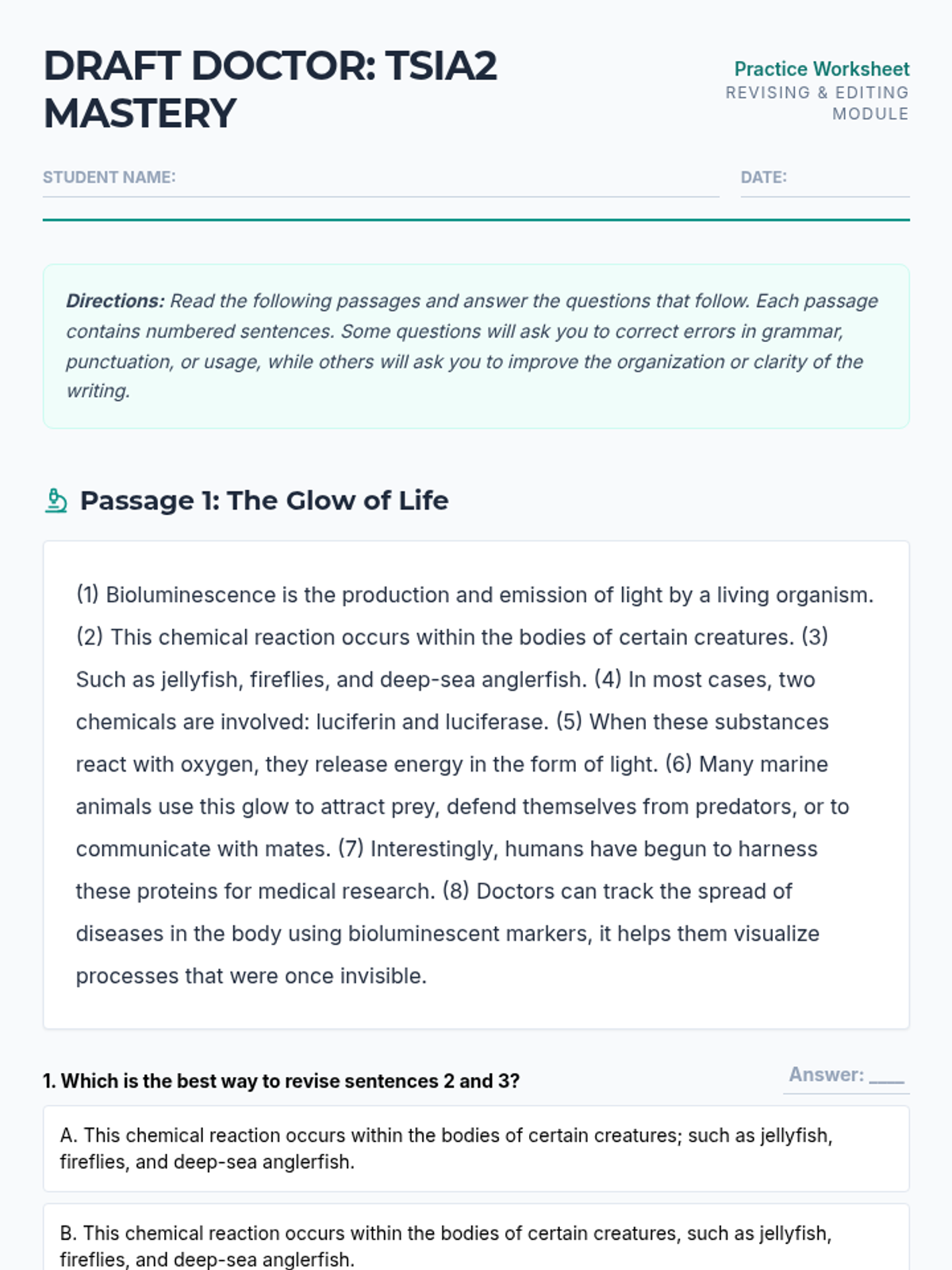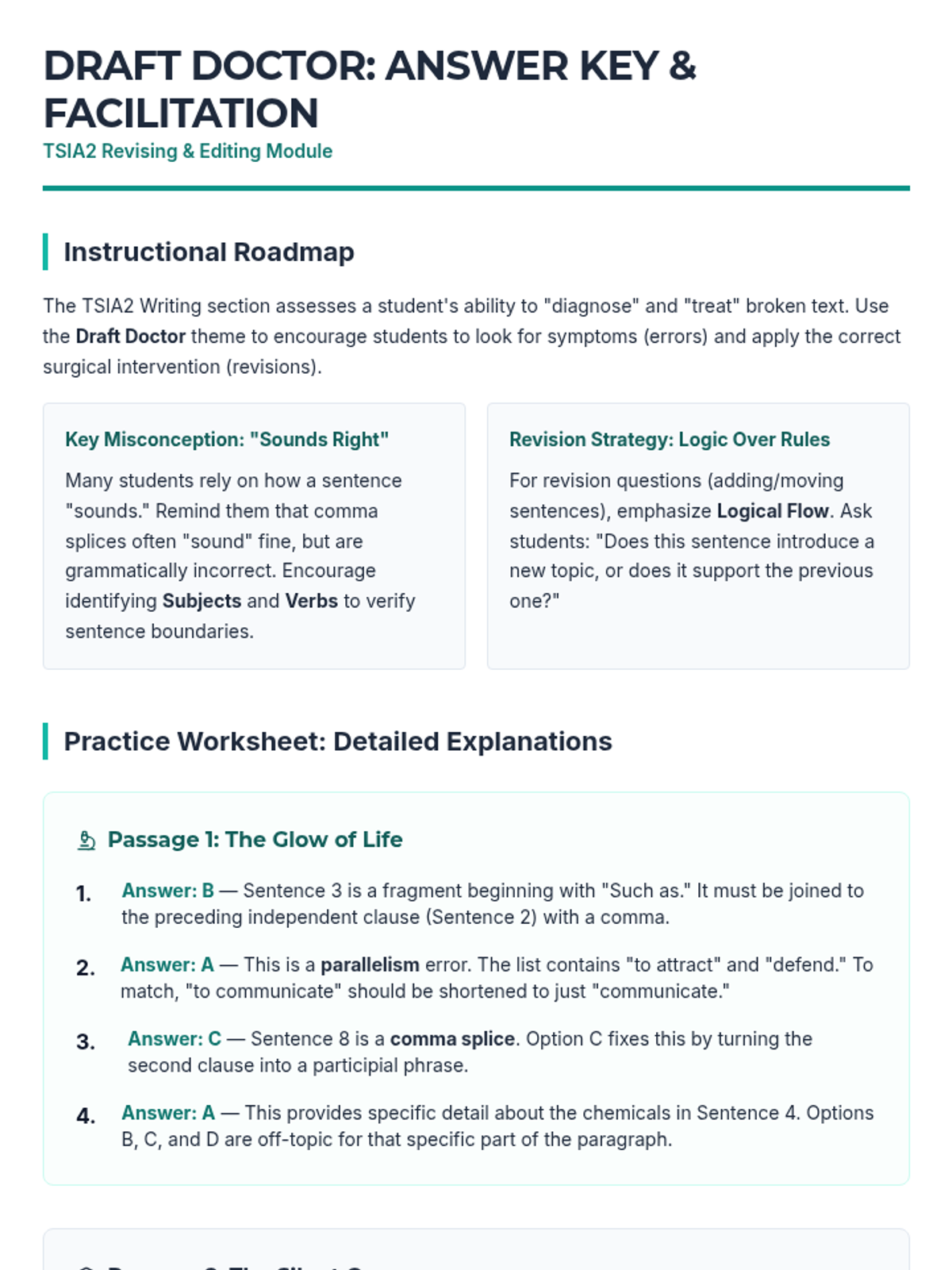 A comprehensive prep lesson for the TSIA2 Writing section, covering sentence structure, agreement, punctuation, and revision strategies across multiple passage genres.
