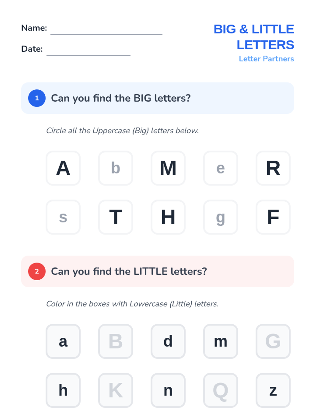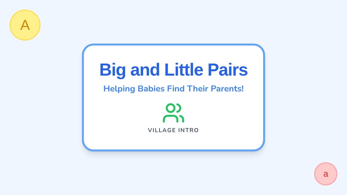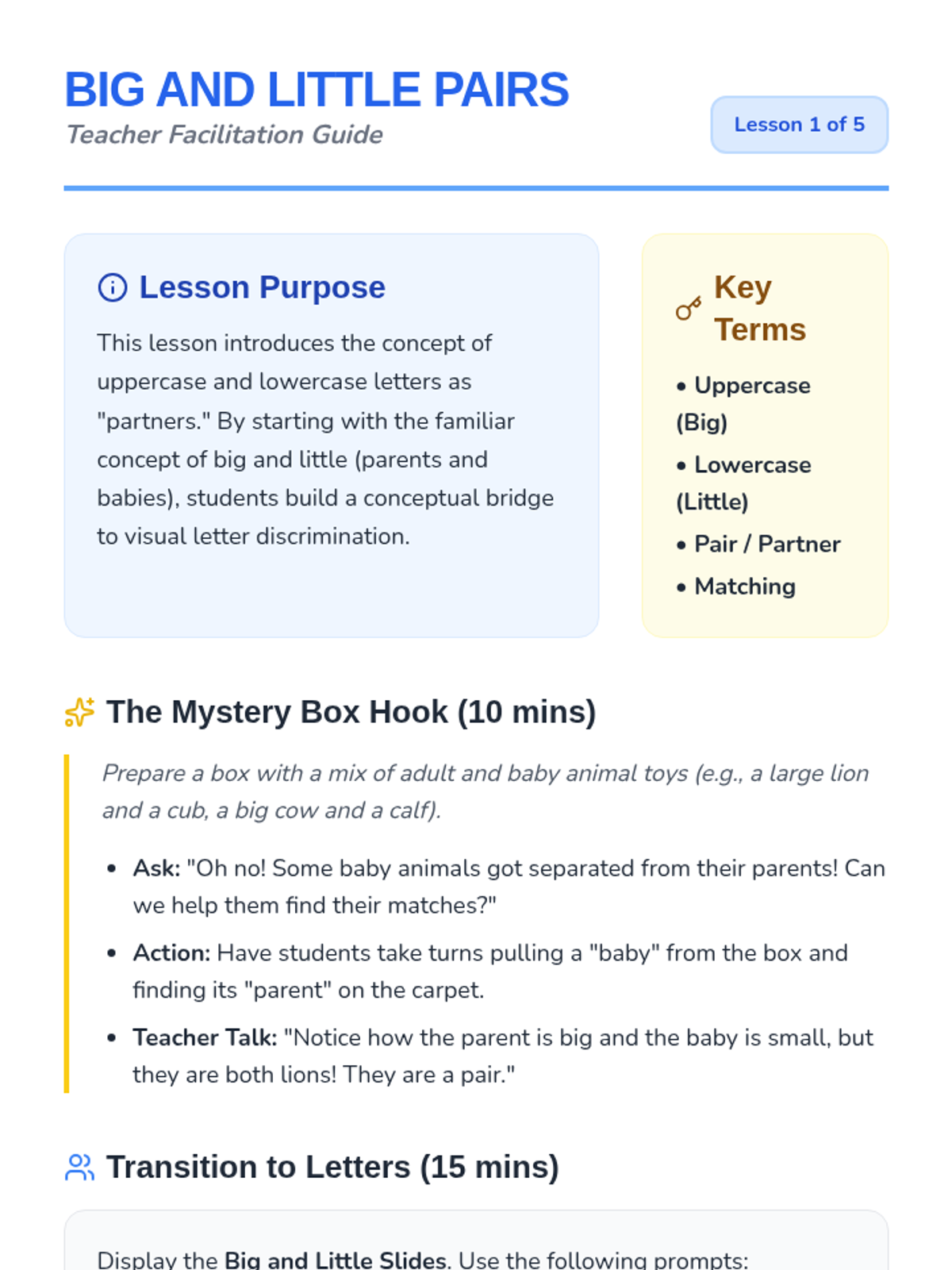 Students explore the concept of big and little pairs using animal parents and babies before transitioning to uppercase and lowercase letter cards.