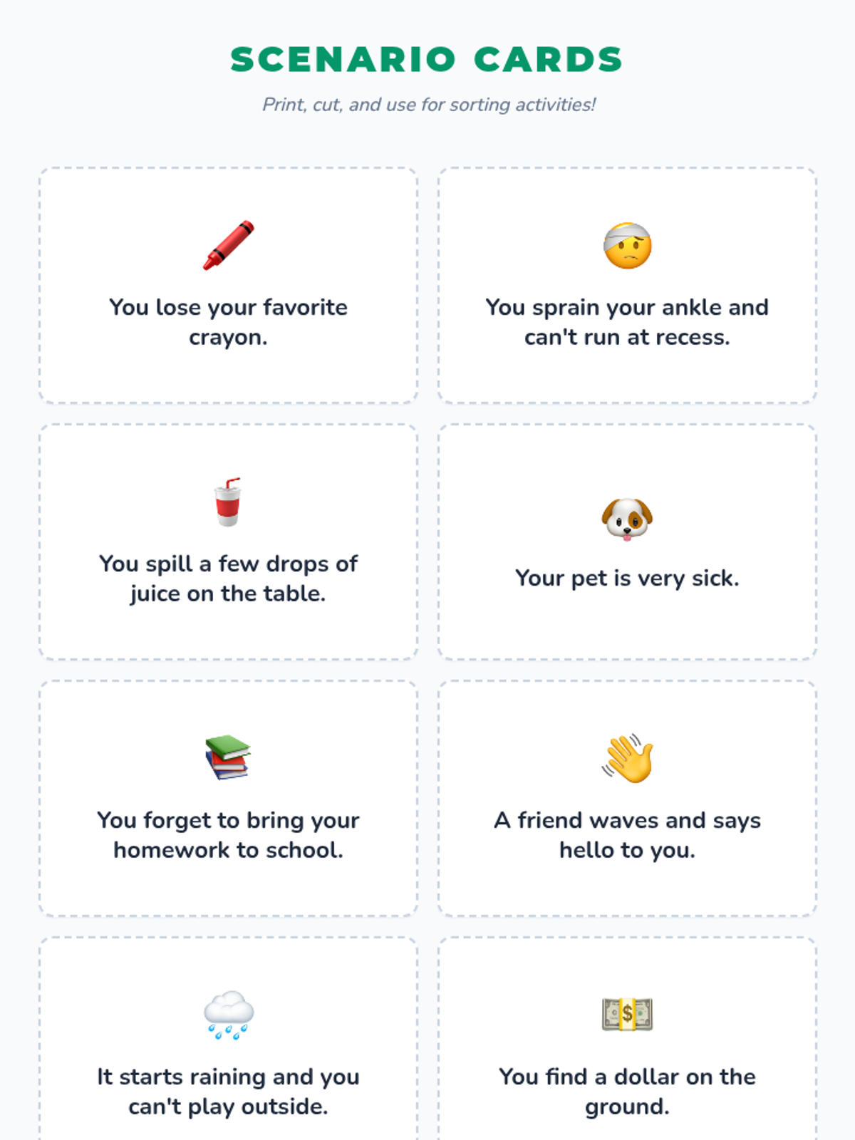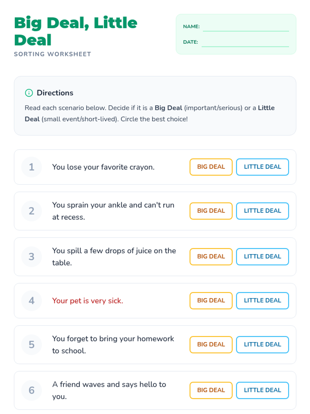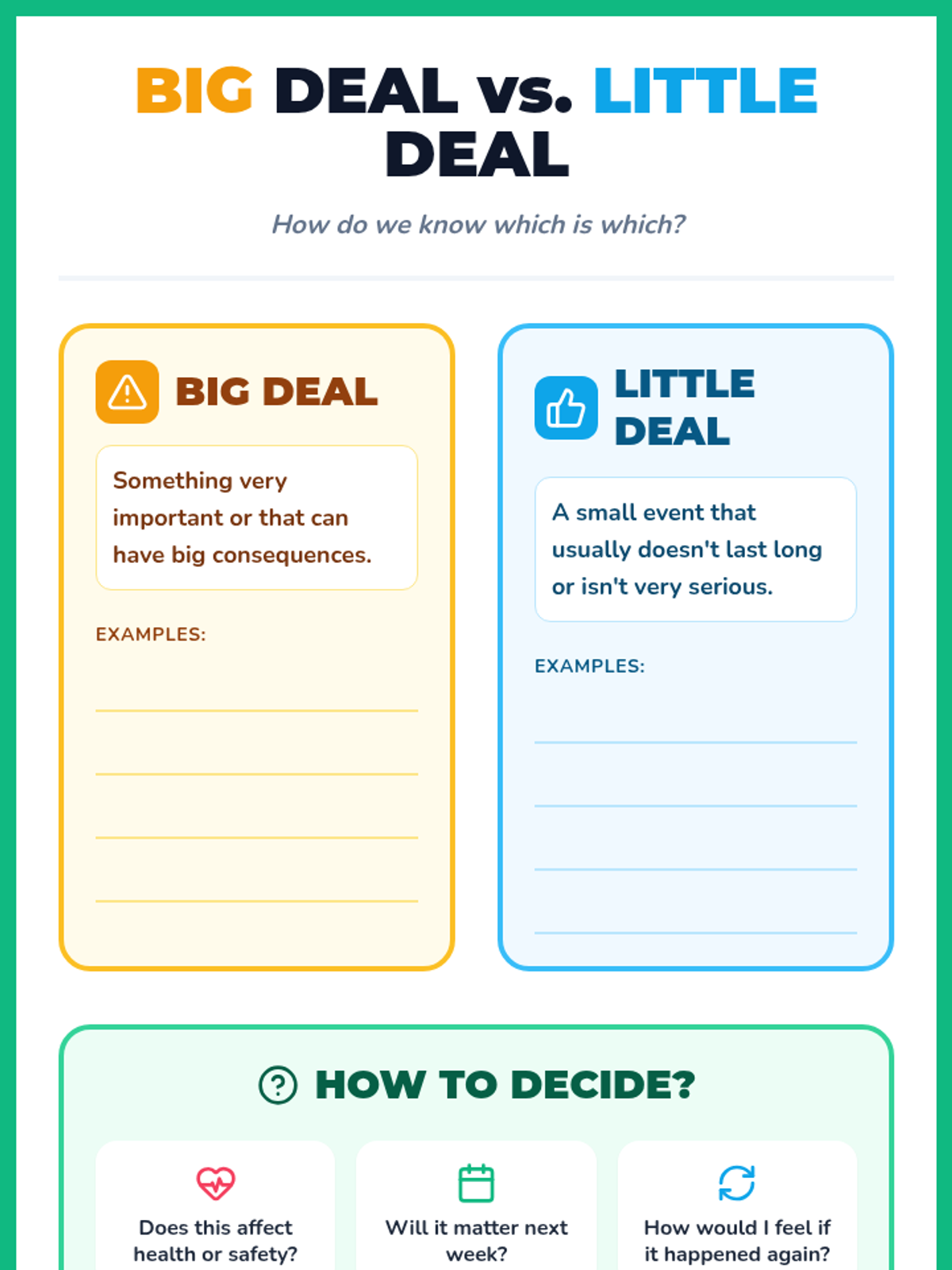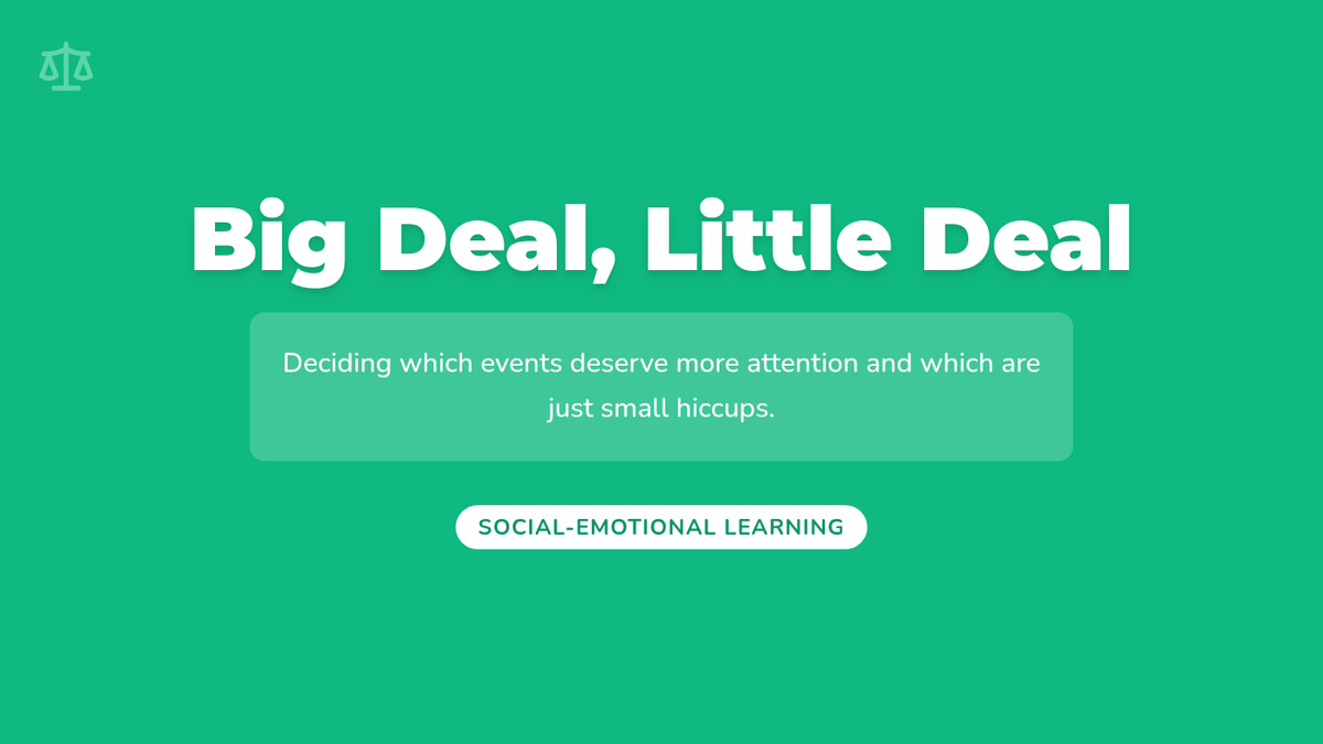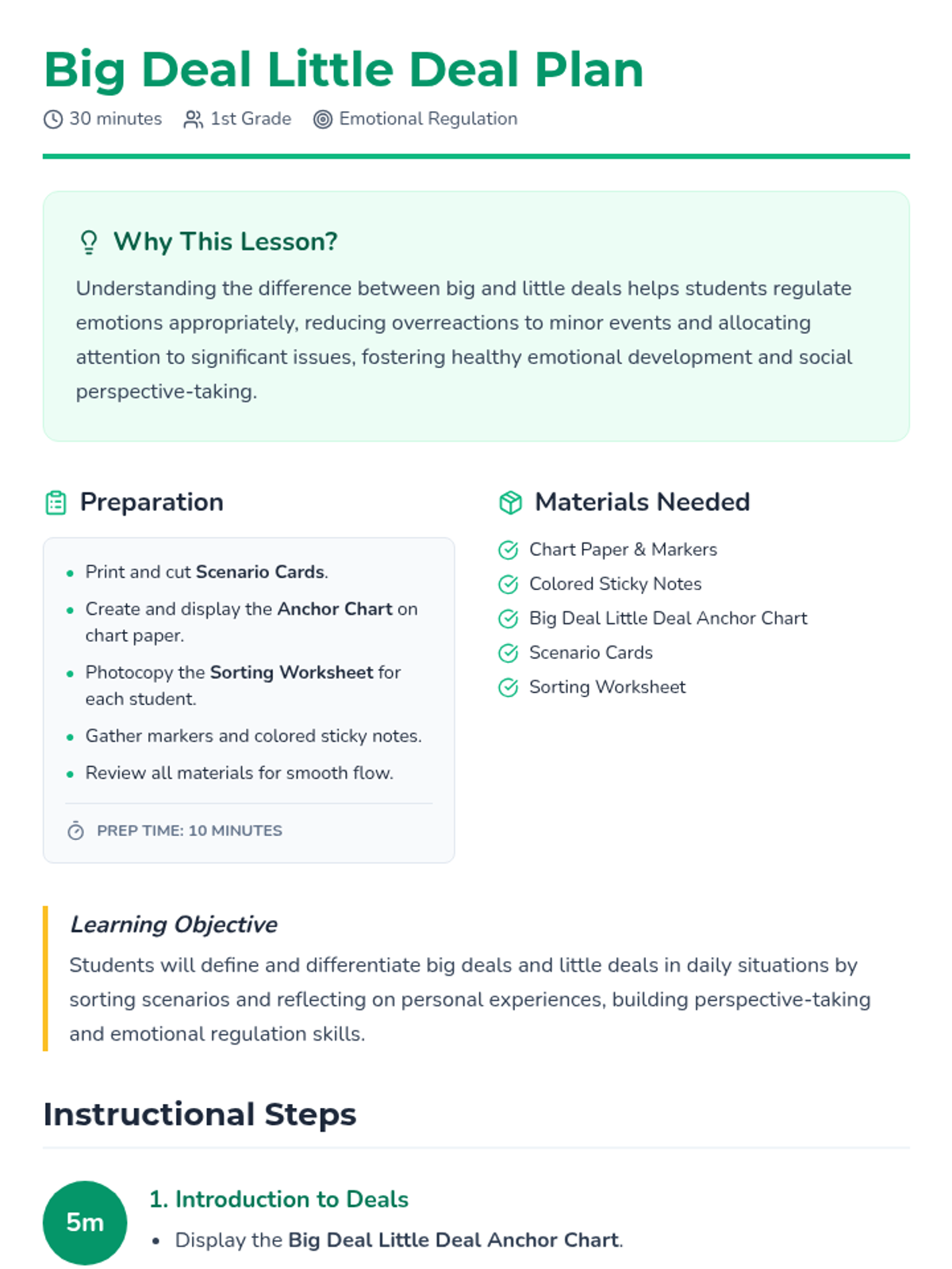 A 30-minute lesson for 1st graders to distinguish between big deals and little deals, building perspective-taking and emotional regulation skills.